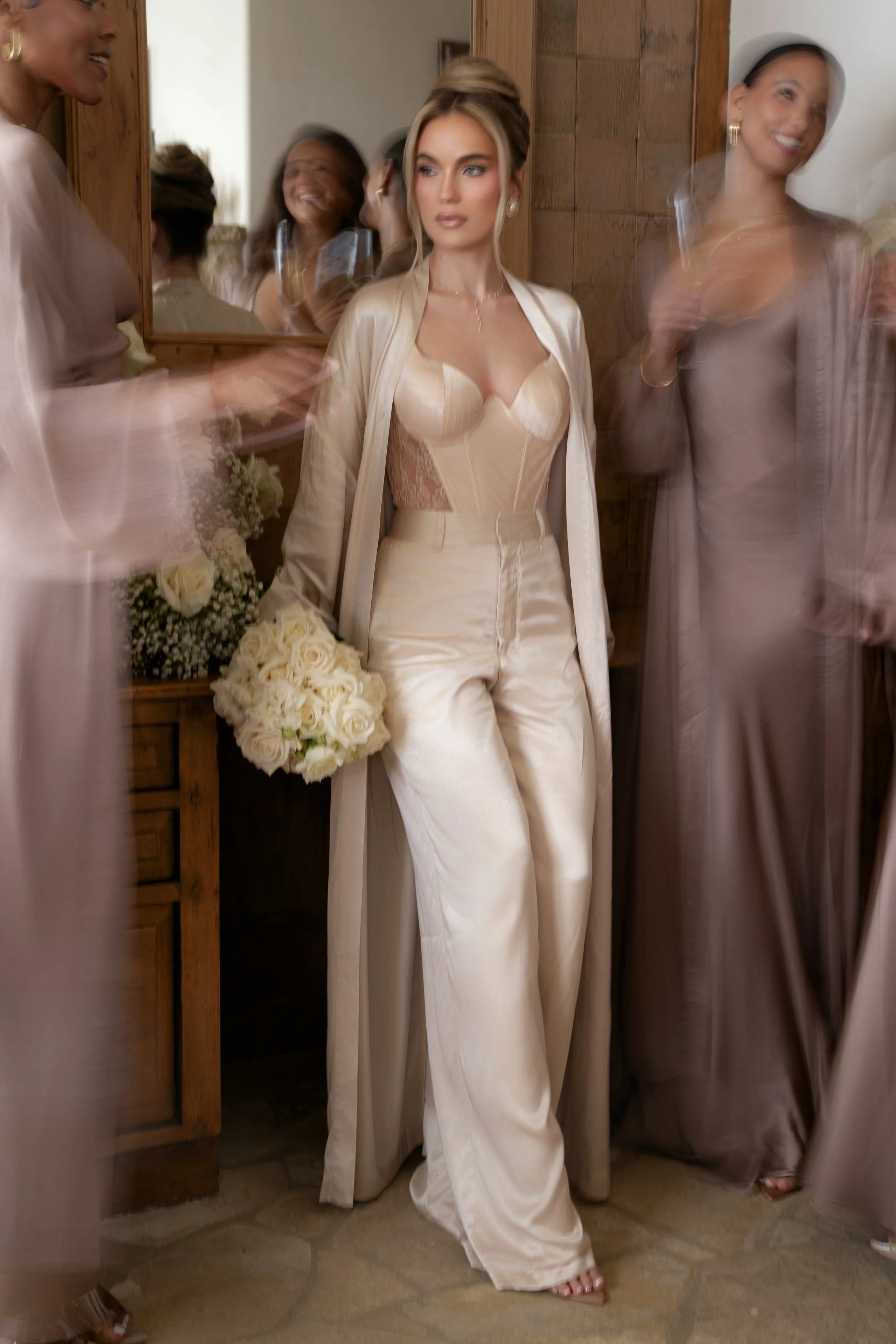 Designed for the JLUXLABEL Bridal Collection. Make your special day even dreamer with our Champagne Ever After Satin Trousers. Designed for a Bride’s special day, these trousers are crafted from luxurious satin fabric and made to exude comfort and sophistication. Featuring a banded waist with belt loops, straight leg hems, functional side pockets, and back faux welt pockets. Front bar and hook zipper closure. Pair with our Amour Satin Top for the full look. Double lined with no stretch.