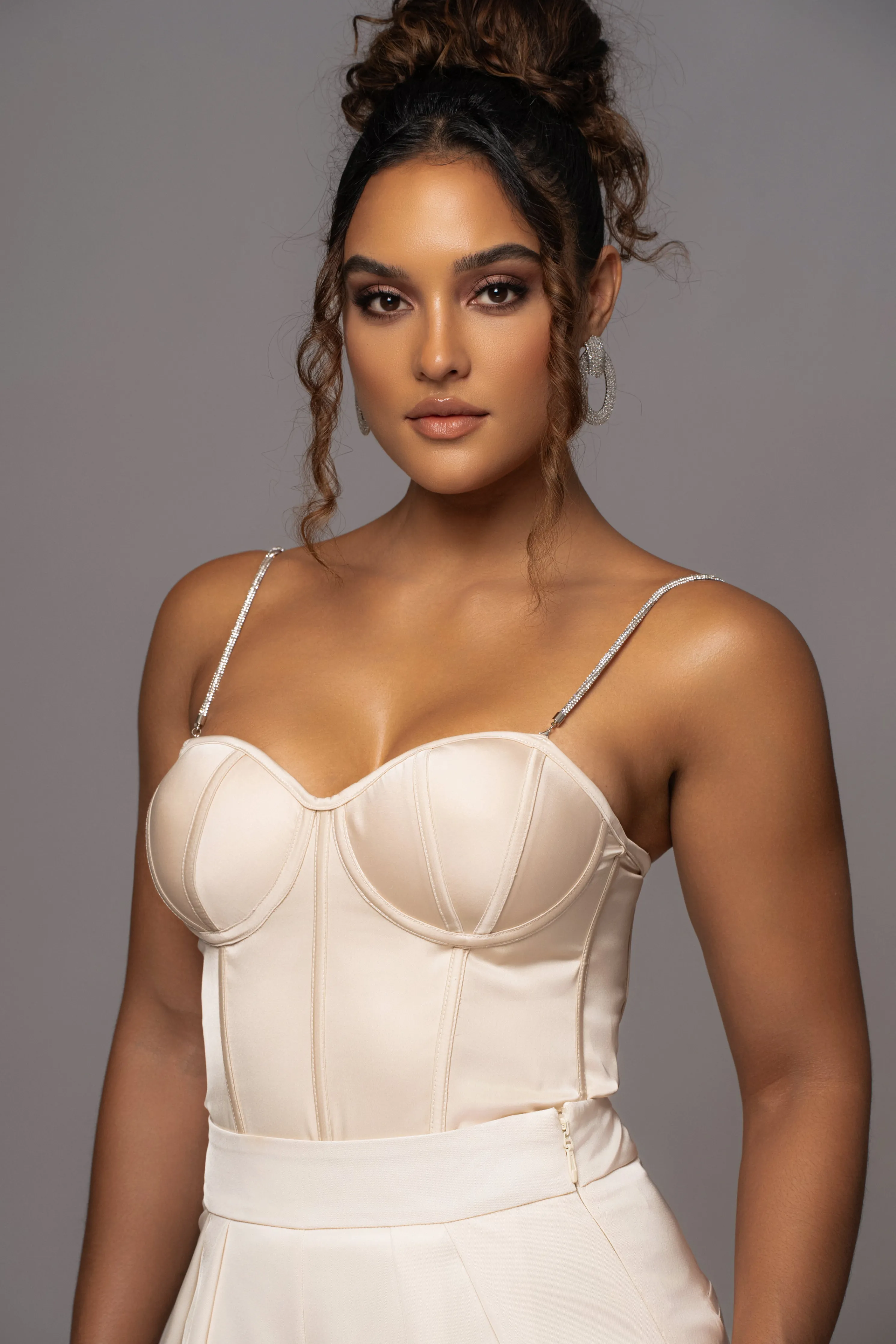 Our Champagne Leo Matte Satin Bustier is the only top you need this season. Crafted with luxurious satin, this corset provides flattering structure with built-in boning, bra padding, and adjustable hook and eye closure. Delicately finished with adjustable/removable rhinestone shoulder straps, this exquisite piece was made for event season. Pair with our Olea Satin Skirt for the full look. Minimal stretch.