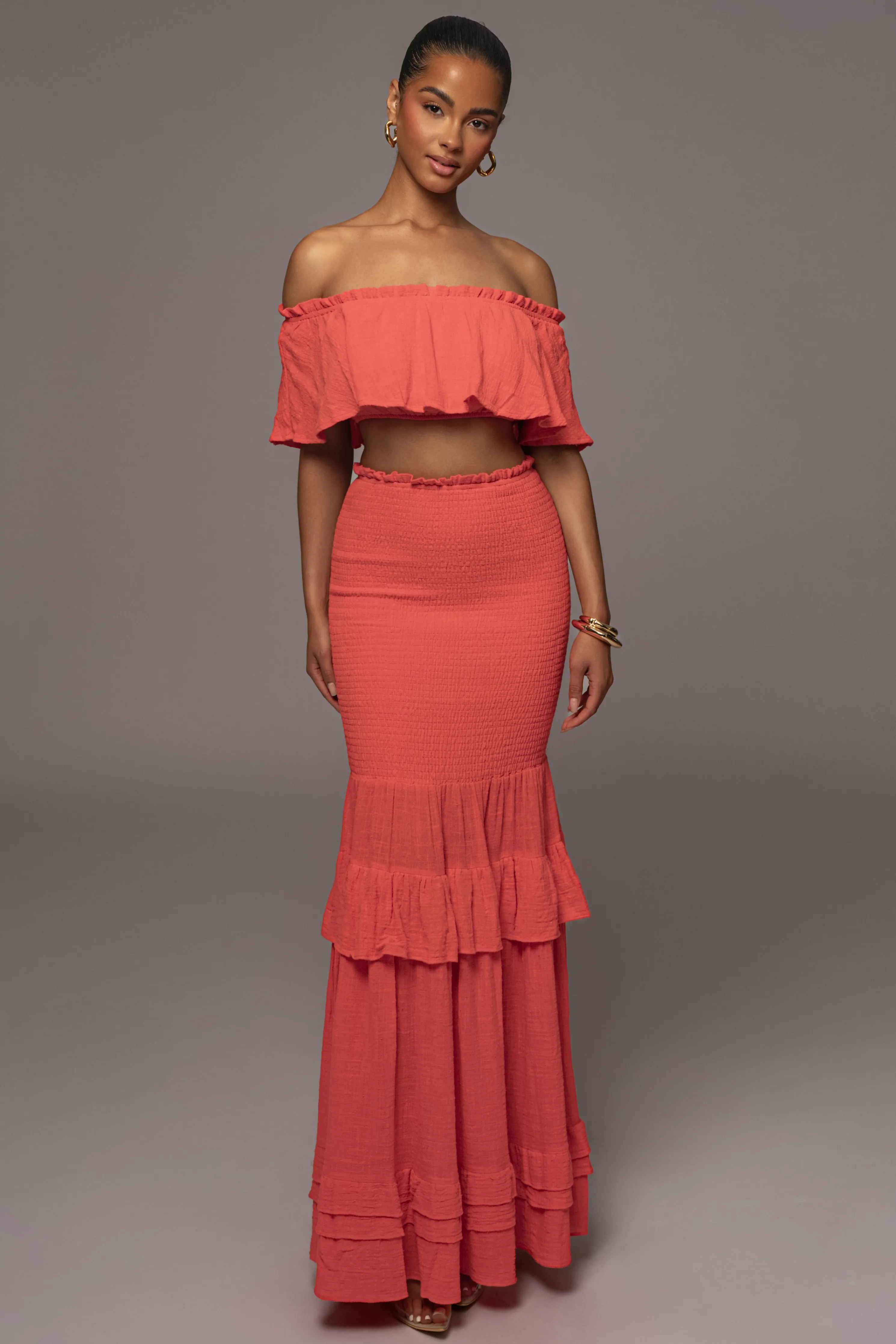 The perfect vacation look starts in our Coral Sienna Ruffled Skirt Set. This beautiful two piece skirt set is designed with lightweight Cotton fabric for a breathable feel. Featuring a sweet ruffle top with off the shoulder neckline and a cropped hem. Complete with interior lining and elastic hem for extra stretch. The matching maxi skirt features a flattering smocked design leading to ruffled tiers that complete the look. Stretchy. Sold as set.