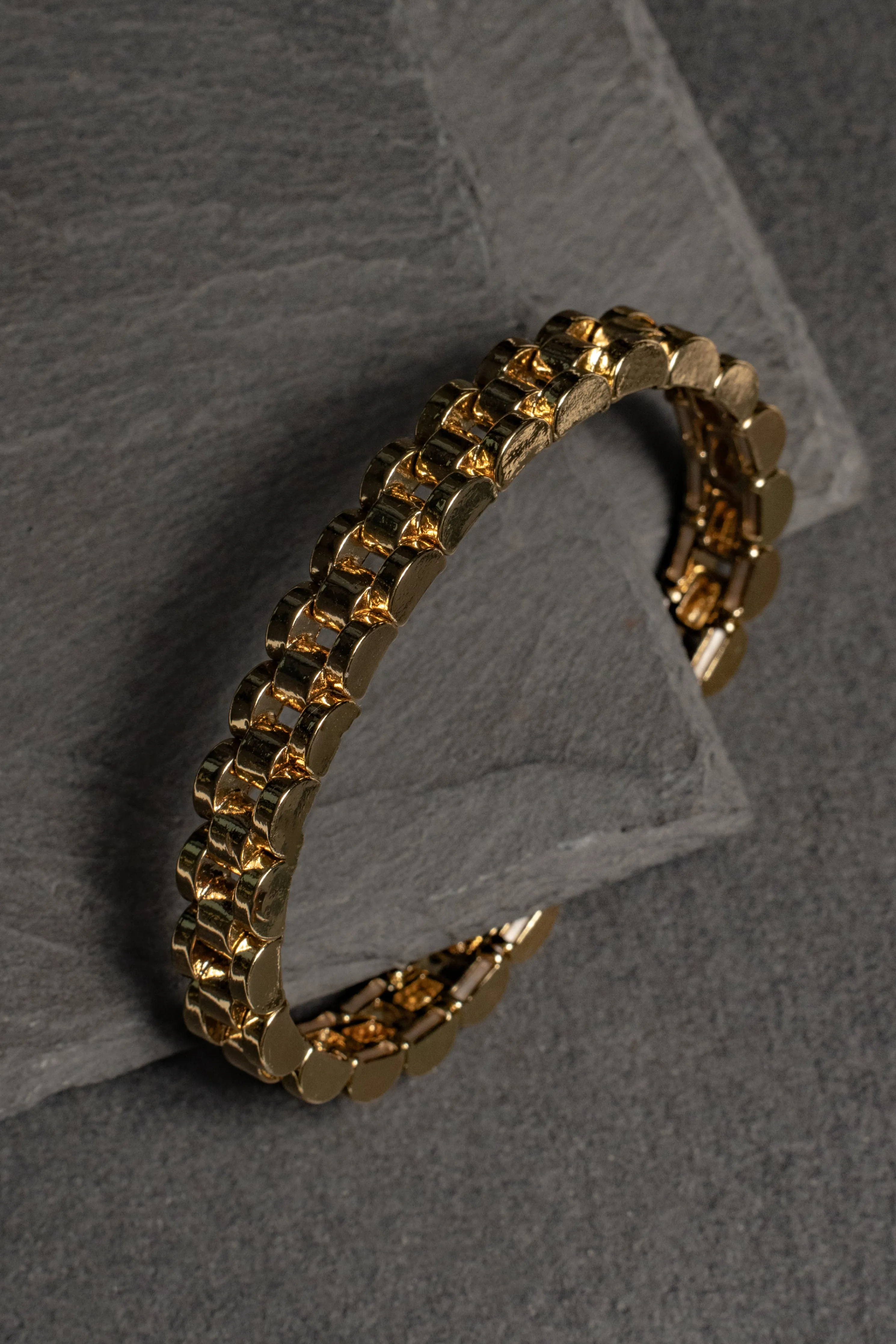 Adorn your hand with shinethis season in our Gold Citizen Bracelet.This stunning chain bracelet featuresan elastic band in a classic chain design. Slip on style.