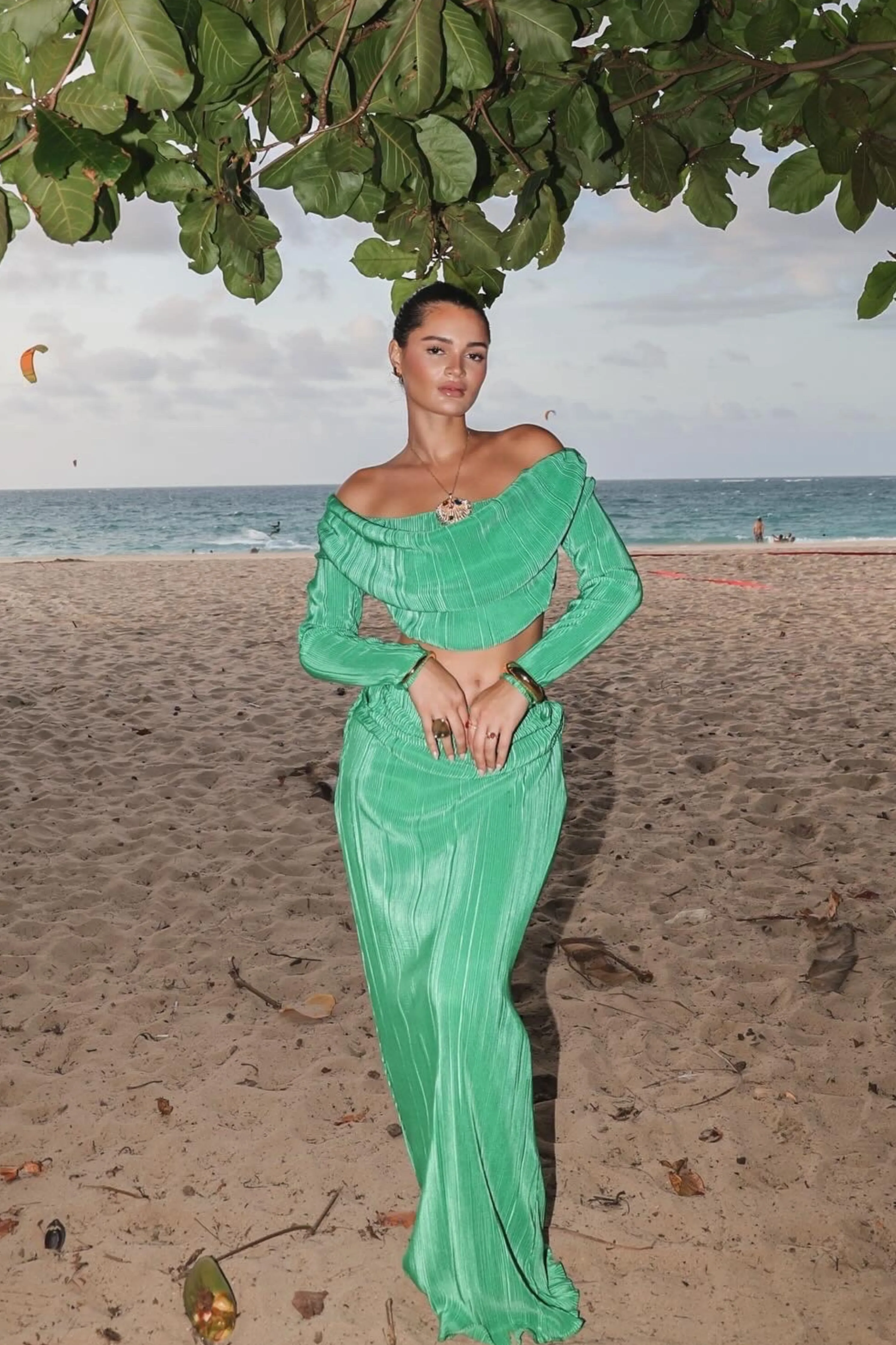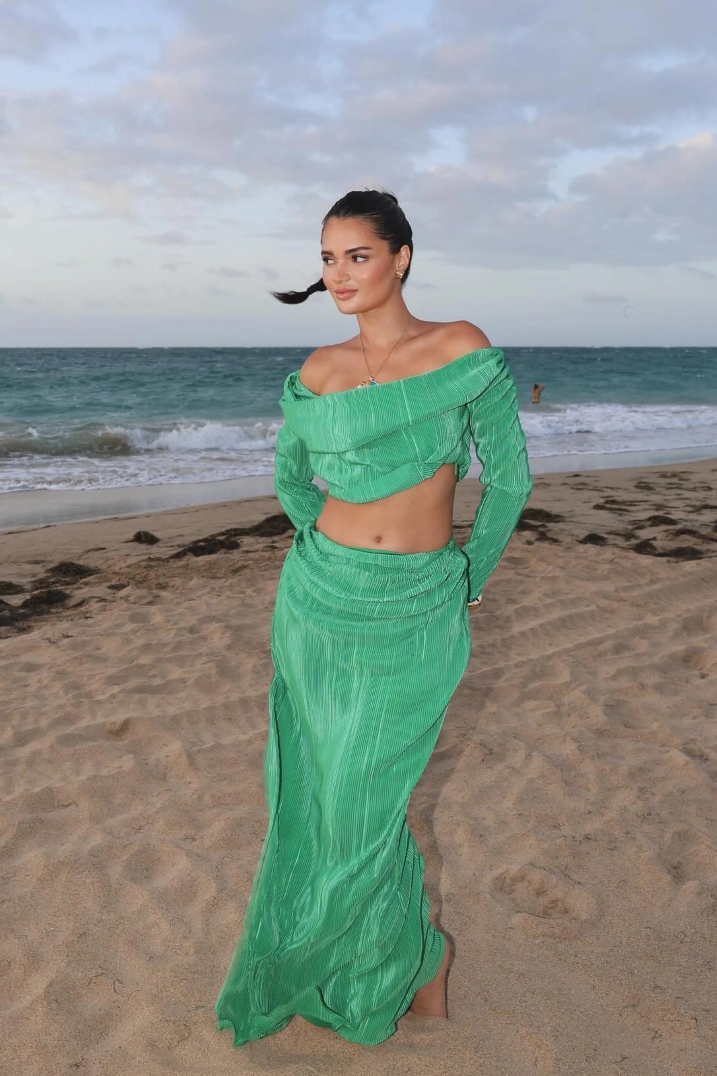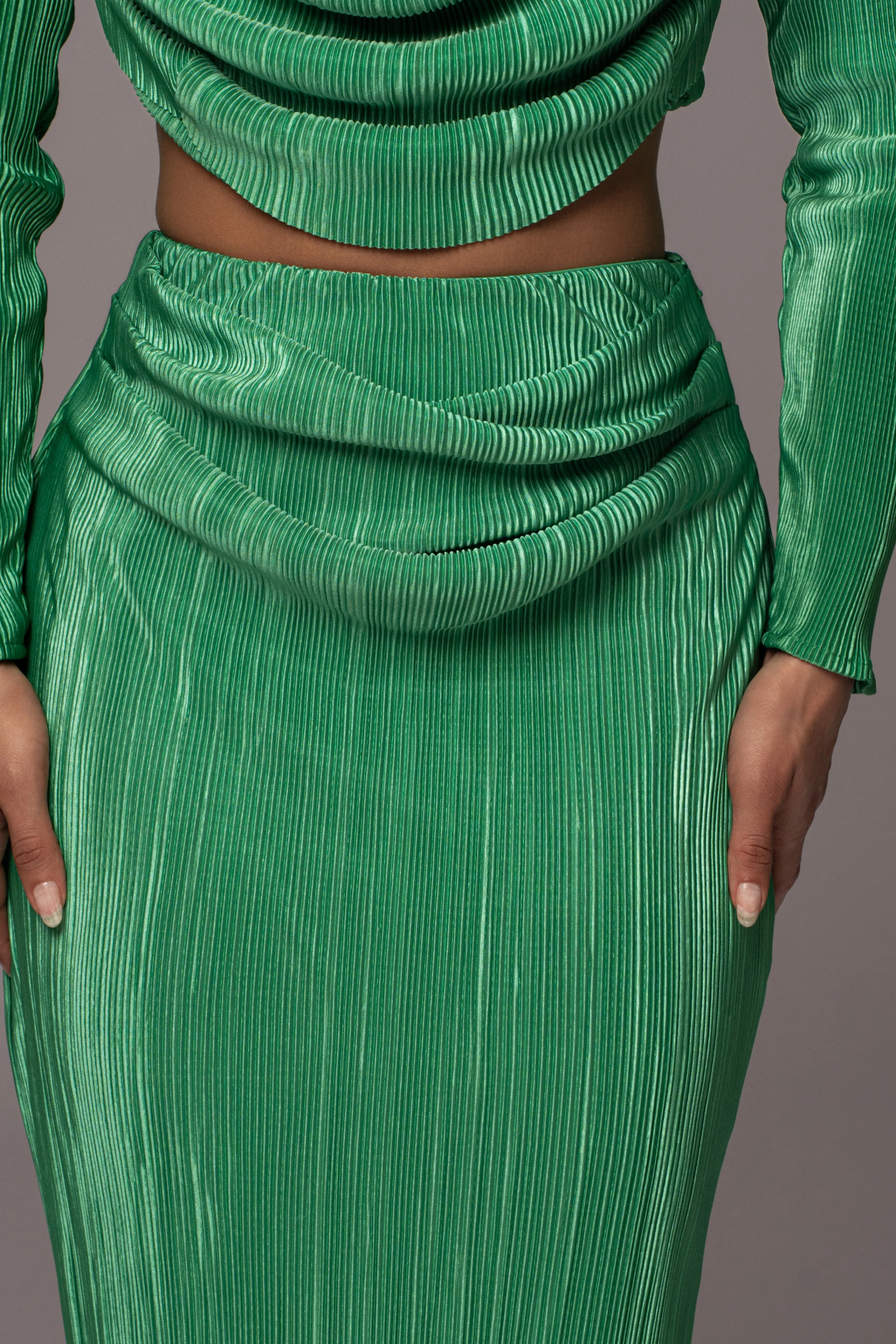 Step into elegance with our Green Haidyn Skirt Set. This summer skirt set features a stylish crop top with long sleeve arms and a draped cowl neck with hidden side zipper closure. The matching maxi skirt highlights draping at the waistline with curve-hugging silhouette and side zipper closure. Style together or separate, both pieces are designed in a pleated fabric with double-lined interior. Stretchy. Sold as set.
