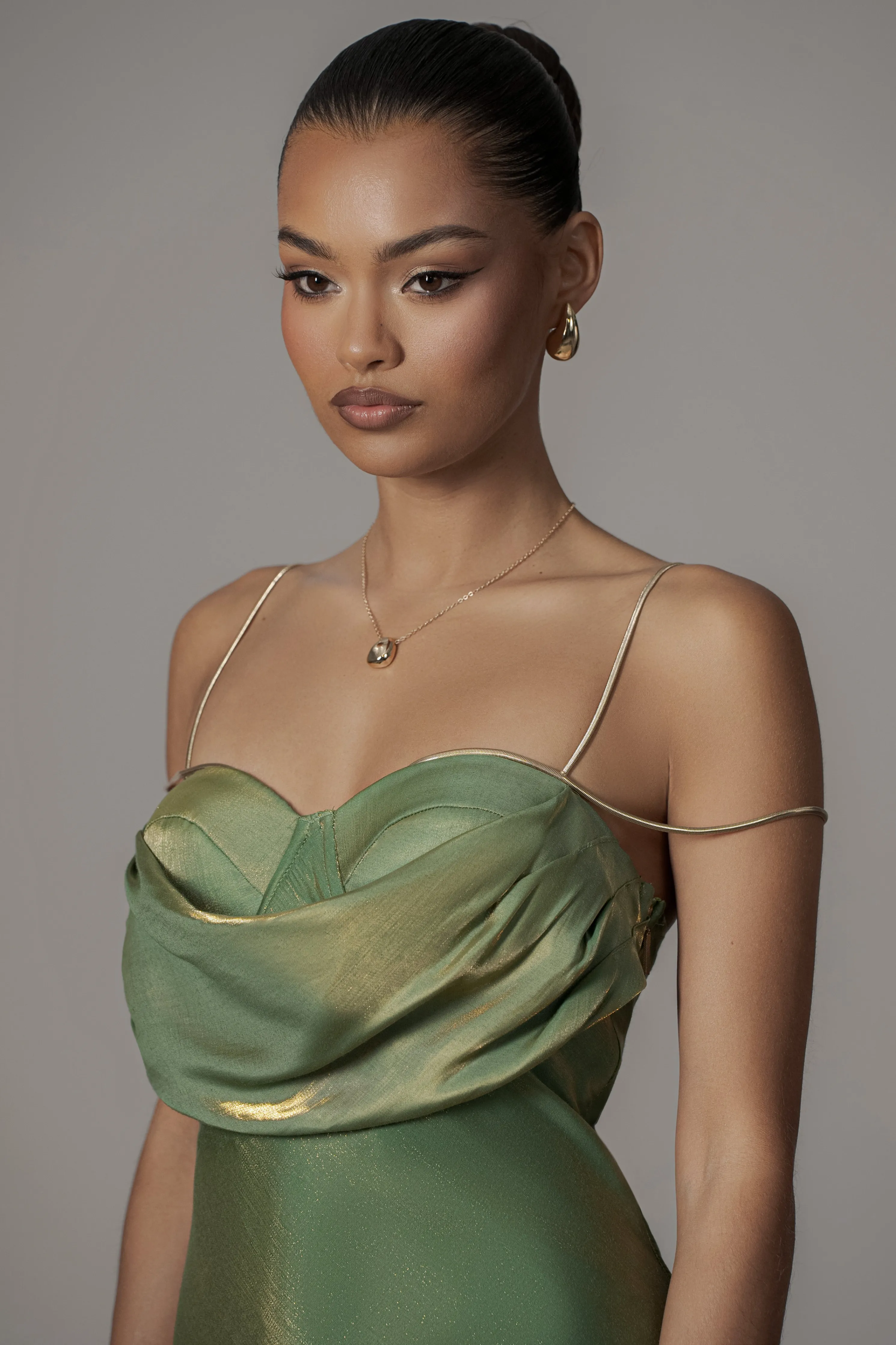 Our Green Iridescent Visions Of You Midi Dress is a statement on its own. We’ve taken one of our most loved designs and reimagined it in radiant iridescent fabric, elevating its allure. Featuring a sweetheart neckline with cowl detail, padded/wired cup support, and elegant gold-tone straps that can be removed for an optional strapless look. Side zipper with slit hem. Double lined. Minimal stretch.