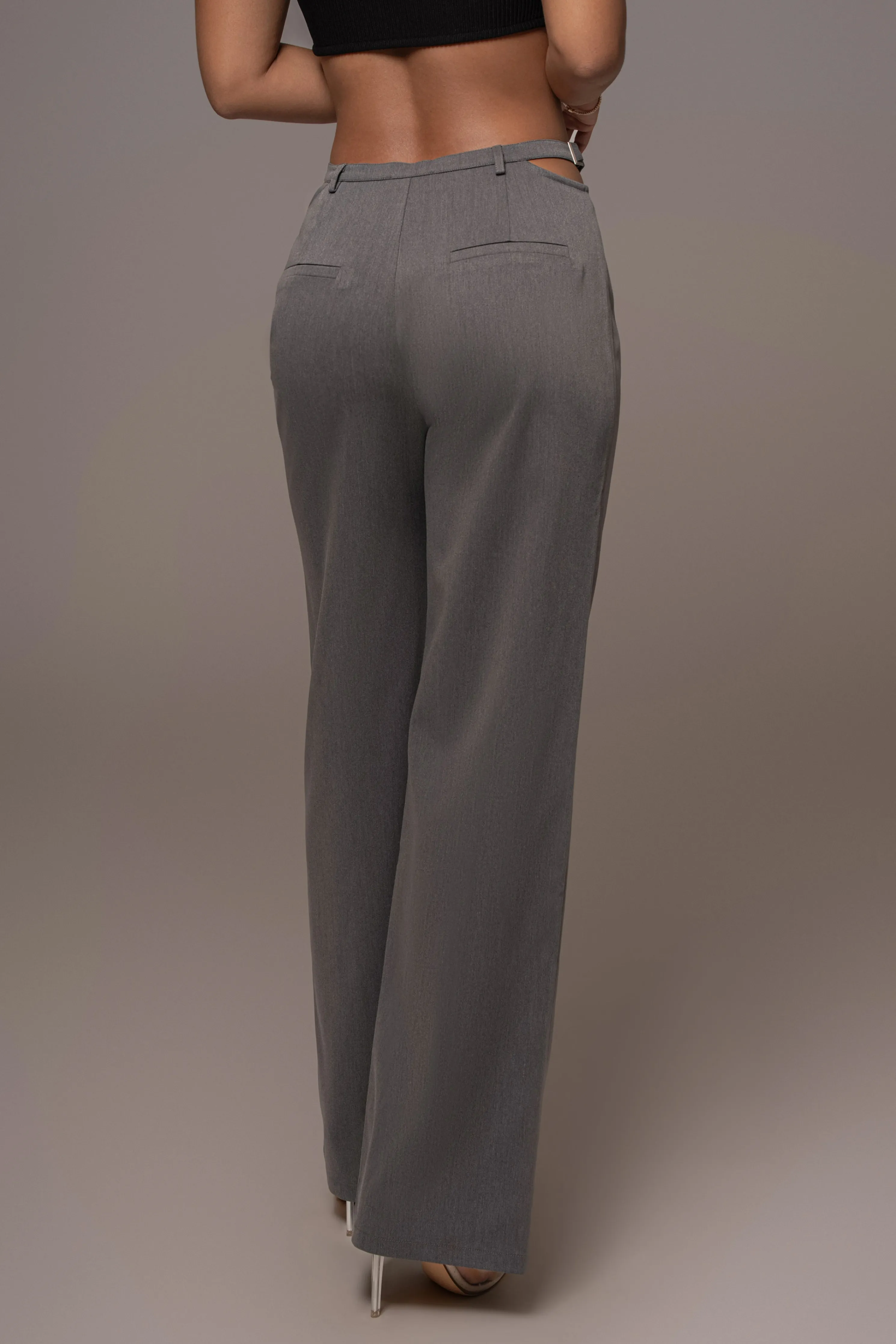 Our Grey Symone Cutout Pants offer timeless elegance and sophistication. Boasting a darted front detail, edgy cutout waist, faux back pockets, and straight leg hems. These trousers bring modern style to any look with a hidden clasp/zipper closure and metal hardware embellishment. No stretch. Single lined.