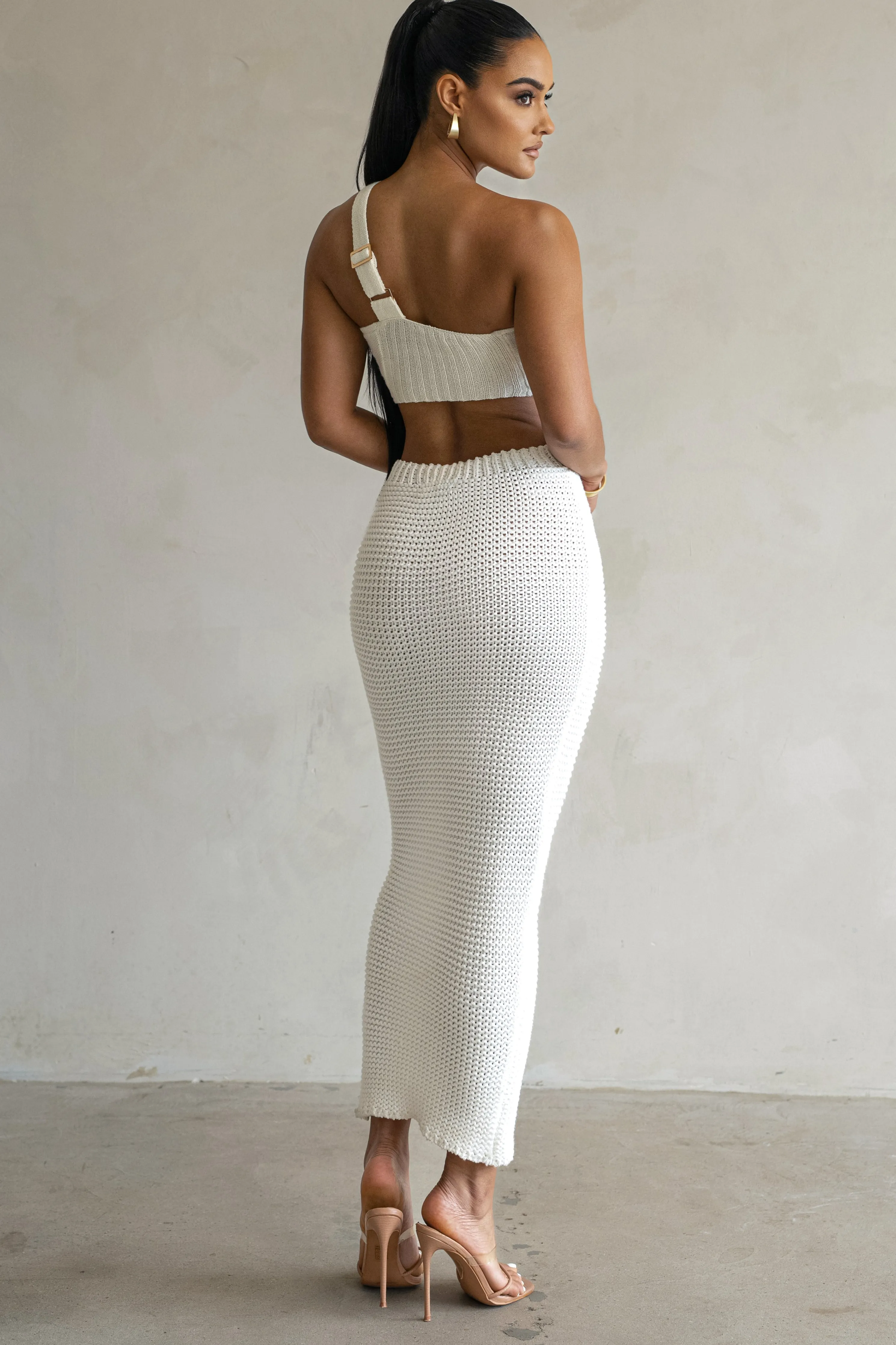 OurIvory Jeanette Knit Top is a statement all on its own! This subtle yet striking top features a one-shoulder neckline with an adjustable shoulder strap detailing a gold-tone accent. Crafted in a crochet knit fabrication for an element of texture. Stretchy.