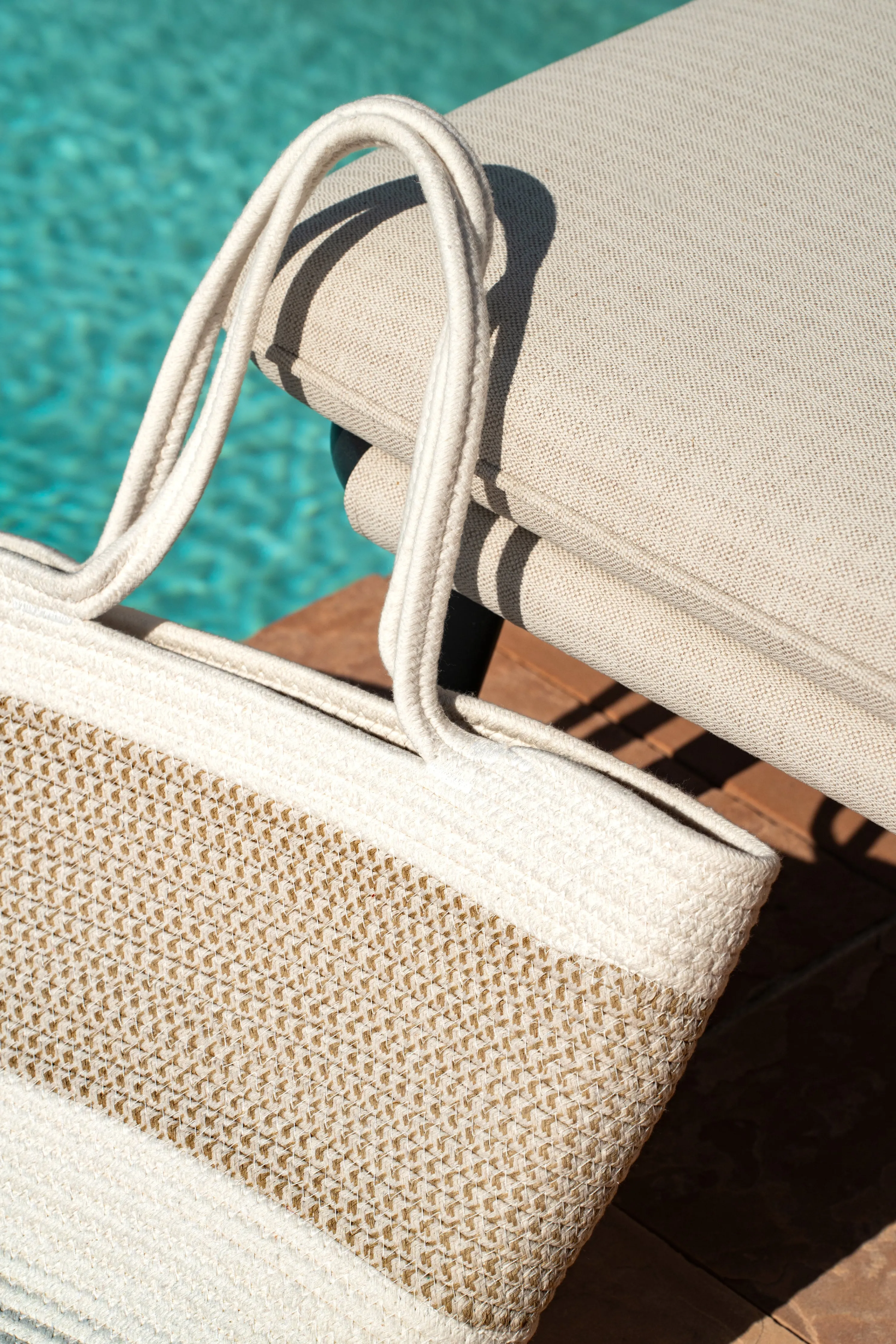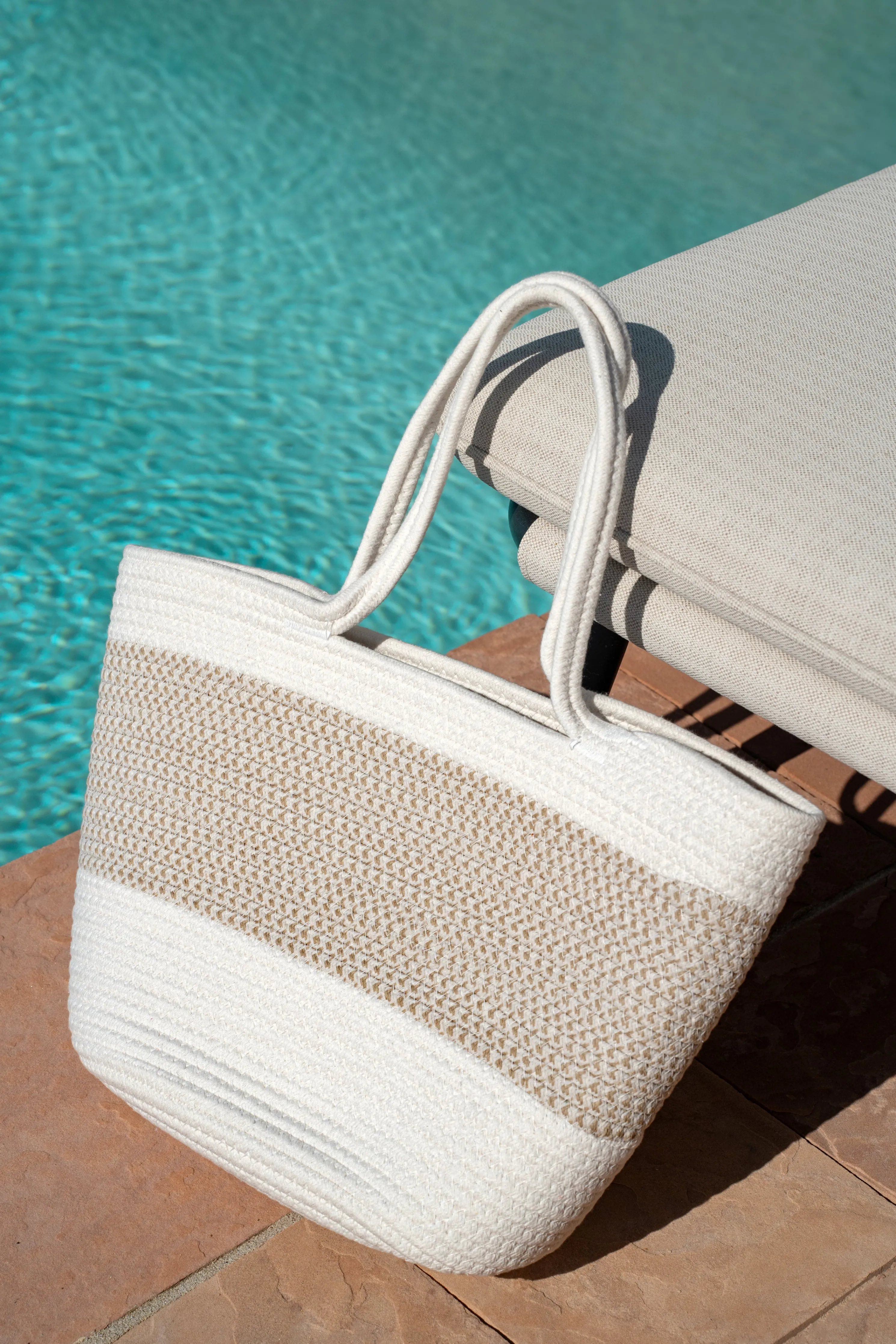 Sail away to paradise with our Ivory Mar De Luz Tote Bag. This vacation ready handbag features two handles with a striped design in a soft ivory and beige hue. Complete with a top magnetic closure.