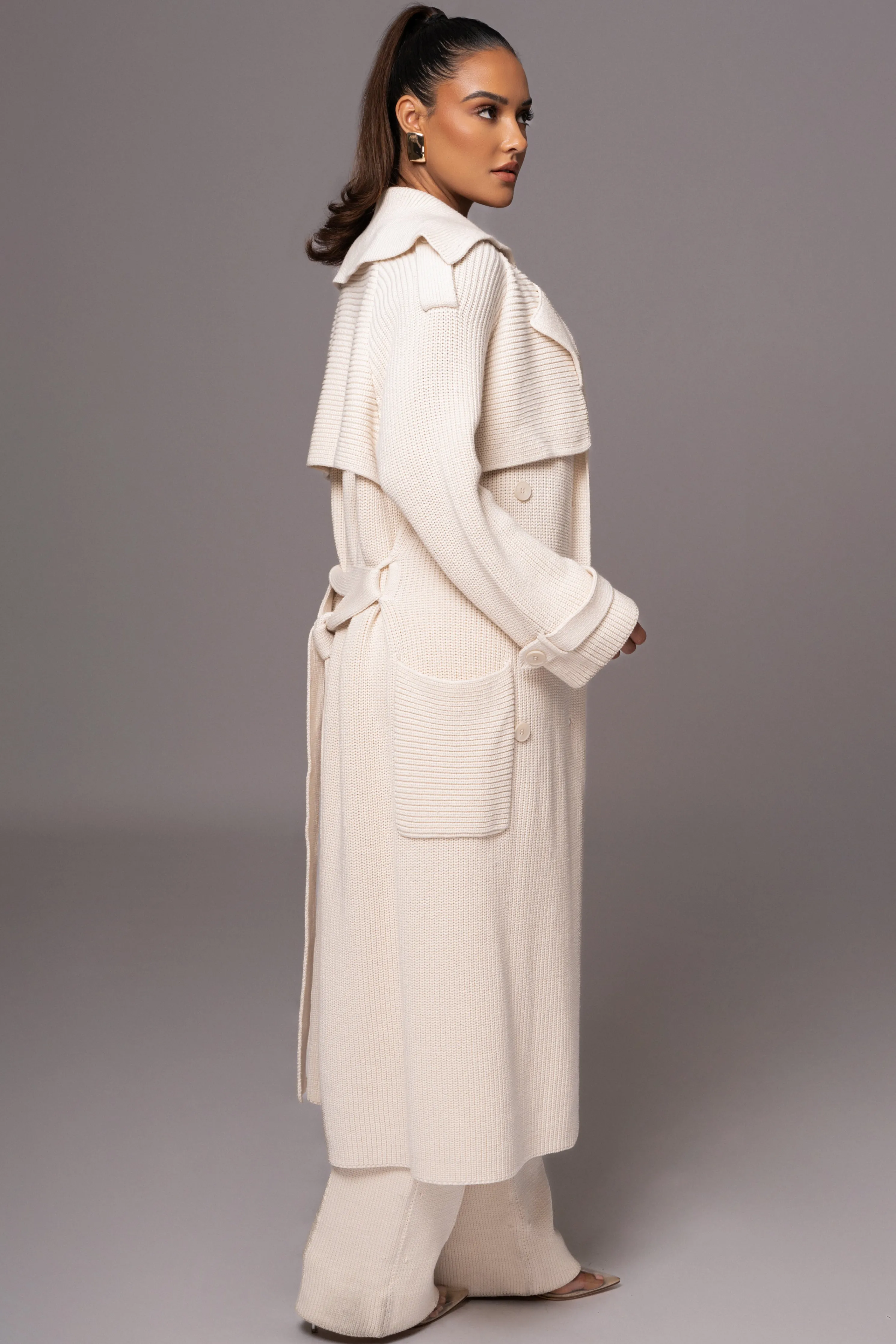 Stay warm in our Ivory Maxinne Knit Coat. This sophisticated piece features a double-breasted front, classic notch lapels, two welt pockets, and a self-tie belt for a polished look. Accented with button tab shoulders and cuffs, this coat is completed with a back slit hem for added flair. Crafted in a ultra soft knit fabric perfect for the season. Pair with our Back In Business Knit Trousers for the full look. Single lined. Stretchy.