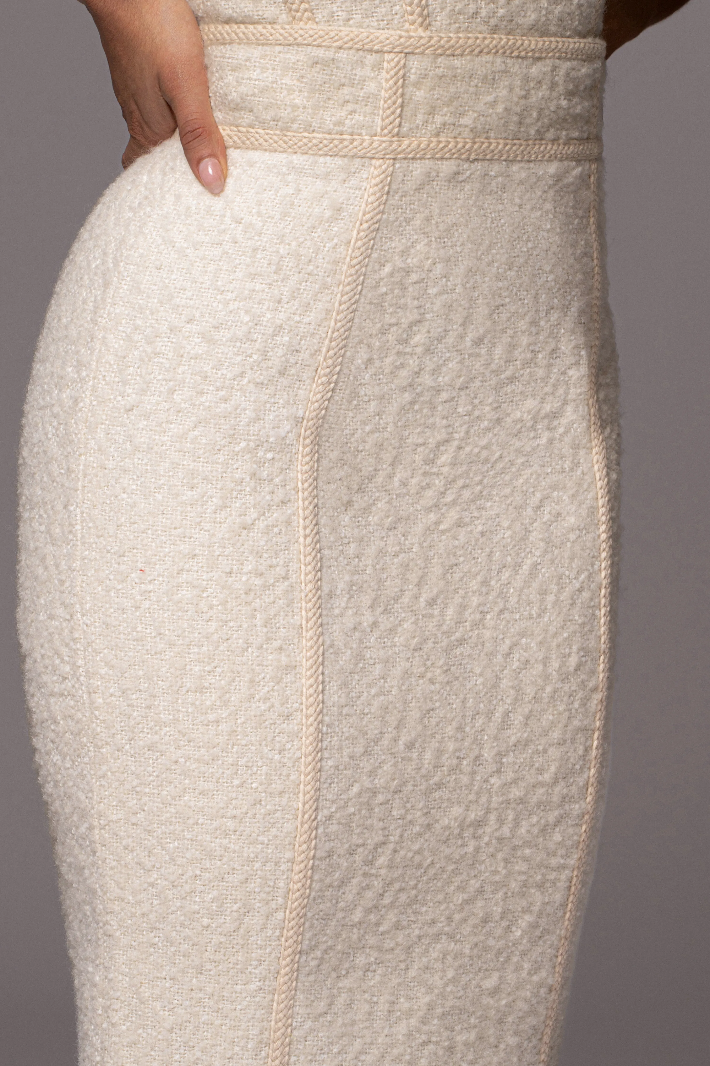 Experience ultimate elegance with ourIvory Miles Skirt. Crafted from soft boucle fabric, this midi skirt comes with a high waist, back slit hem, and pencil-style silhouette to accentuate your curves. Braided trims on the waistband and seams add an elegant touch of style. Complete with a back gold-tone zipper and a nude lined interior for extra comfort. Pair with our Jozie Bustier Topand Fit For Success Boucle Coat for the full look. No stretch.
