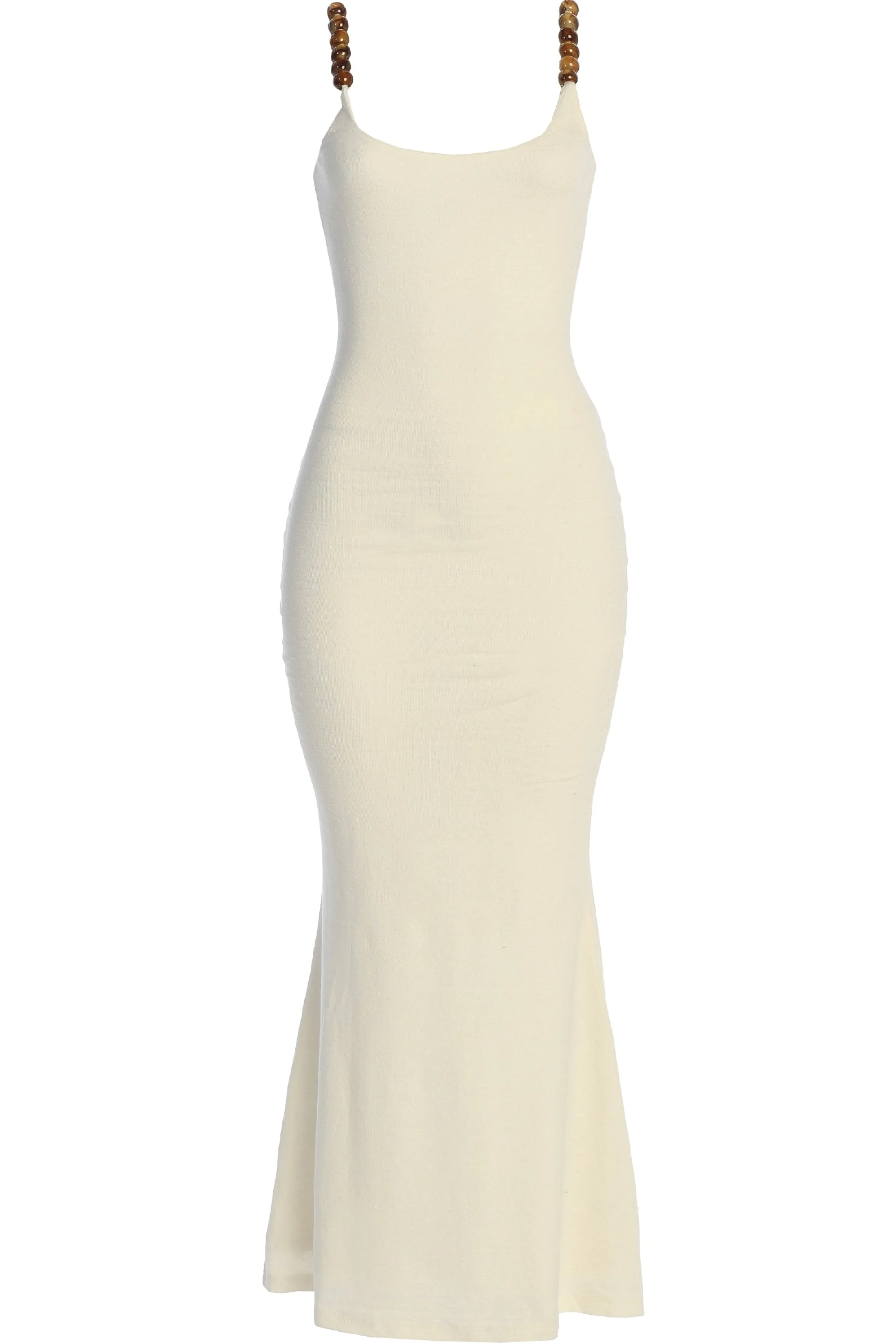 Sail away in style with our Ivory Nautical Escape Maxi Dress. This stunning maxi dress features a round neckline and twisted straps adorned with marble beads, giving it an elegant touch. Crafted from a lightweight fabric, this dress is perfect for a day at the beach or a night out on the town. Double lined. Stretchy.