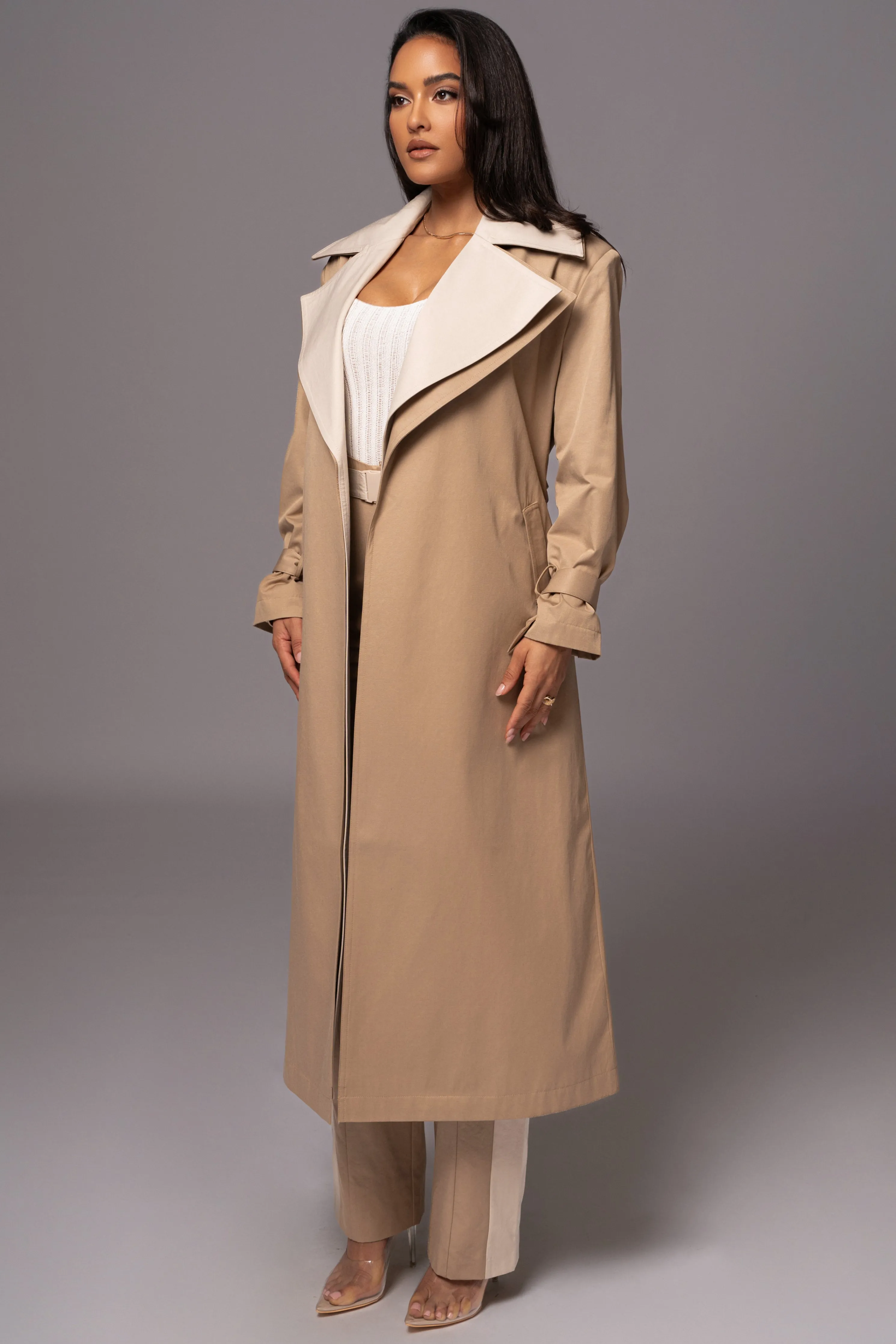 Introducing the Khaki Shona Oversized Coat, crafted for unparalleled elegance. This statement piece showcases classic notch lapels, a matching tie belt, self-tie cuff sleeves, and functional side pockets. Its contrasting design exudes sophistication, ensuring both versatility and functionality. Back slit hem. Double lined. No stretch.