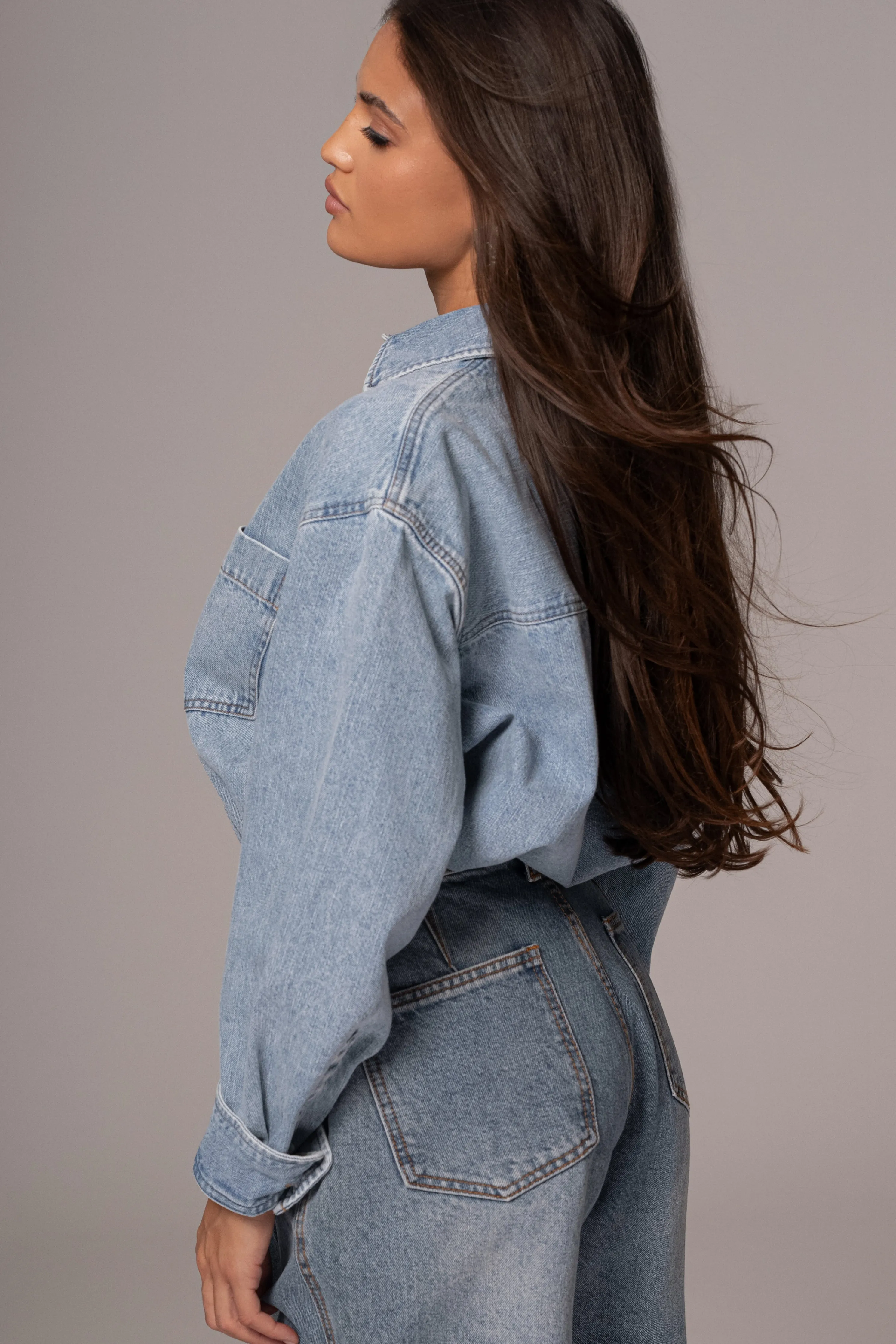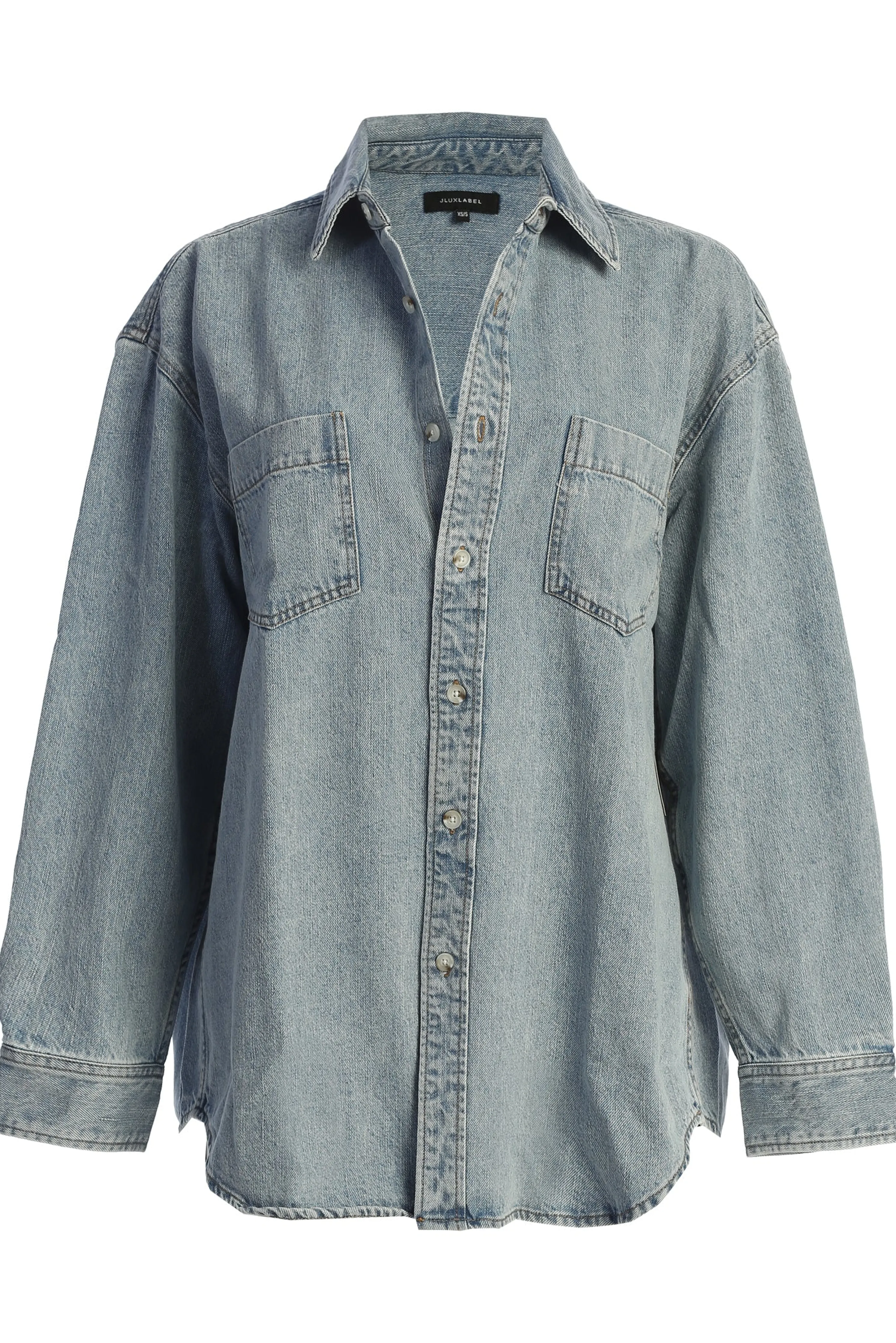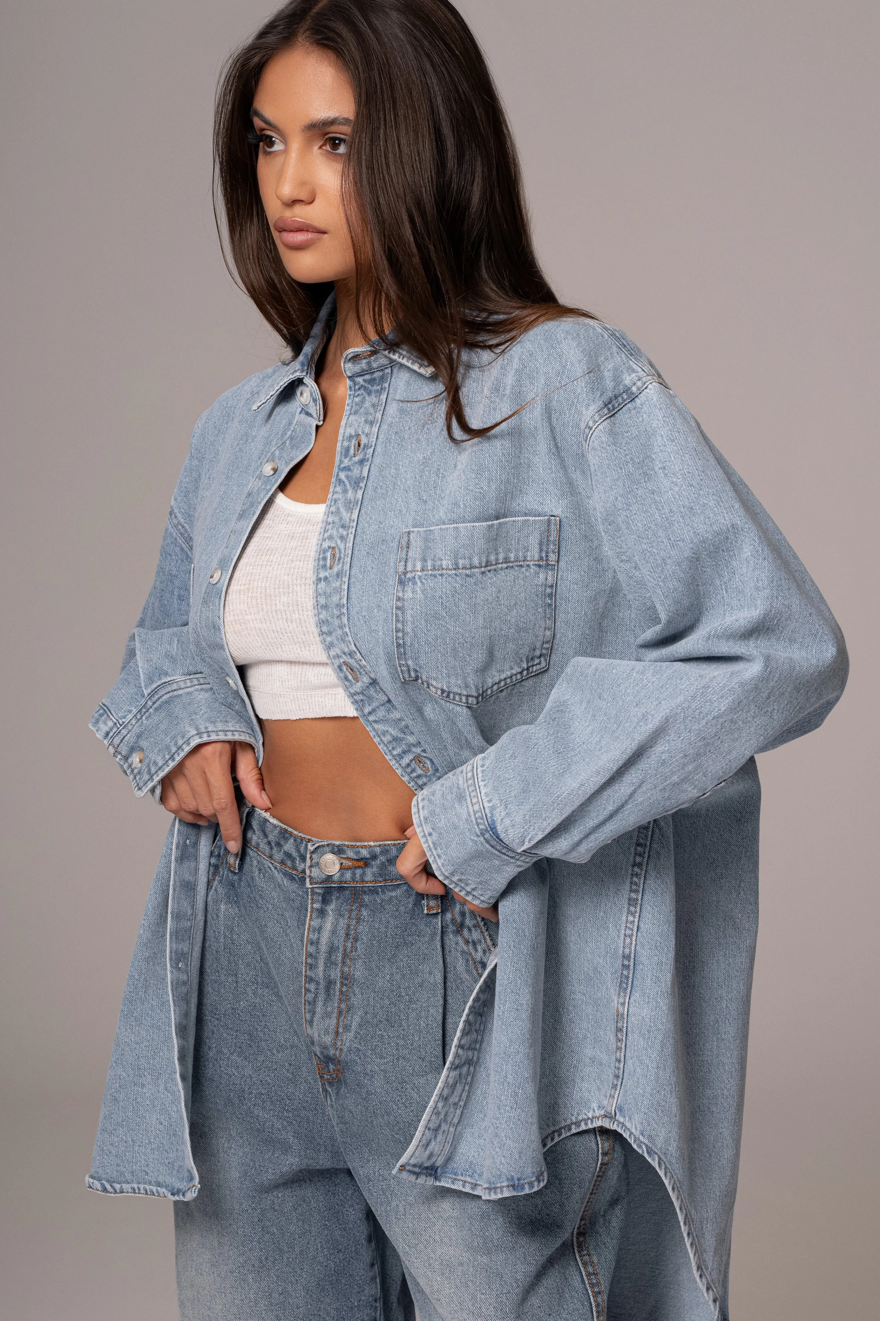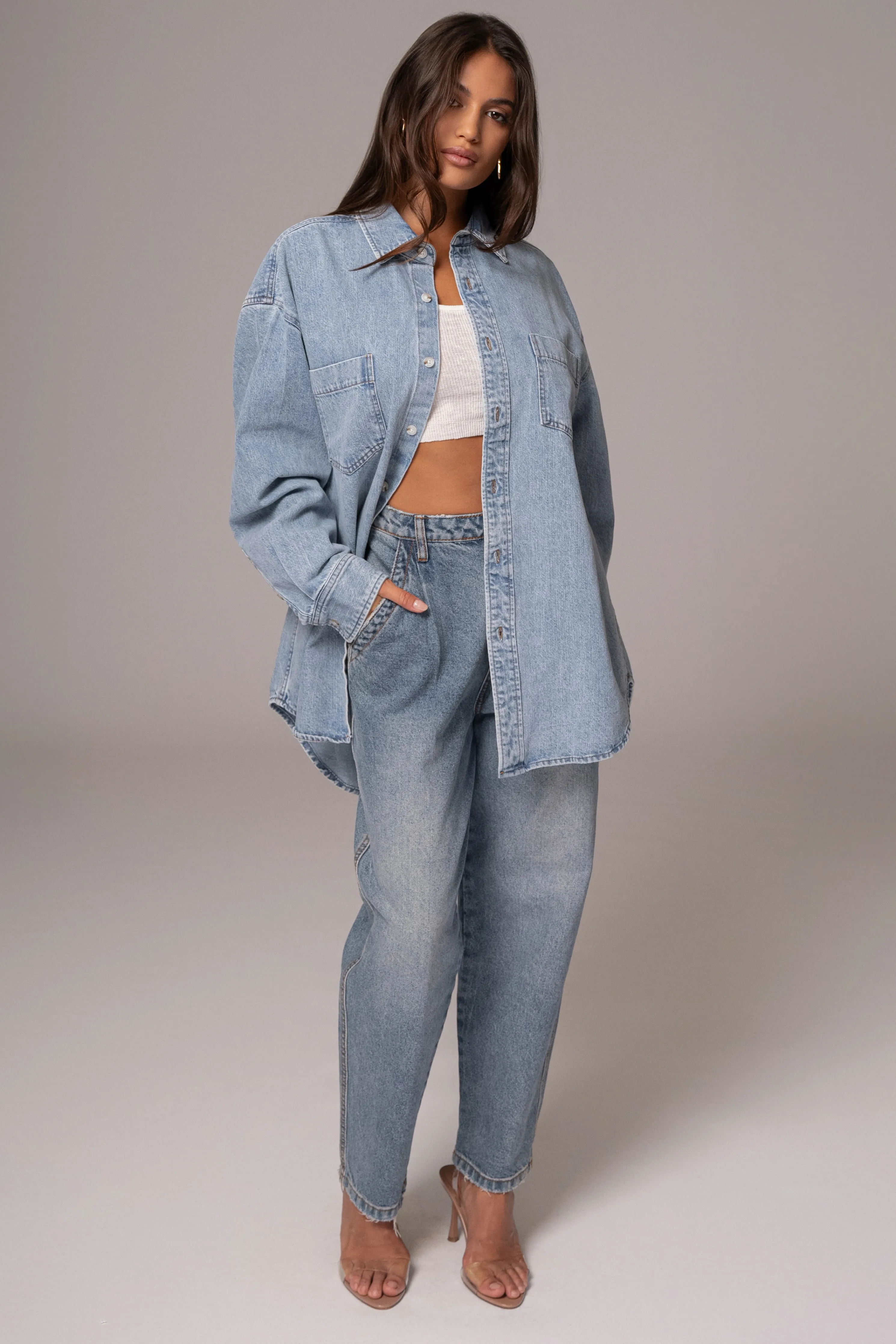Stand out in perfect style with our new Light Wash Denim Brandi Oversized Button Up. Featuring a collared neckline with long sleeves, a button front closure, two functional welt pockets, and buttoned cuffs. No stretch. Oversized.