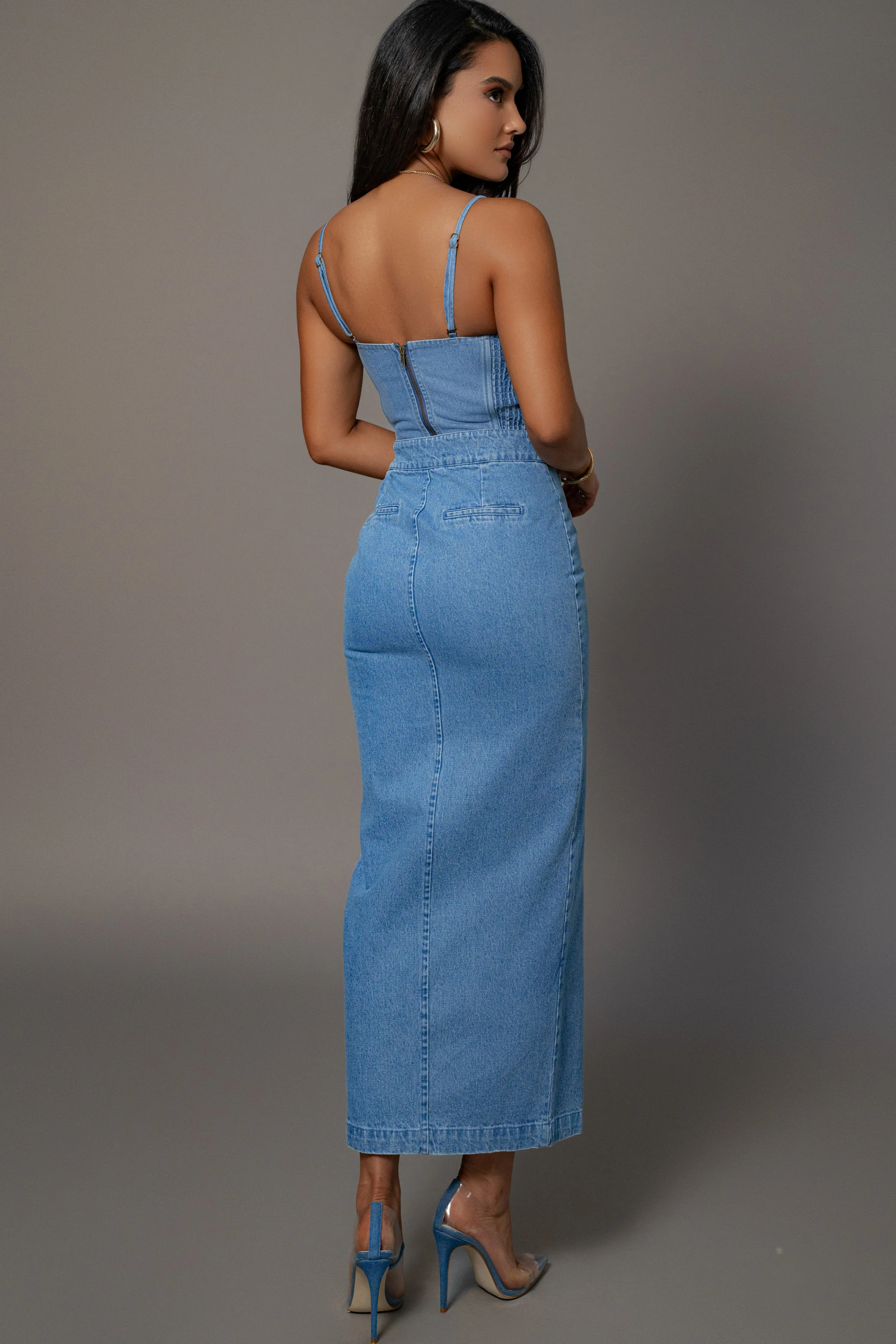 Elevate your new season style with our Medium Wash Adana Denim Skirt. Reimagined in premium denim, this luxurious piece boasts an asymmetrical waist with hook and bar zipper closure, a center slit, and back welt pockets. Pair with our Marsella Sweetheart Corset for the full look. No stretch.