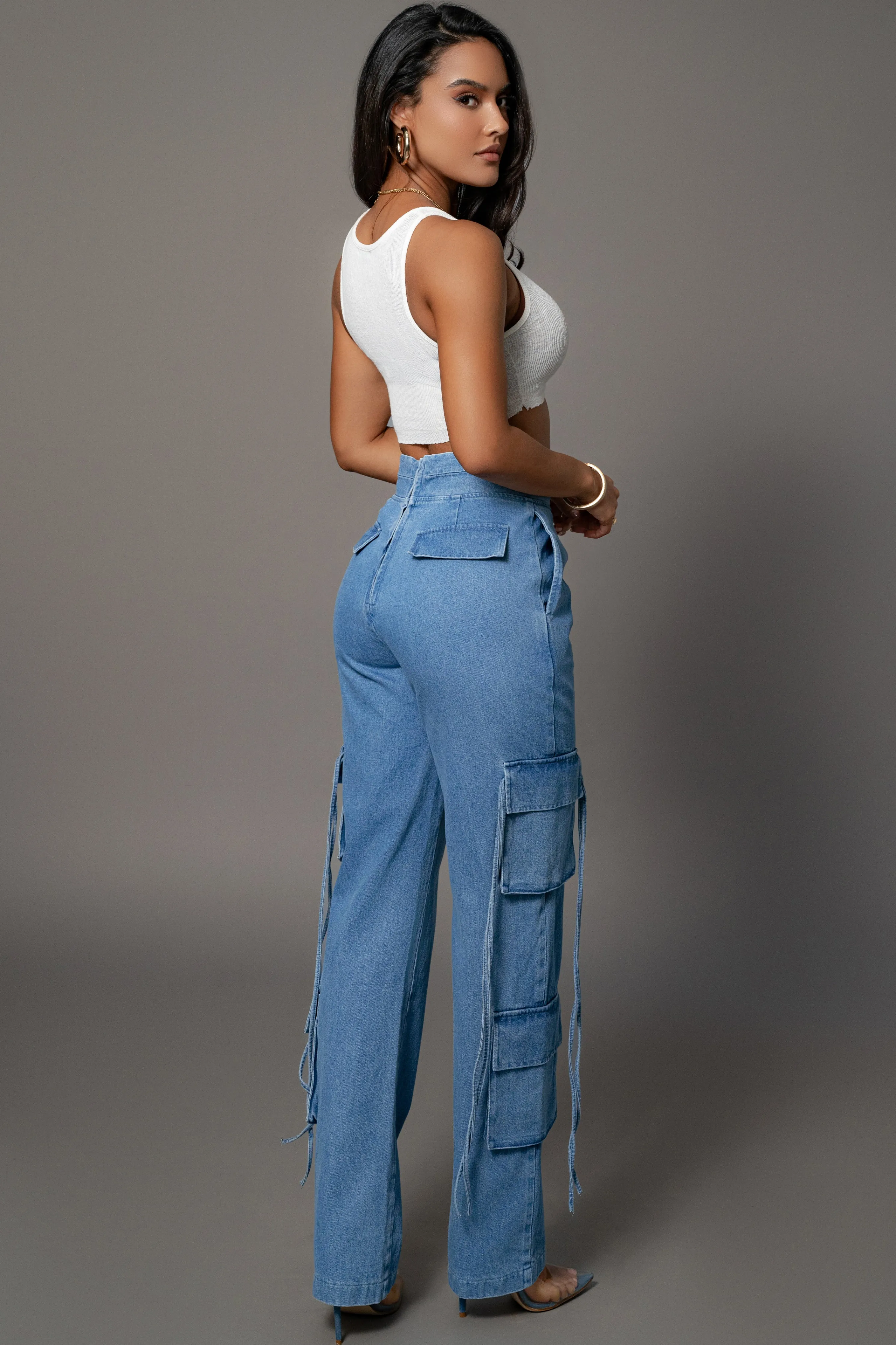 Enhance your wardrobe with a modern twist courtesy of our Medium Wash Jacinda Denim Utility Pants. Our most loved bottoms have been redesigned in denim adding a classic touch to your wardrobe. Crafted from premium denim fabric, these unique bottoms feature a front slit at the waistband and stylish cargo pockets adorned with drawstring ties for extra flair. Back faux flap pockets and zipper closure. No stretch.