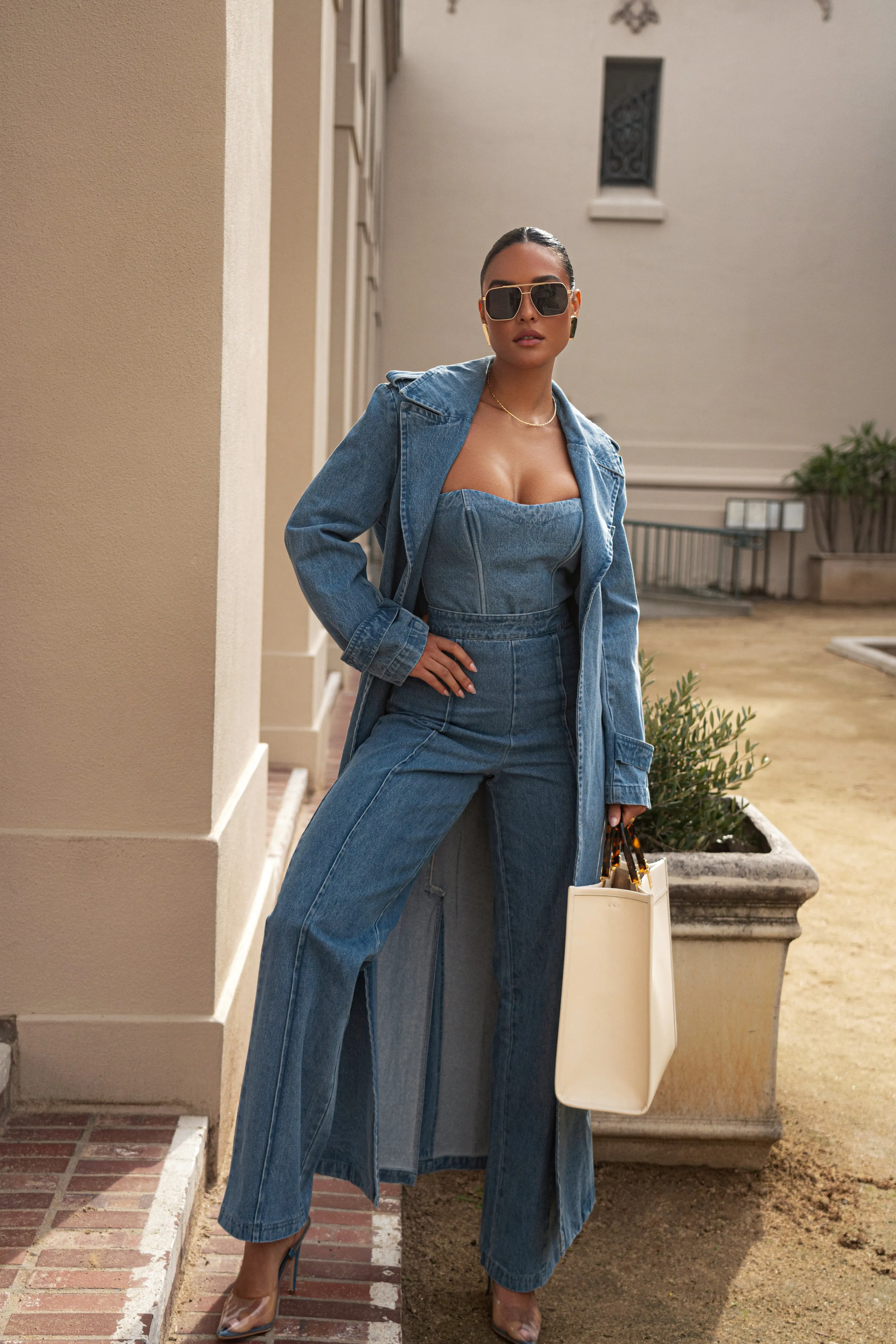 Our Medium Wash Stay Sharp Denim Trousers were designed for seamless transitions from work to the weekend. We took one of our most loved designs and reimagined it in premium denim, elevating its style with superior quality and a modern twist. The trousers feature a banded waistband with wide leg hems and elegant princess seams along the center front and back legs.Pair with ourAll You Need Denim Corset for the full look. No stretch. Back zipper closure.