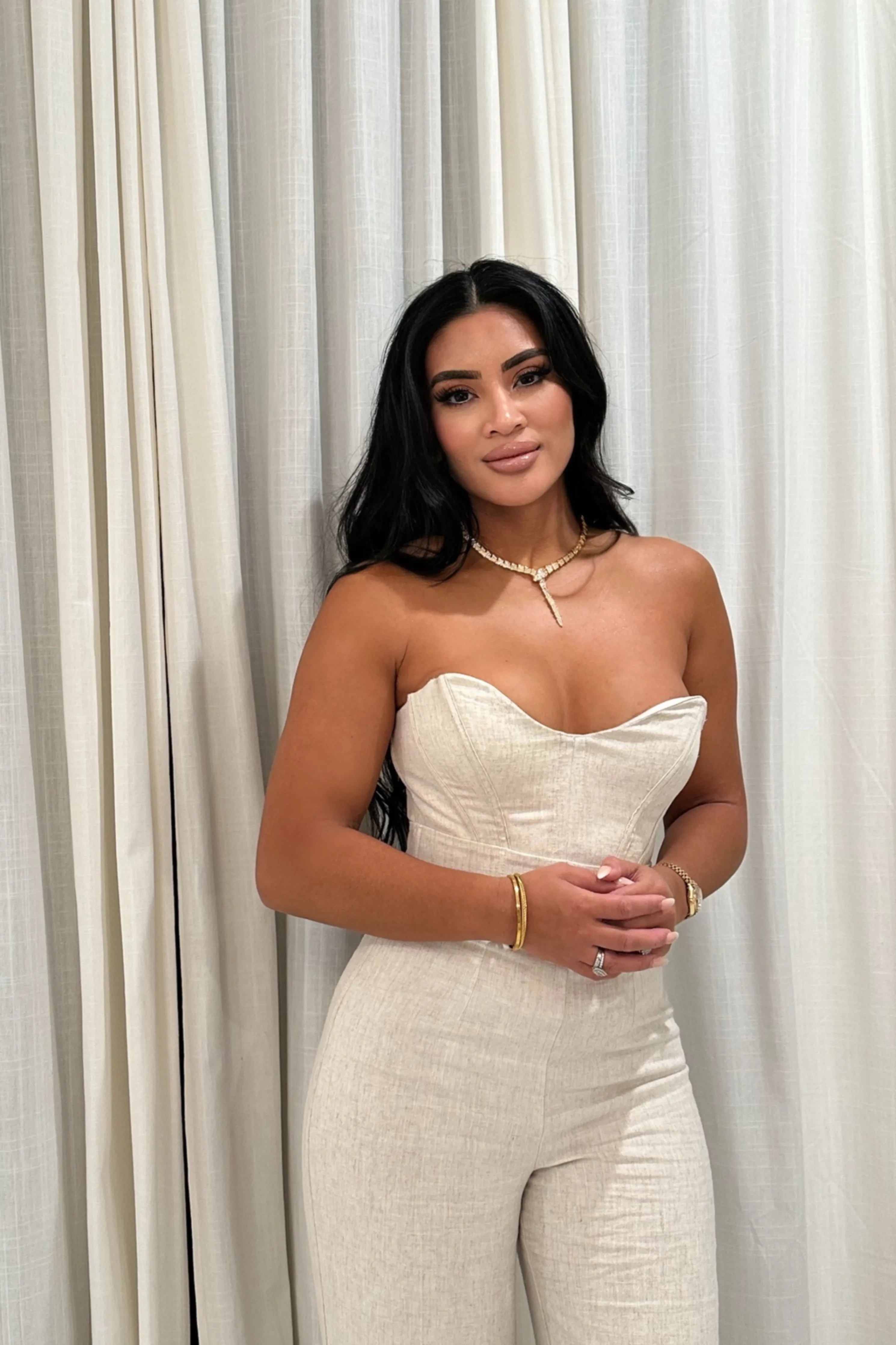 Dive into the essence of summer with our Natural Beyond The Sea Linen Corset. This exquisite piece features a double-lined design and a curved hem, enhanced with boning for impeccable structure. The lace-up back ties add a touch of elegance, while the premium linen blend fabric exudes sophistication. No stretch.