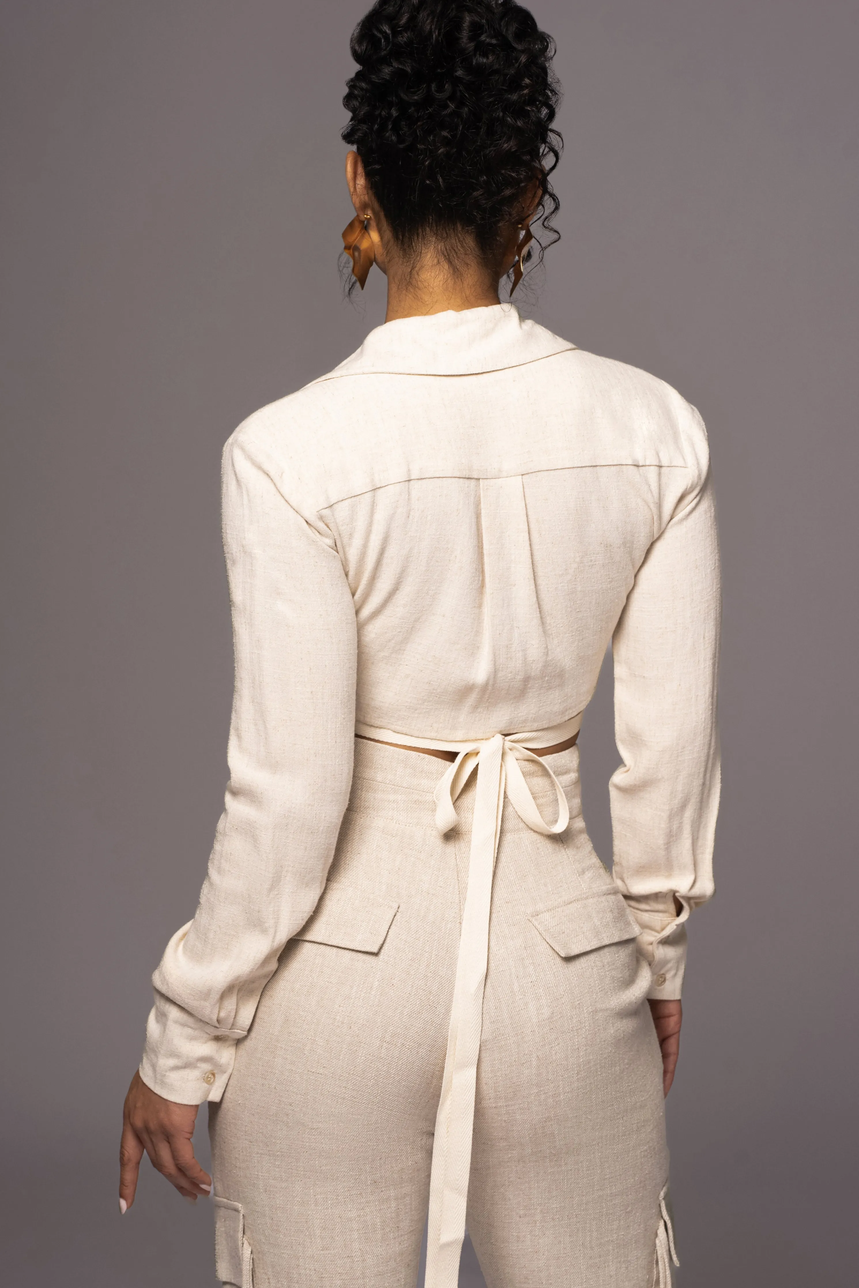 The Natural Drift Away Linen Wrap Top is here to easeon those hot summer days!Constructed of a Linen blend, this effortless topbrings you to a level of elegance ina collared neckline with a wrap-front design and back tie closure. Wrap it in so many ways, the possibilities are endless. Pair with our Better Half Linen Utility Pants for the complete look. Cuffed sleeves. No stretch.