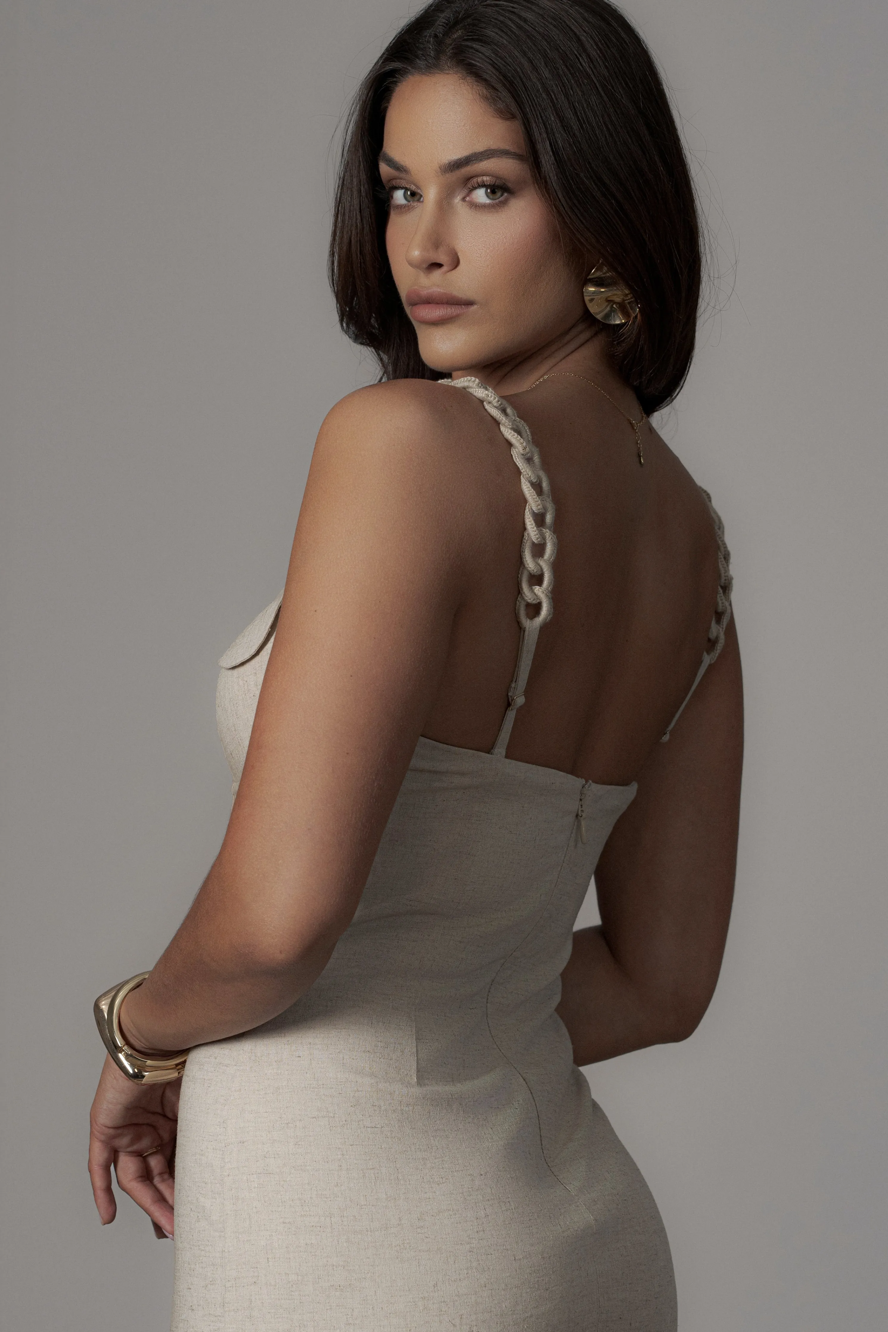 Escape in luxury with our Natural Secret Hideout Linen Dress. Perfect for any occasion, this midi dress features a beautifully shaped fold over bust line, yarn-covered chain straps, and padded/wired bra cups. It’s finished with a hidden back zipper closure and a back-slit hem. Crafted from a fresh linen blend, perfect for summer outings. No stretch. Double lined.