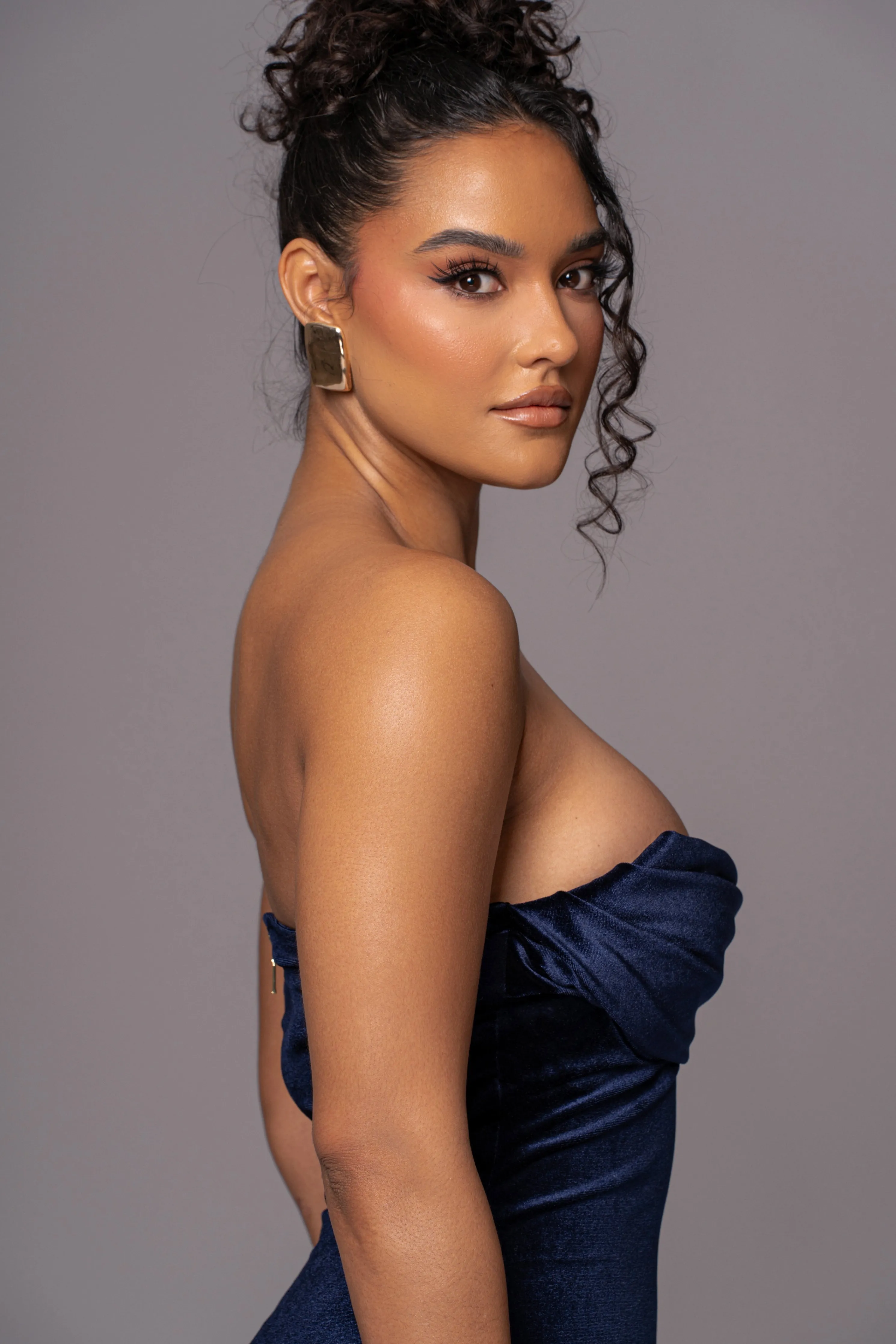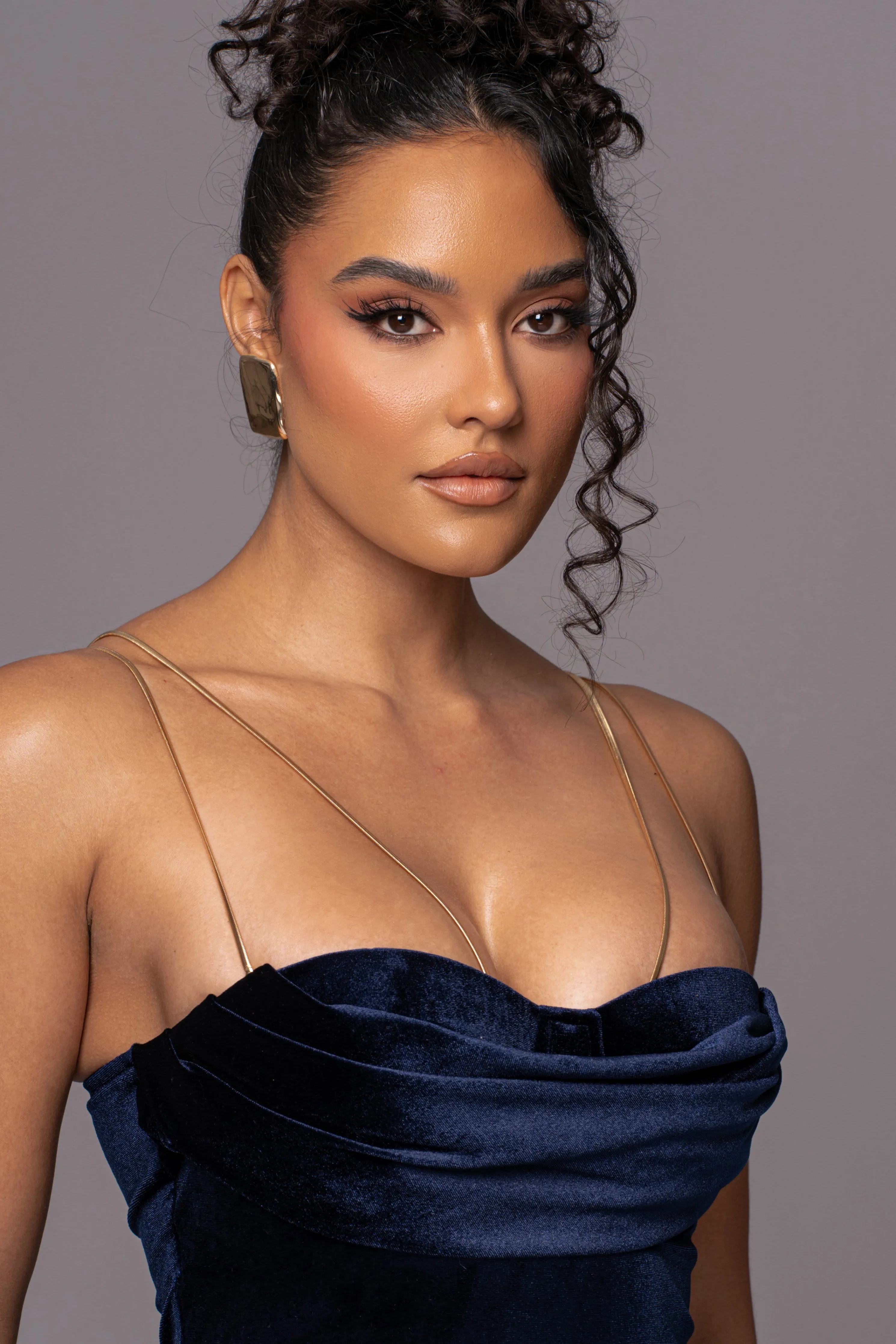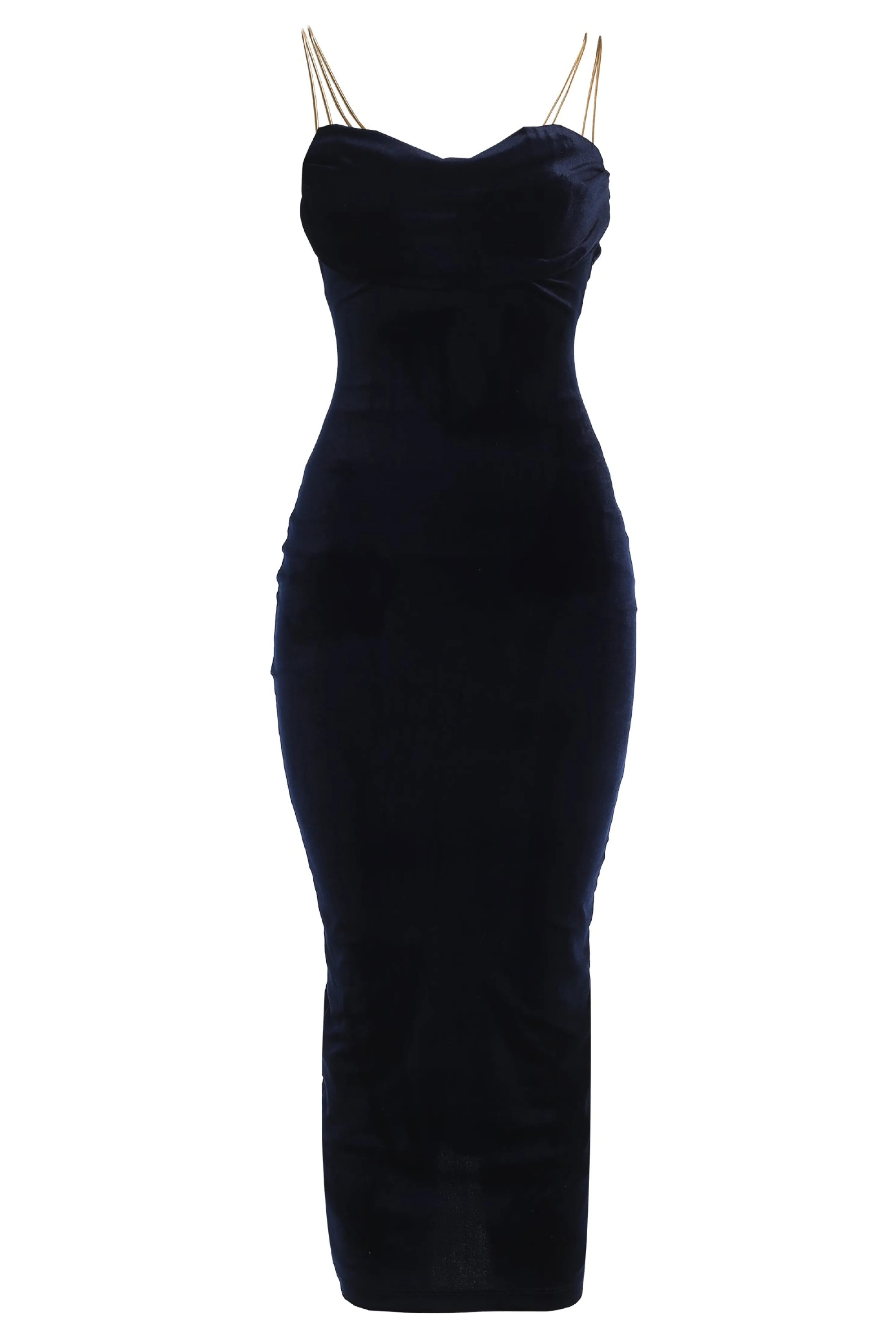 OurNavyJOSANNA VELVET MIDI DRESS is a statement on its own. We’ve taken one of our most loved designs “Visions Of You Midi Dress” and reimagined it in luxurious velvet, elevating its style for a modern twist. This midi dress features a sweetheart neckline with cowl detail, padded cup support, and grip silicone gel at the bust for a secure hold. Removable/adjustable chain shoulder straps dipped in a gold-tone elevate the look offering more than one styling options. Hidden back zipper closure. Stretchy. Double lined.
