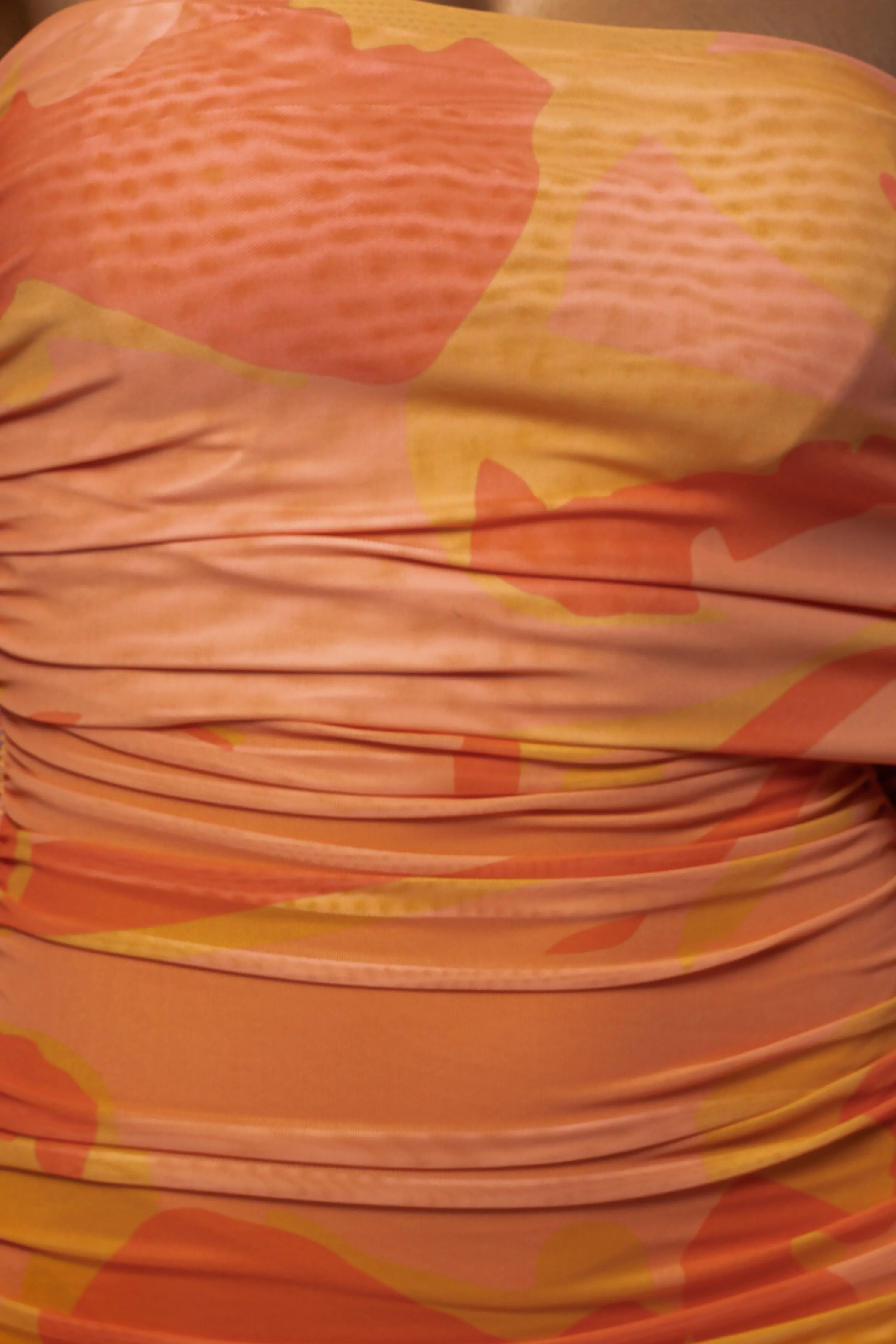 Make your entrance in our Orange Capri Ruched Dress! We’ve taken our best seller the DeniseRuched Dress andrecreated an all new designina tropical print for a summer touch. Featuring a one shoulder neckline with full arm coverage, a padded bust, and beautiful ruching throughout with acenterback slit at the hem to finish the look. Fully lined. Stretchy.