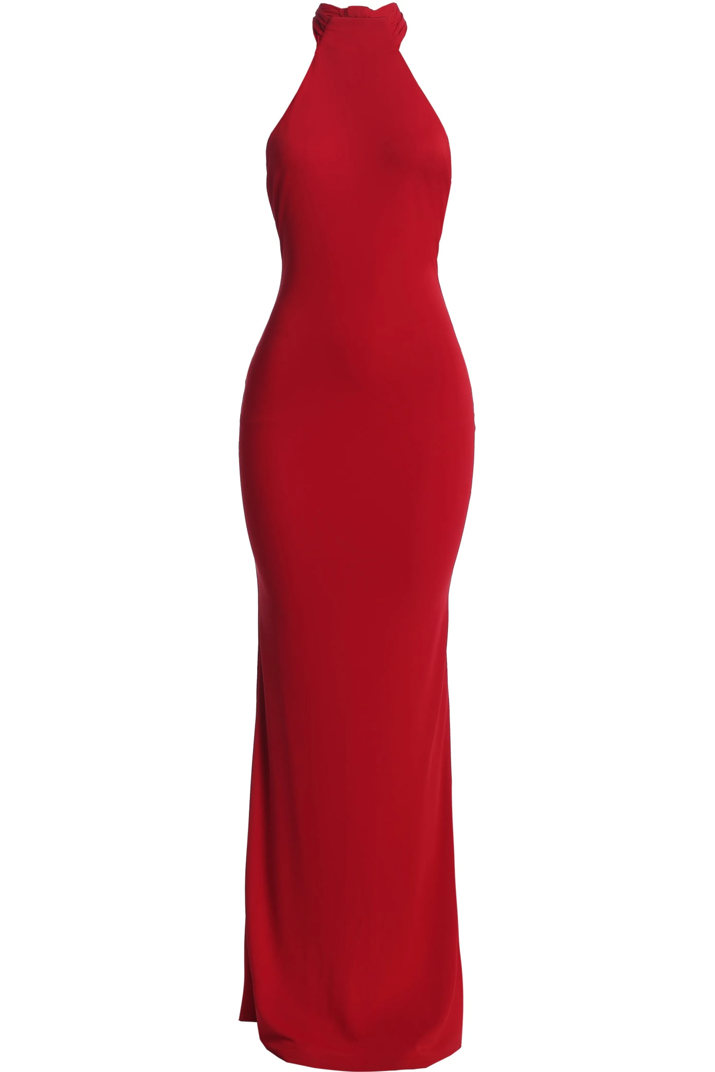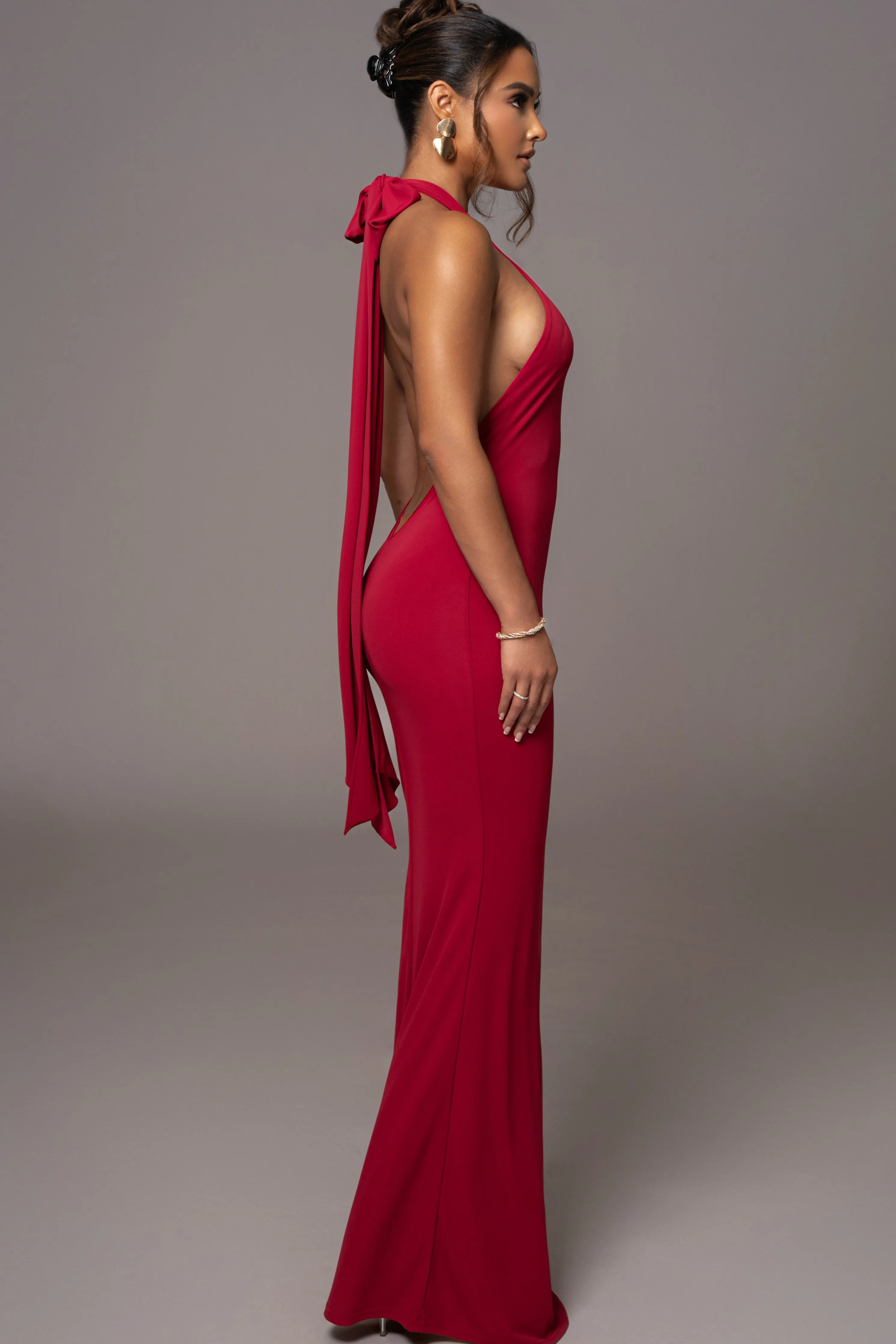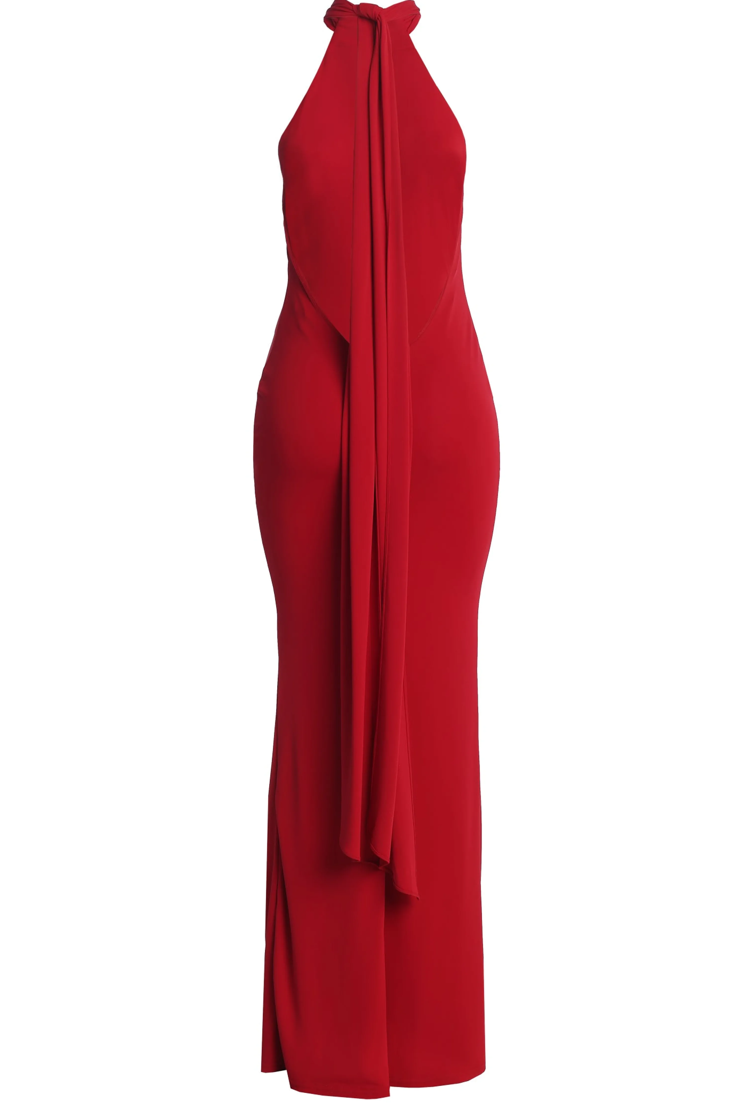 Be a vision of elegance in our Red Golden Evening Maxi Gown. This stunning piece features long neck ties that cascade beautifully down your back and a bold backless design that adds the perfect finishing touch. The fitted silhouette effortlessly transitions into a captivating mermaid hem.Double lined. Stretch.