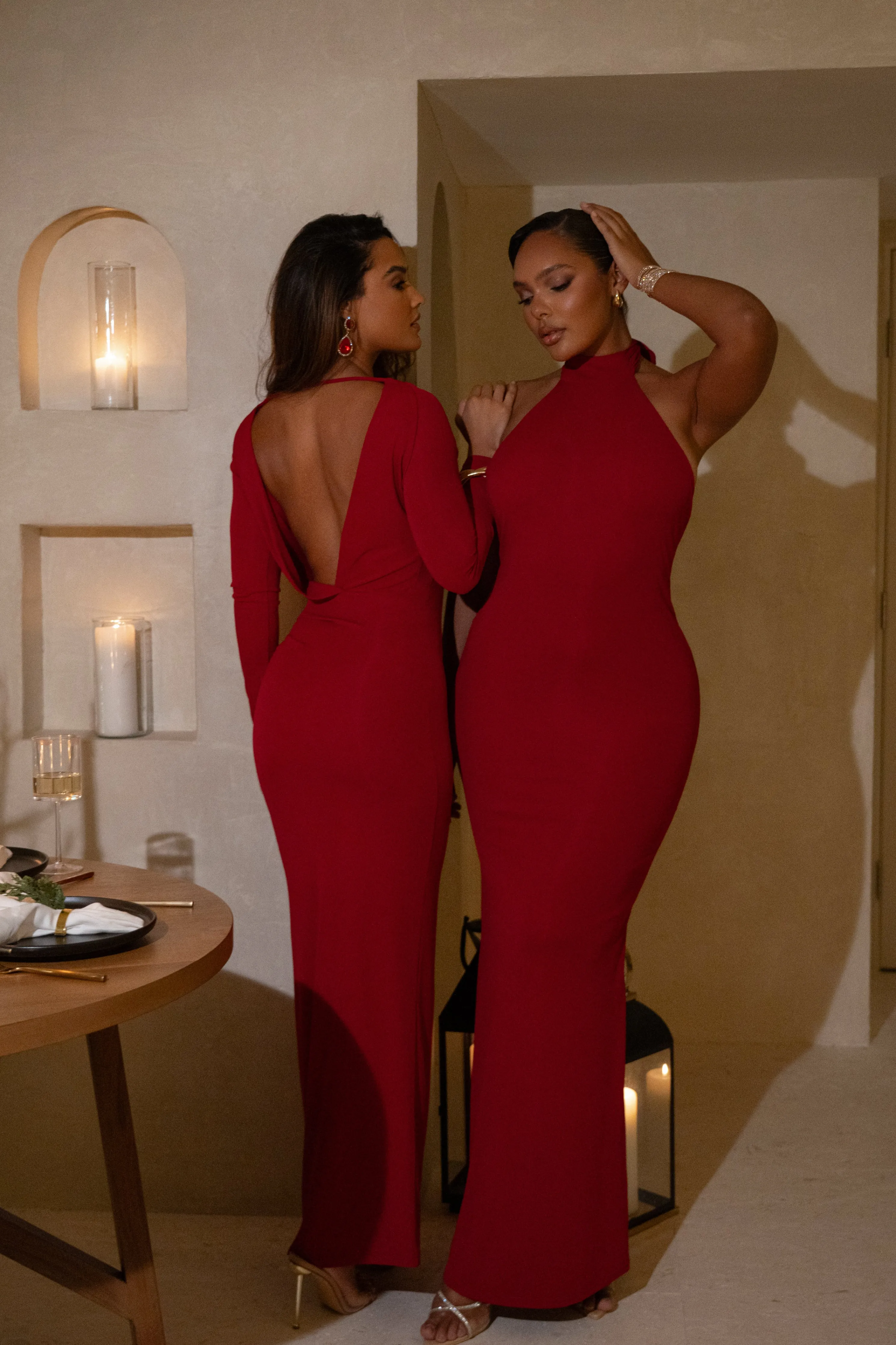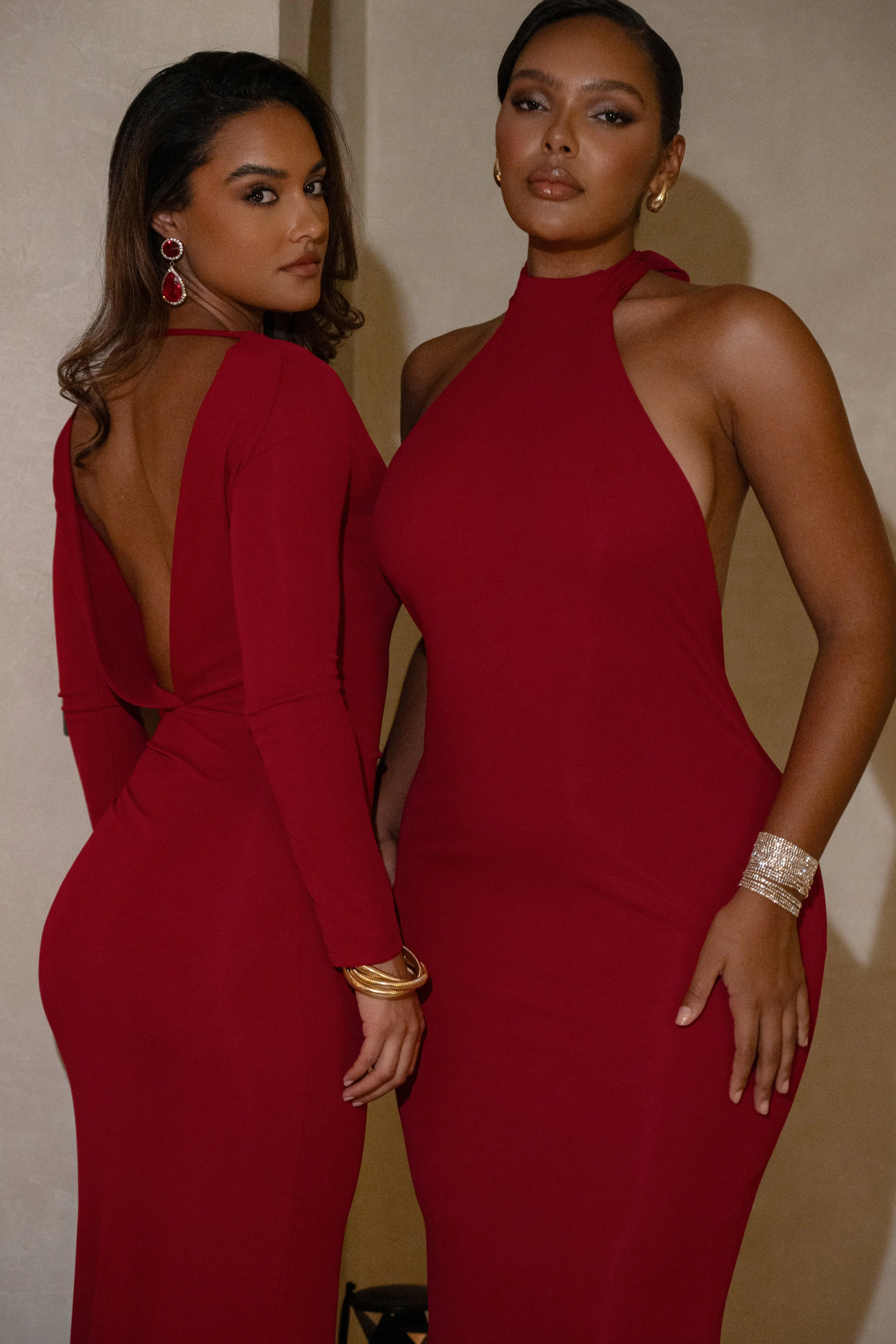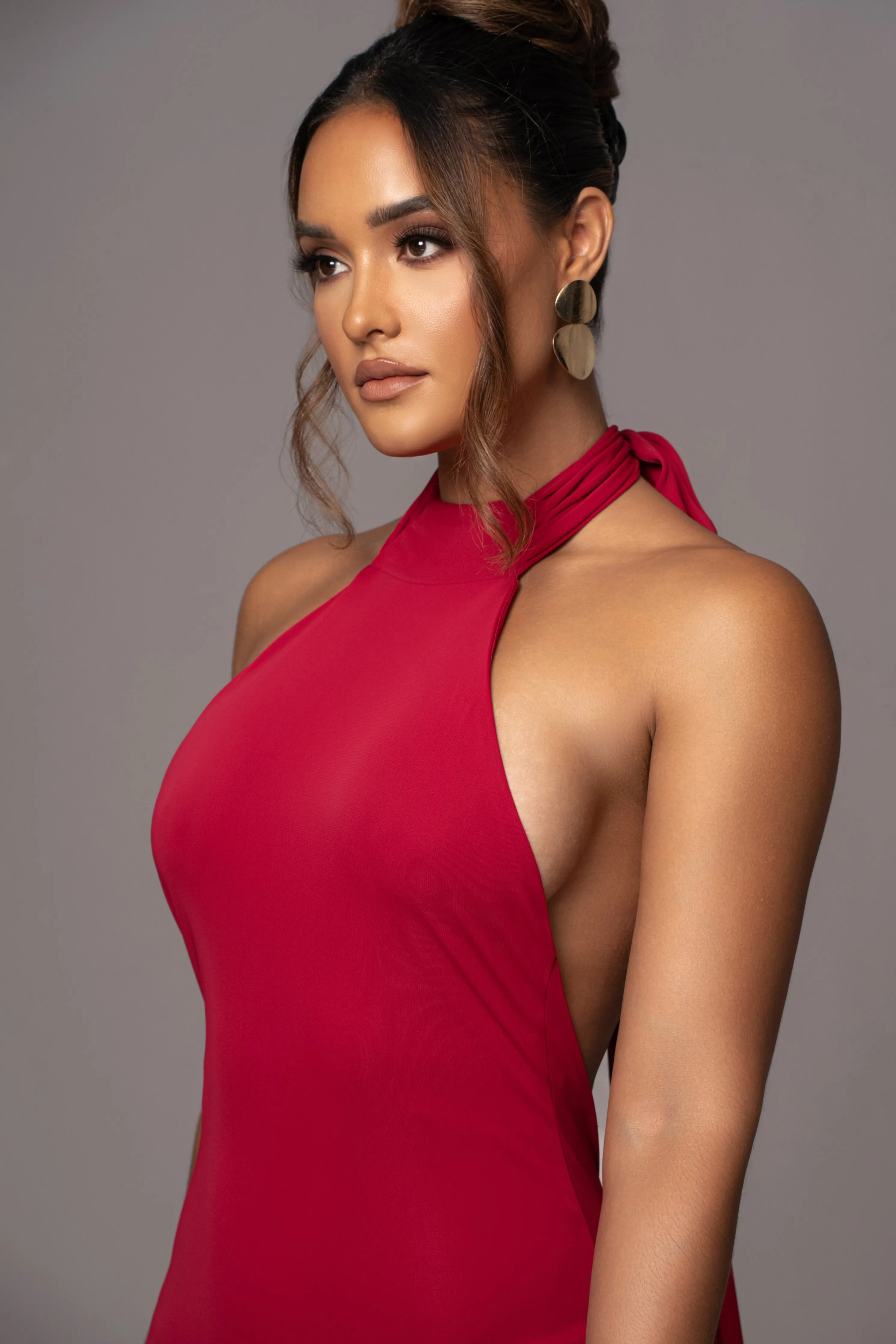 Be a vision of elegance in our Red Golden Evening Maxi Gown. This stunning piece features long neck ties that cascade beautifully down your back and a bold backless design that adds the perfect finishing touch. The fitted silhouette effortlessly transitions into a captivating mermaid hem.Double lined. Stretch.