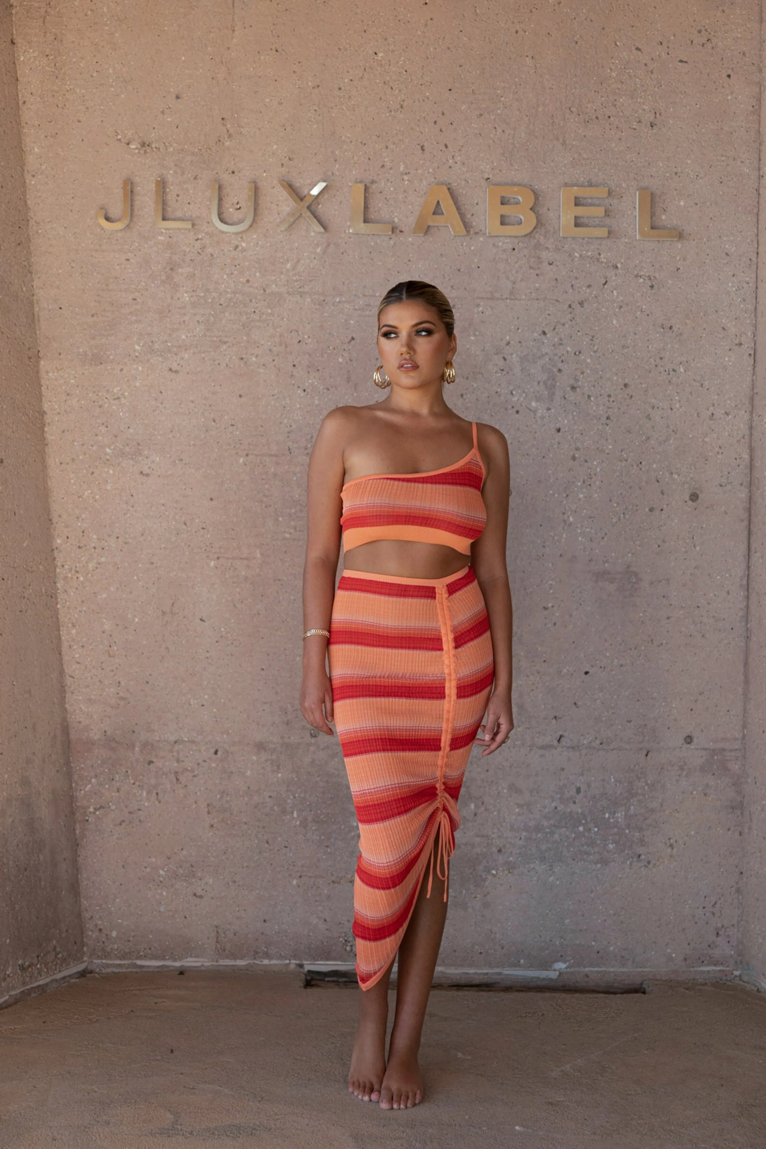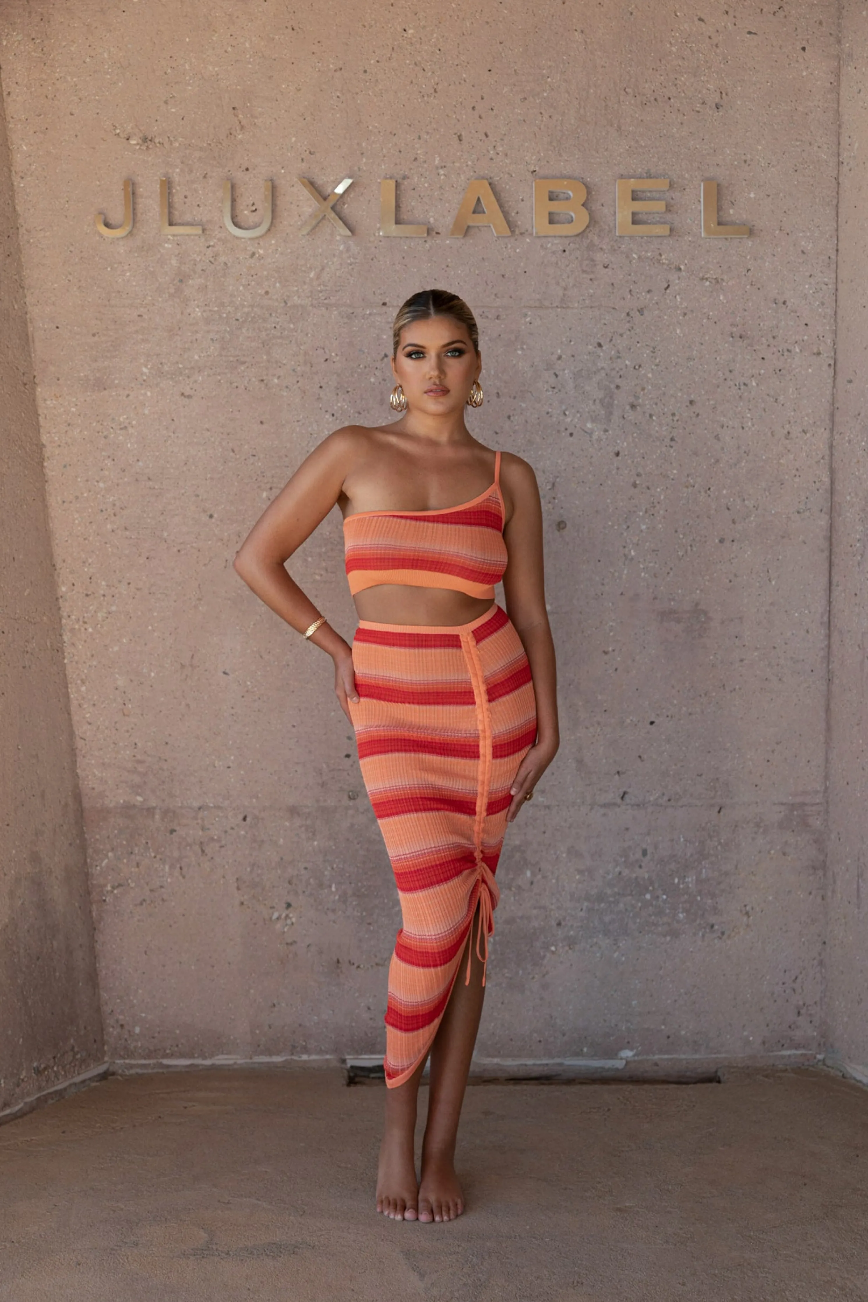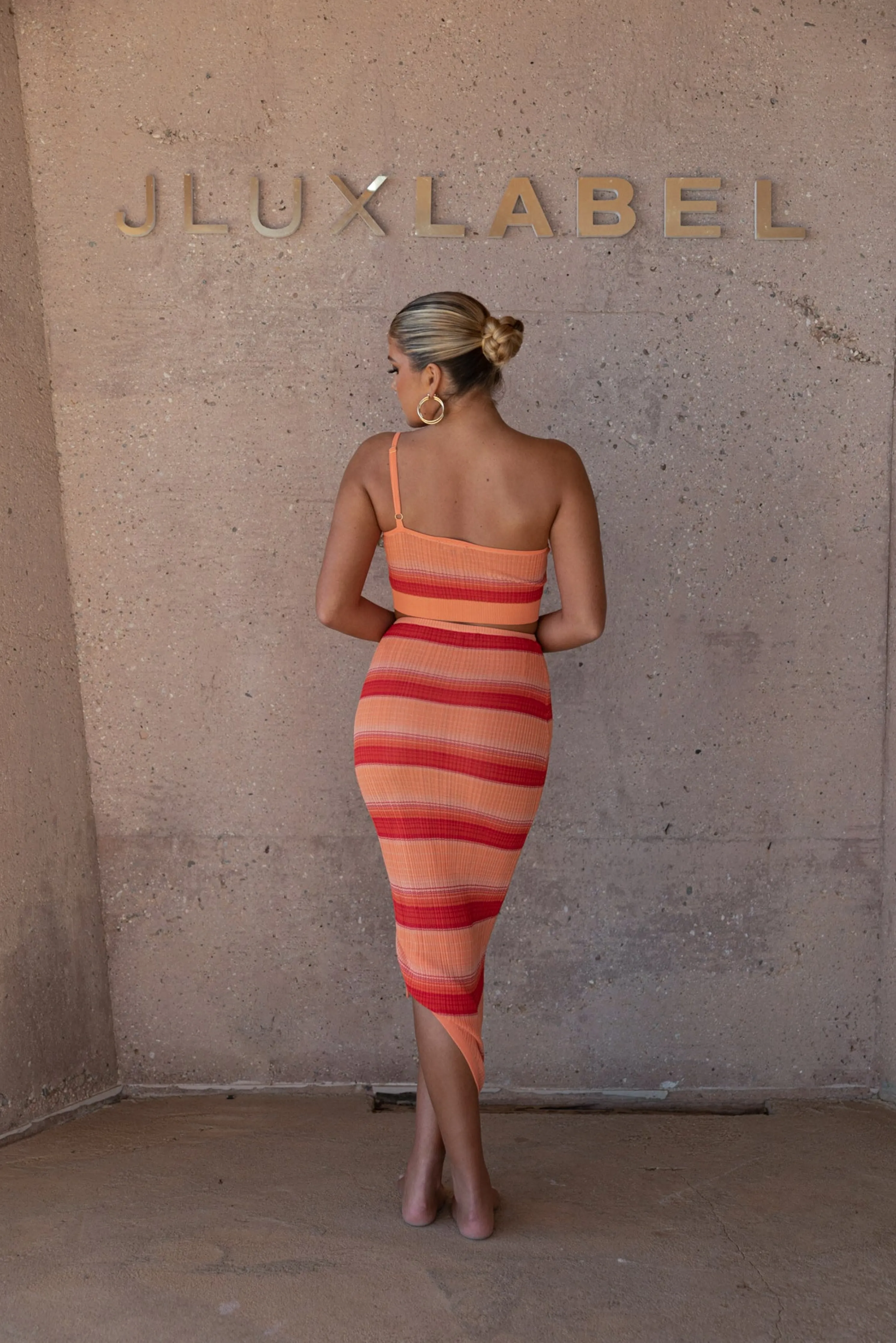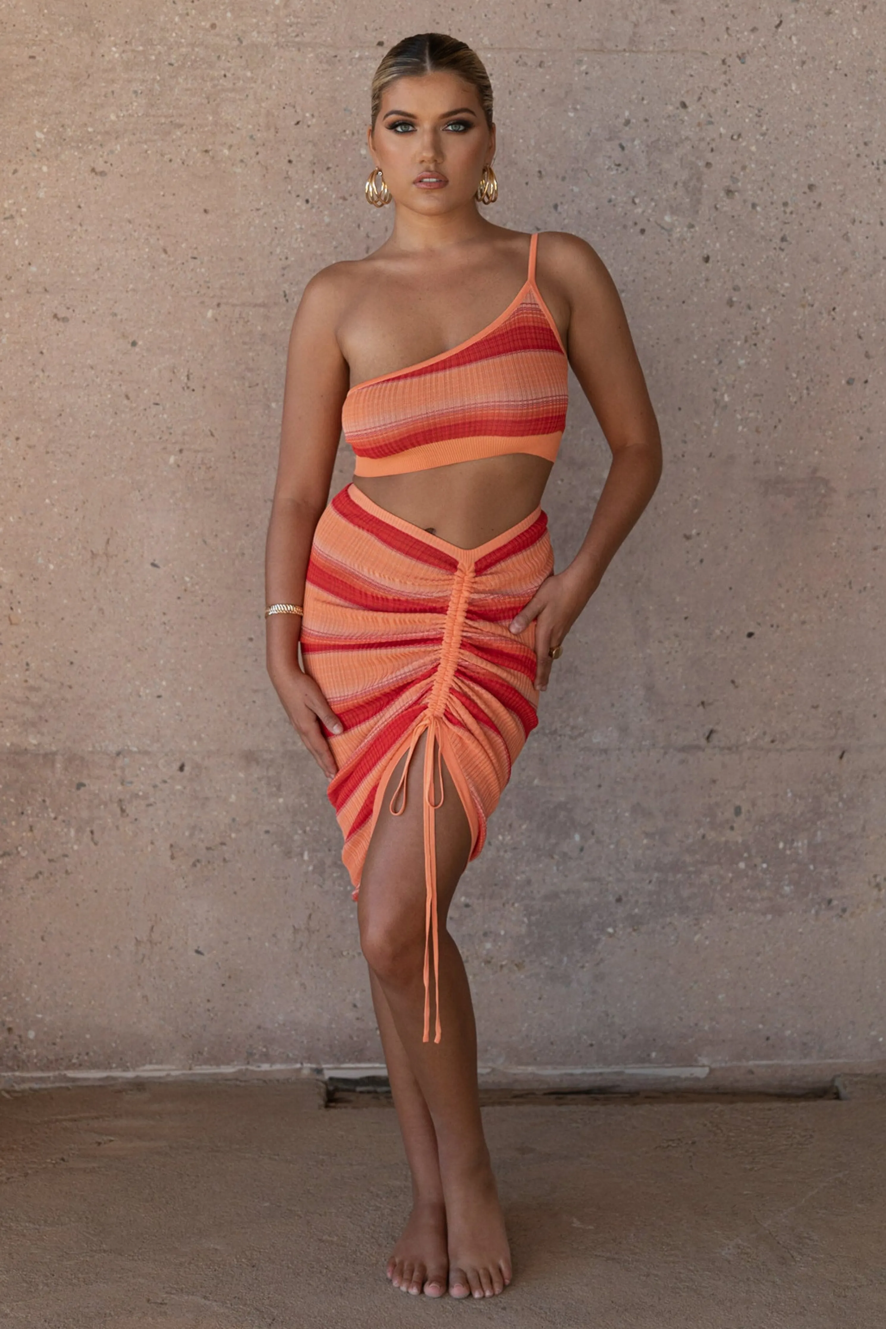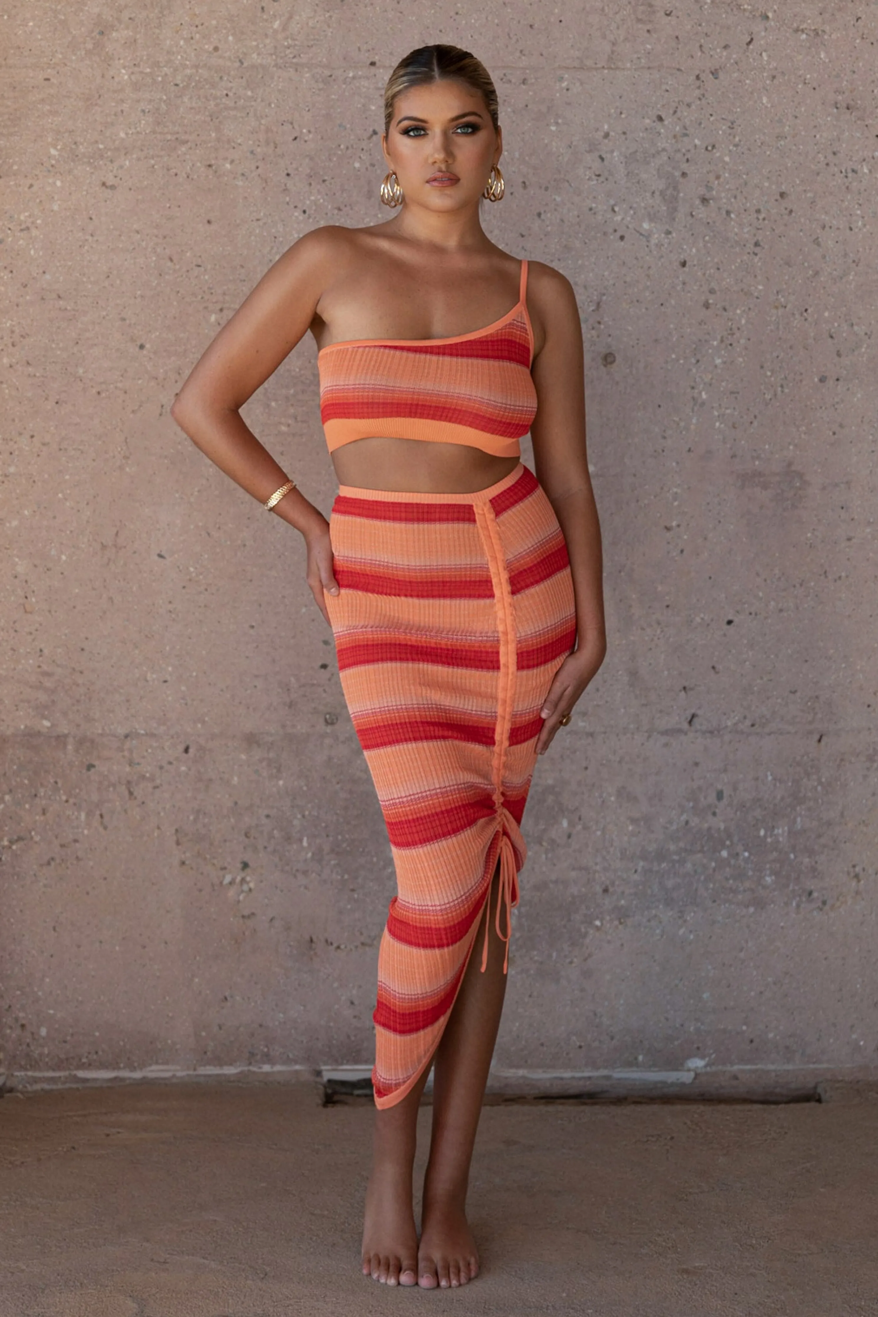 Head out for some fun in the sun with ourRed Good Times Crop Top. This trendy lightweight top features a one shoulder neckline with an adjustable strap and cropped hem. A striped pattern throughout adds a playful element in vibrant hues. Pair with our Acting Out Midi Skirt for the full look. Stretchy. Semi Sheer.Not sold as set.