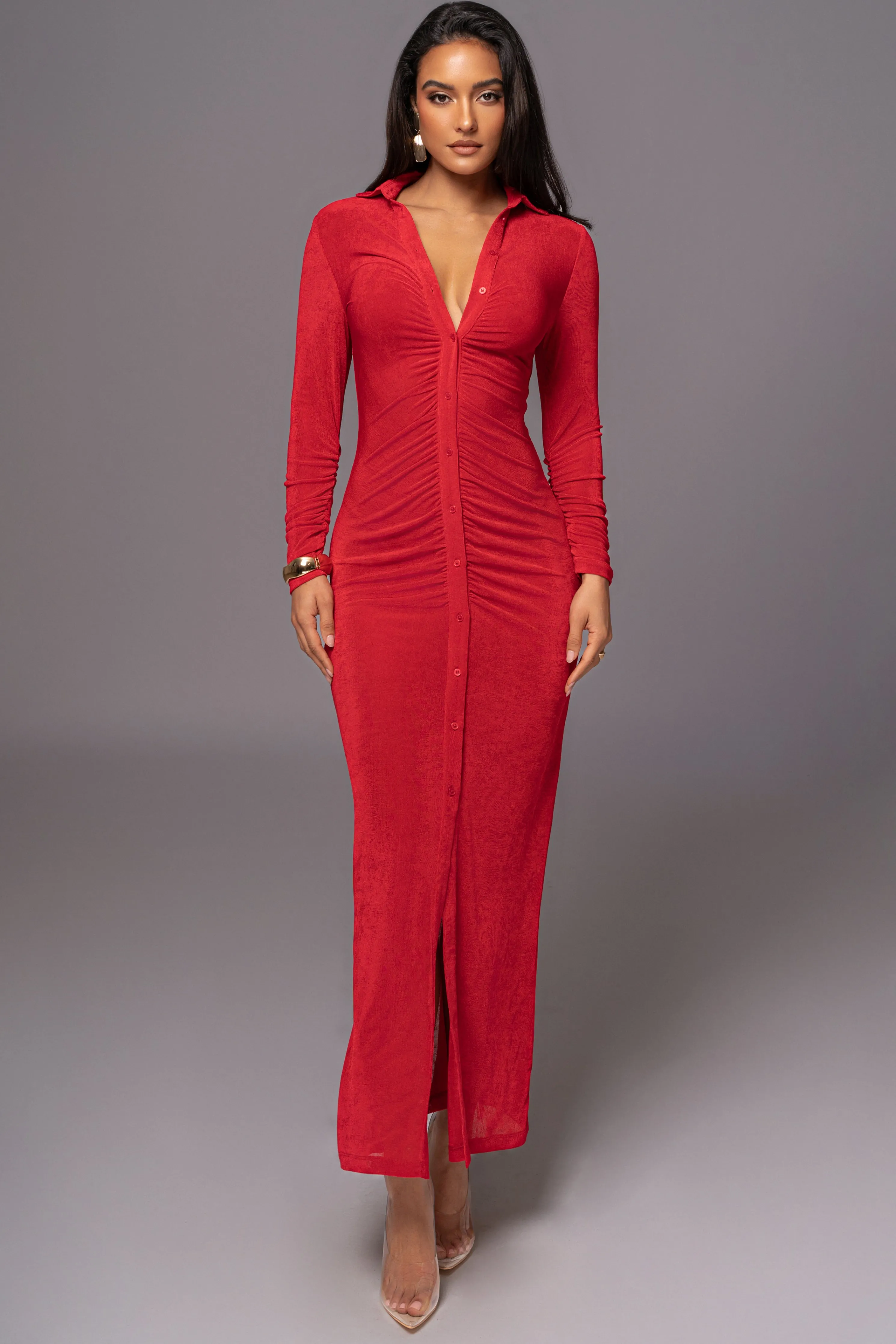 Welcome the new season in style with our Red Zahra Button Front Maxi Dress. This stylish maxi dress features a collared neckline with long sleeve arms, button front closure, and a maxi hem. Constructed from a stretchy slinky material with comfort in mind. Single lined.