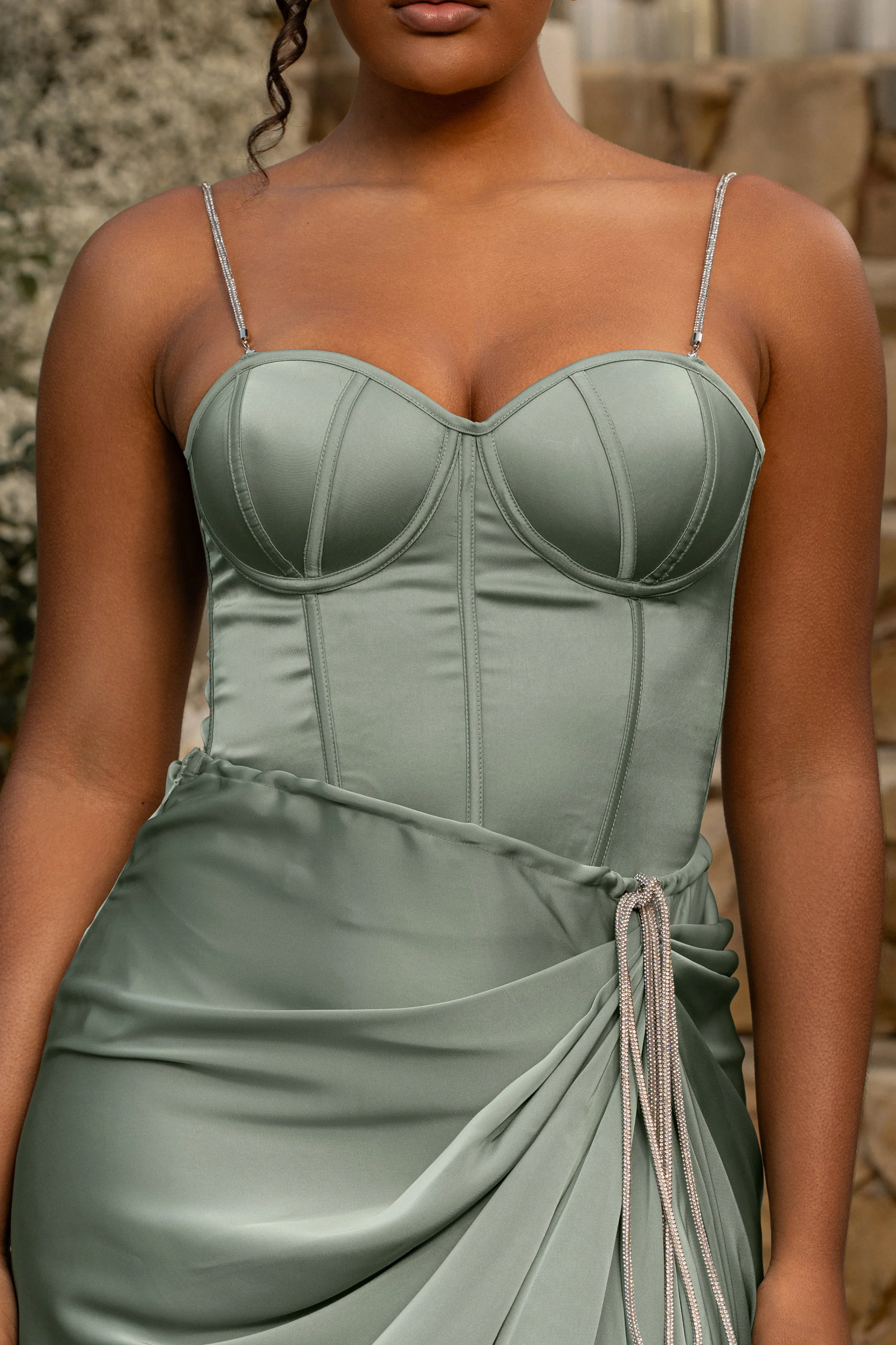 OurSage Leo Matte Satin Bustier is the only top you need this season. Crafted with luxurious satin, this corset provides flattering structure with built-in boning, bra padding, and adjustable hook and eye closure. Delicately finished with adjustable/removable rhinestone shoulder straps, this exquisite piece was made for event season. Pair with our Olea Satin Skirt for the full look. Minimal stretch.