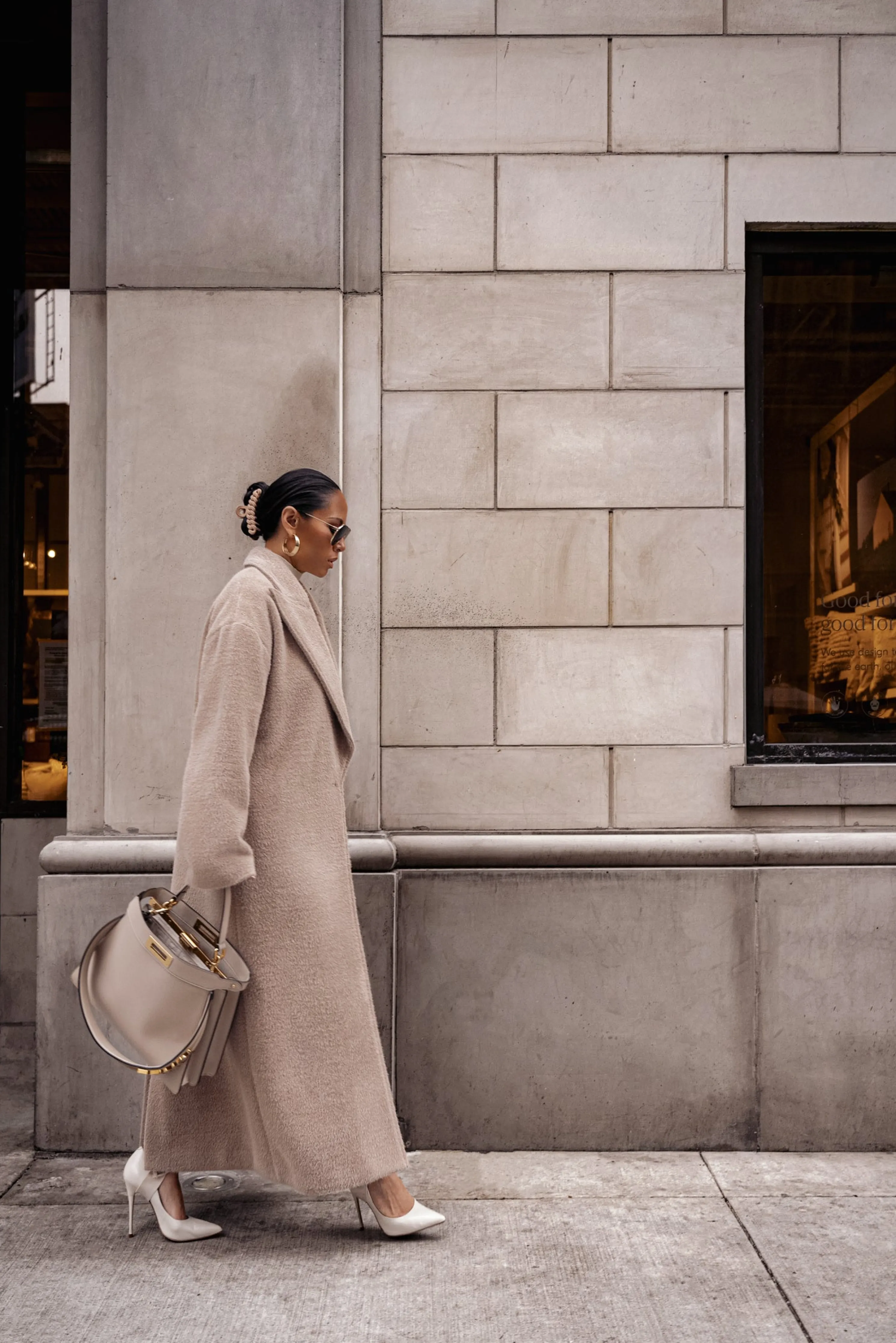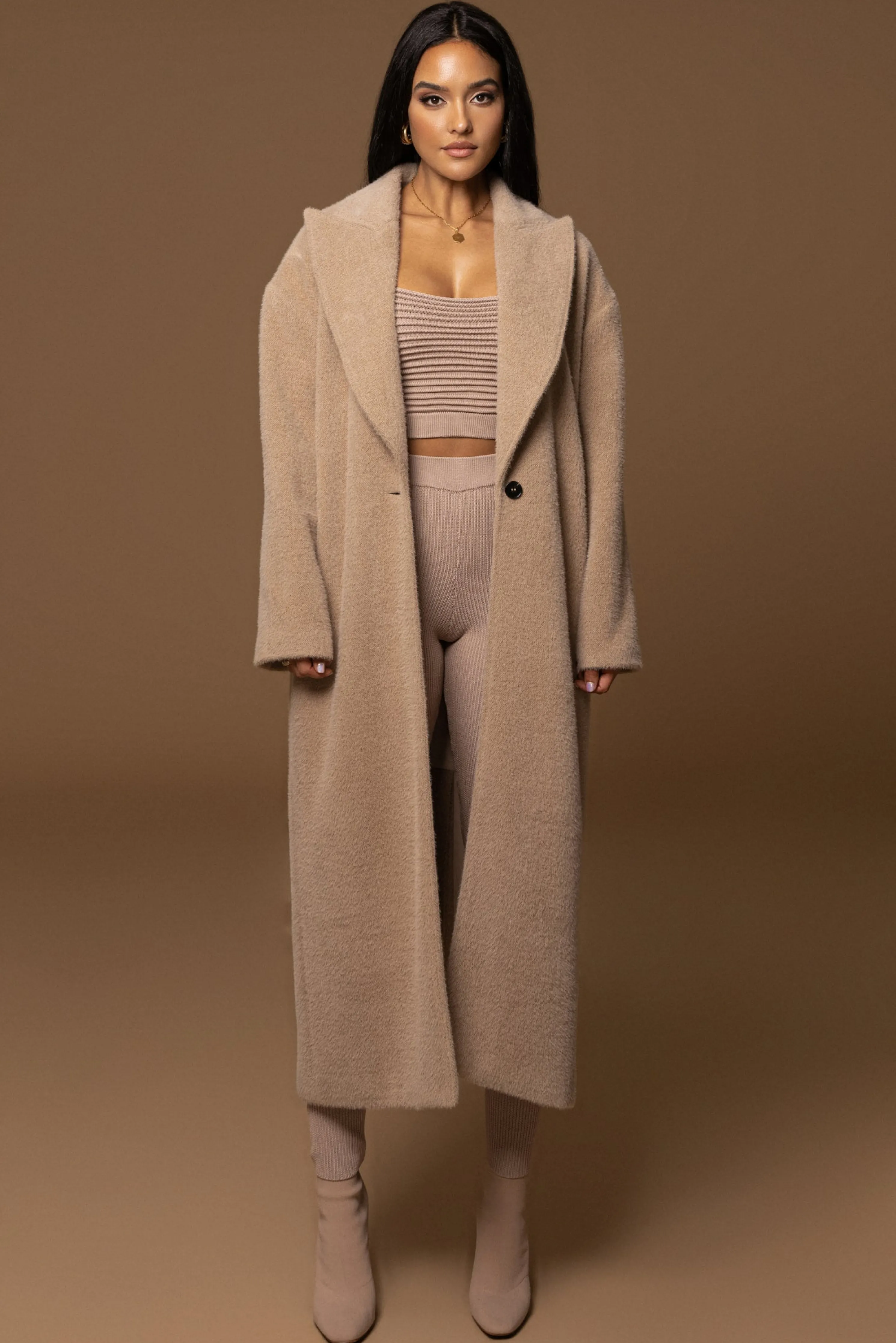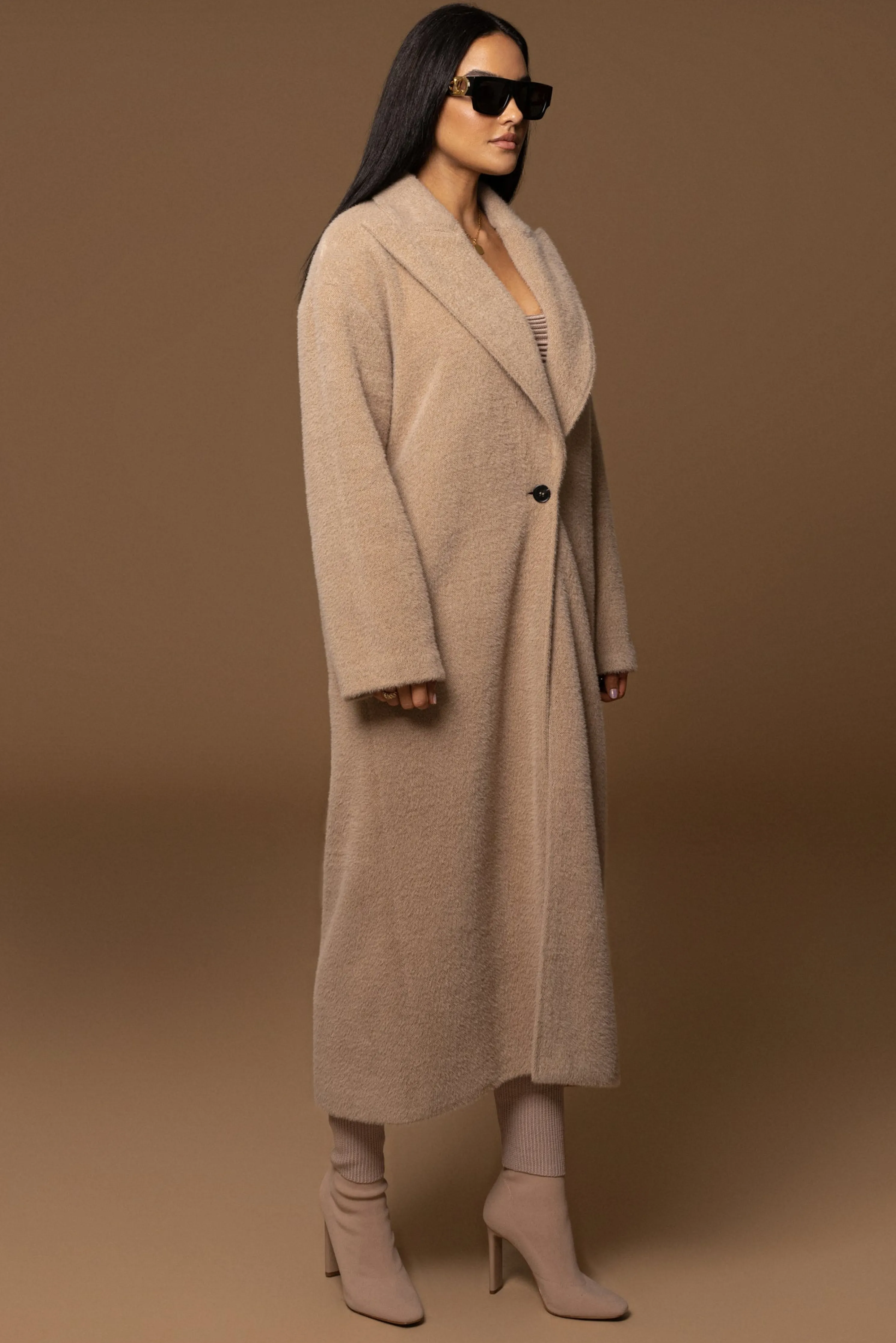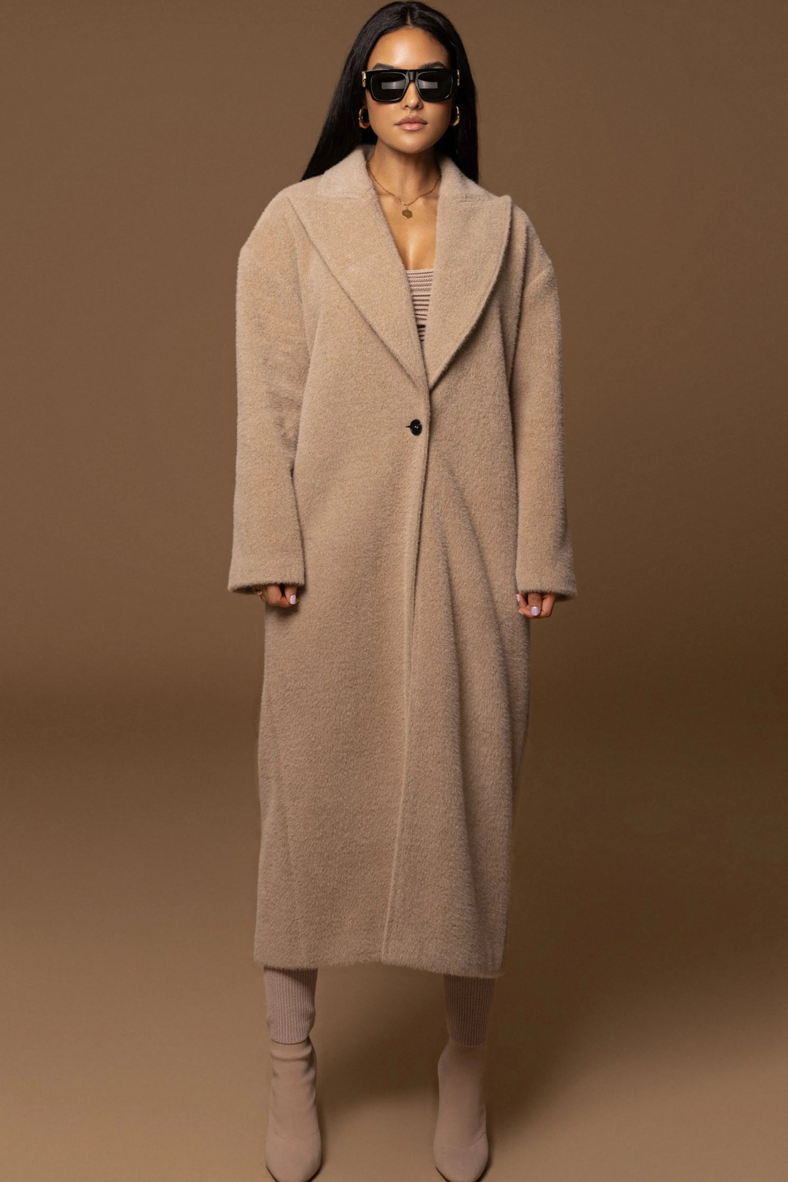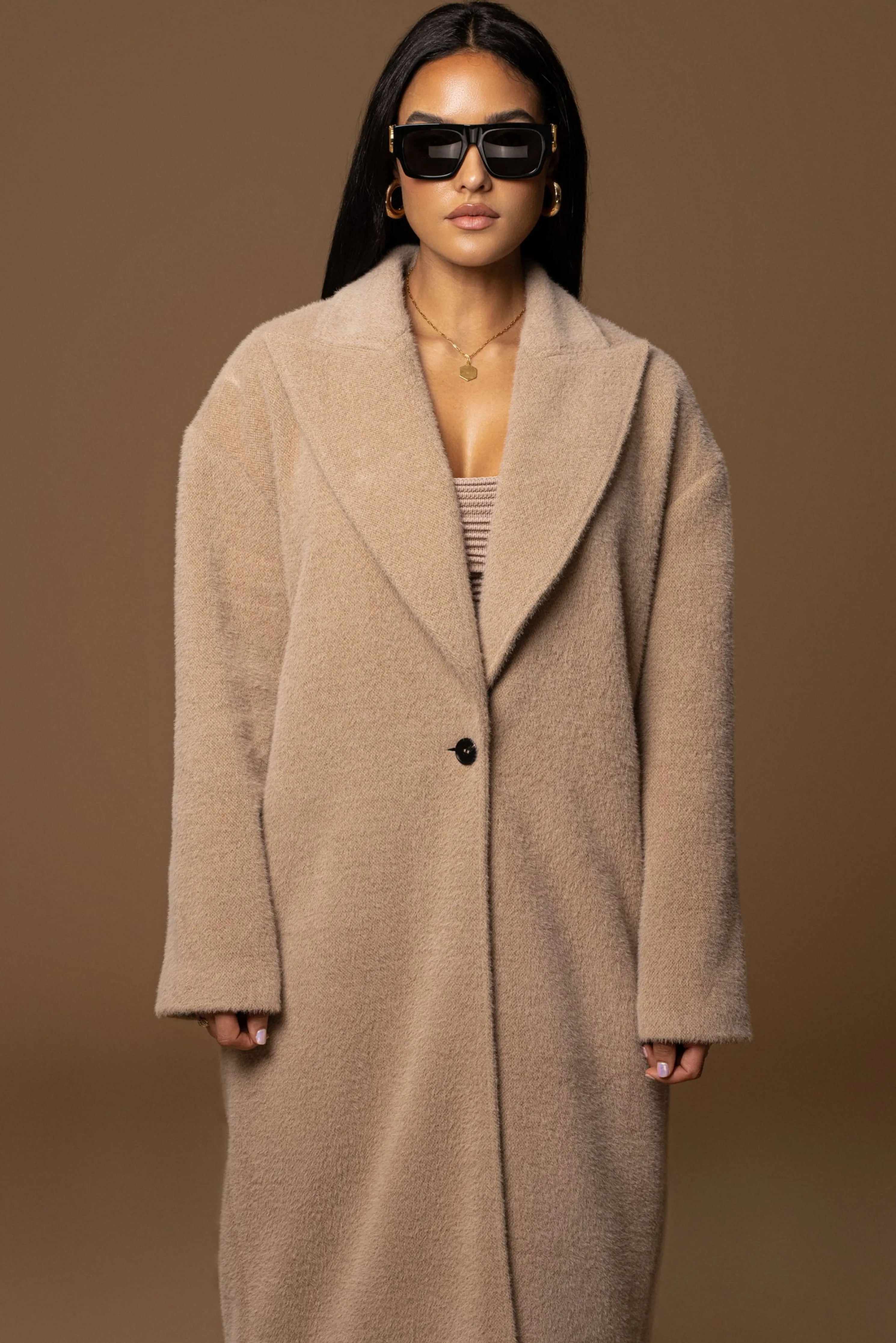 TheSand Chelsie Longline Coat is the most elegant layering piece of the moment. This elevated longline coat is designed in soft fuzzy fabric and features stylish notch lapels, long-sleeve arms, and a double-breasted front with two functional side pockets. Lined interior. Over-sized.