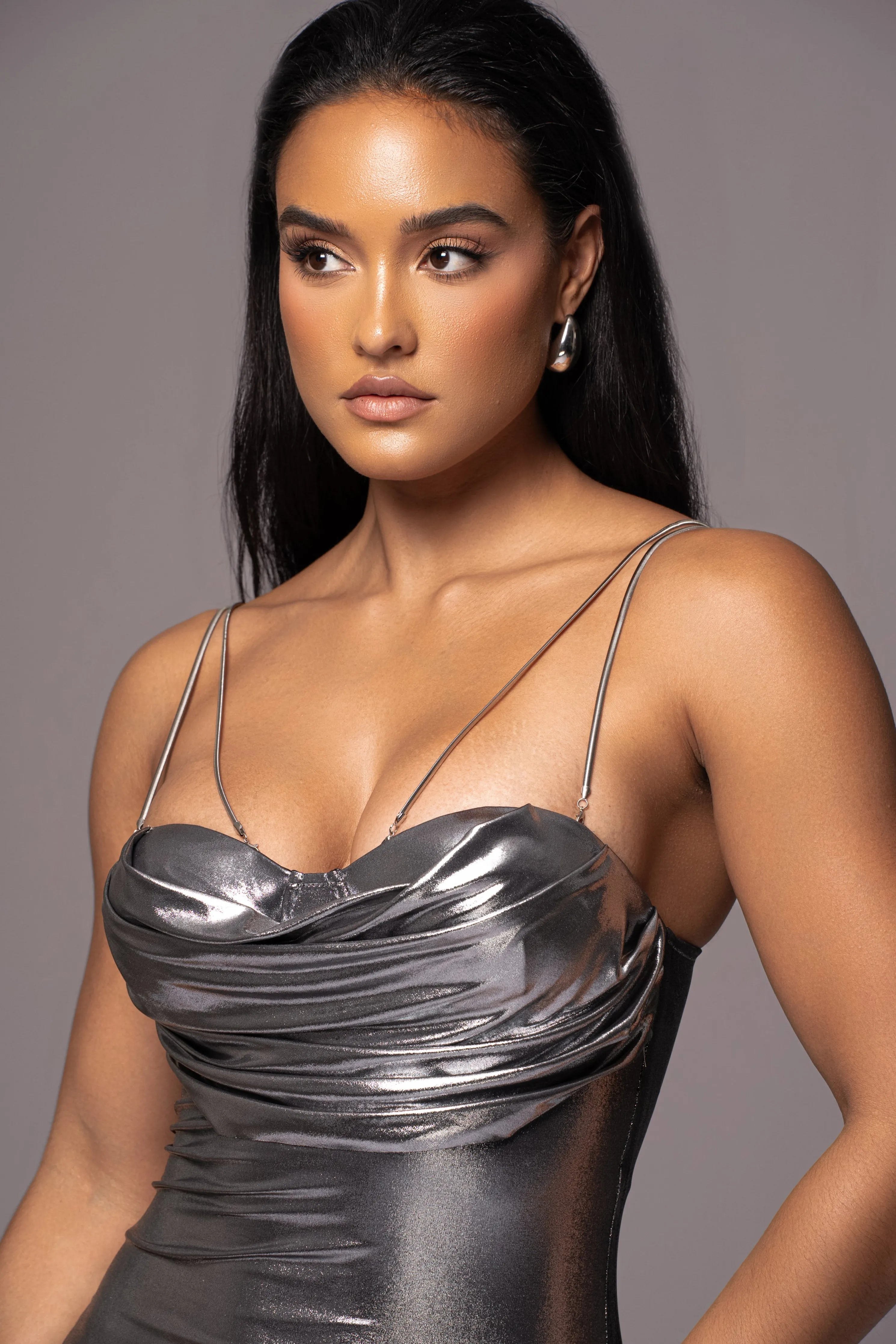Our Silver Visions Of You Midi Dress is a statement on its own. This form-fitting midi design is crafted in a rich metallic fabrication radiating shine from all angles! Featuring a sweetheart neckline with cowl detail, padded cup support, and elegant gold-metallic straps that can be removed for an optional strapless look. Complete with grip silicone gel at the bust for a secure hold. Back zipper for closure with split hem. Stretchy.
