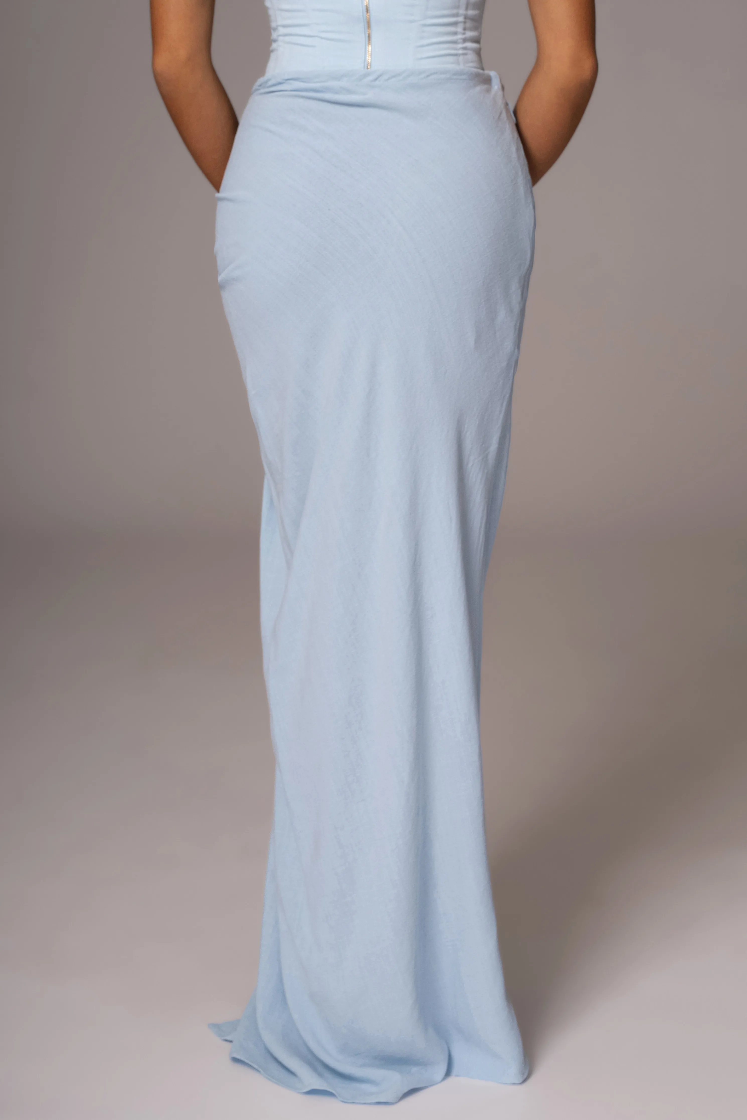 Draped to perfection proving life’s better in linen with our, Sky Blue Noelia Linen Slit Skirt. Crafted in a fresh linen material, this maxi skirt features a drape design with a stylish rope drawstring and a slit on the side. Hidden side zipper for closure. Pair with our FENIX LINEN CORSET for a full look. No stretch. Single lined.