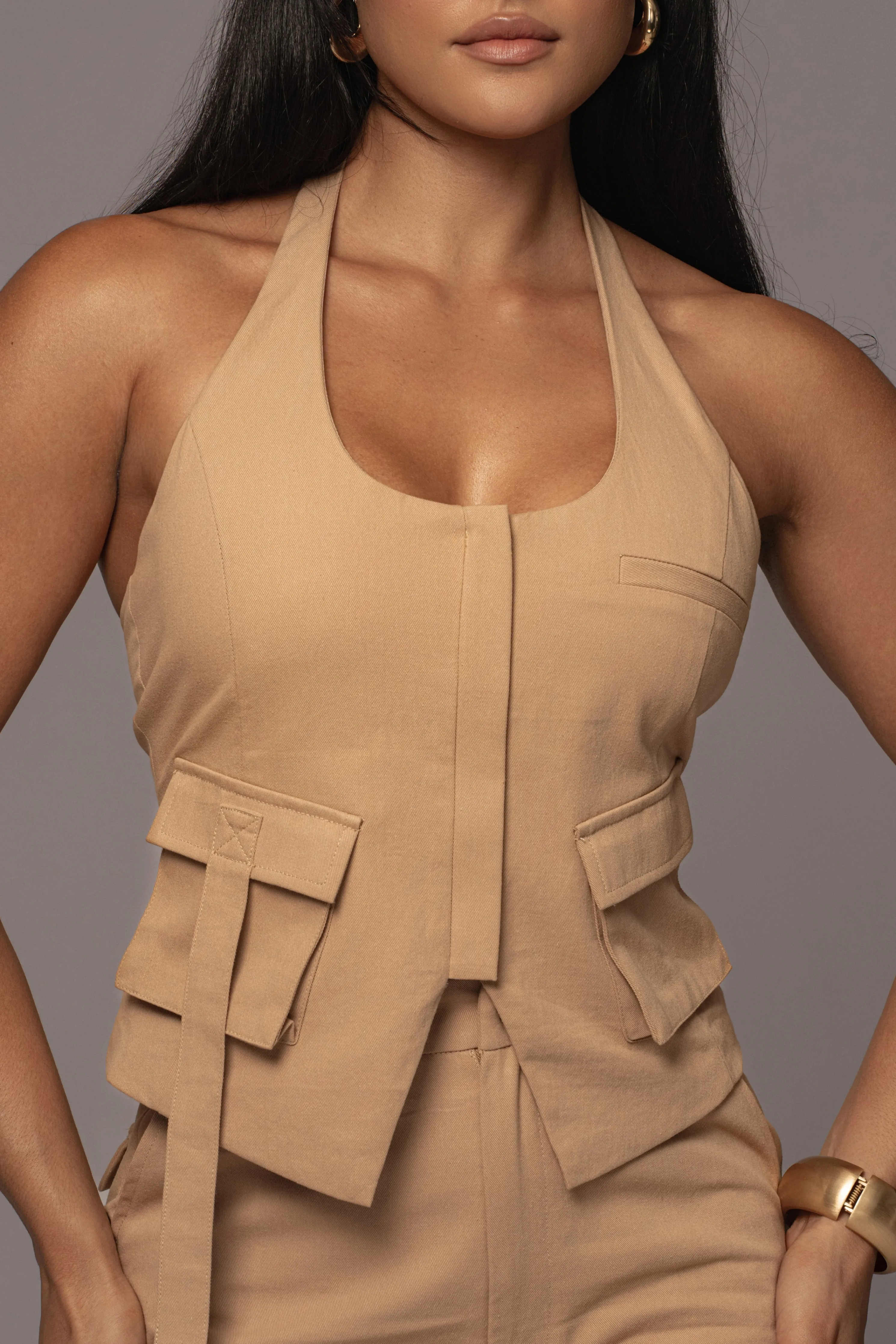 Our Tan Aeris Pant Set is a match made in heaven. This vacation ready pant set features a halter top with stylish cargo pockets and front zipper closure. The matching pants feature straight leg hems with front button/zipper closure, functional side/back pockets, and cargo pockets for added functionality and style. Elastic waistband. No stretch. Sold as set. Top is double-lined, Pants are single-lined.