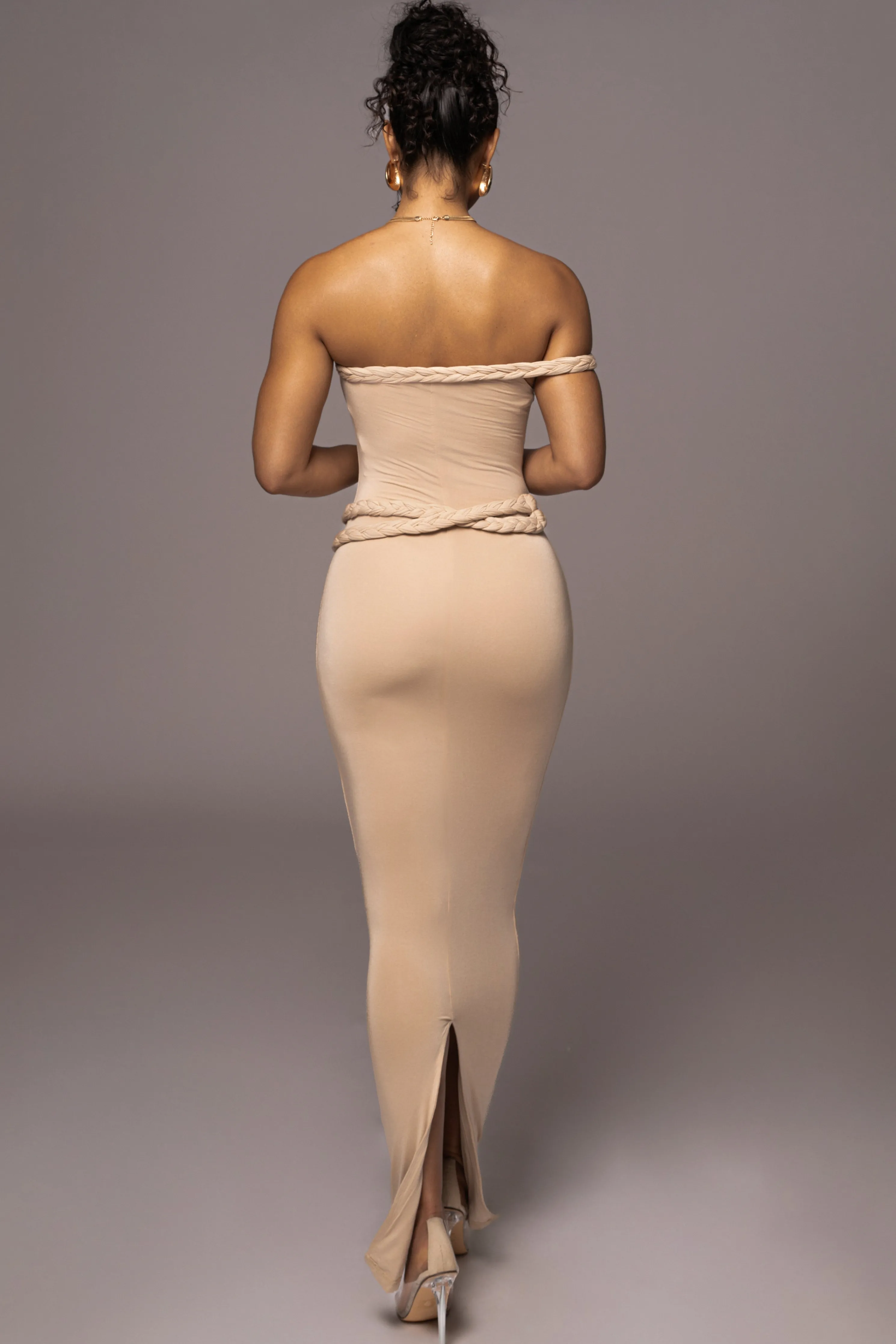 OurTan One Of One Maxi Dress is crafted from our signature Basix fabric in a sleek silhouette featuring a maxi hem and a one shoulder neckline adorned with beautiful braided detail. Complete with a removable waist belt adorned with braided detail and gold tone accent. Stretchy. Double lined.