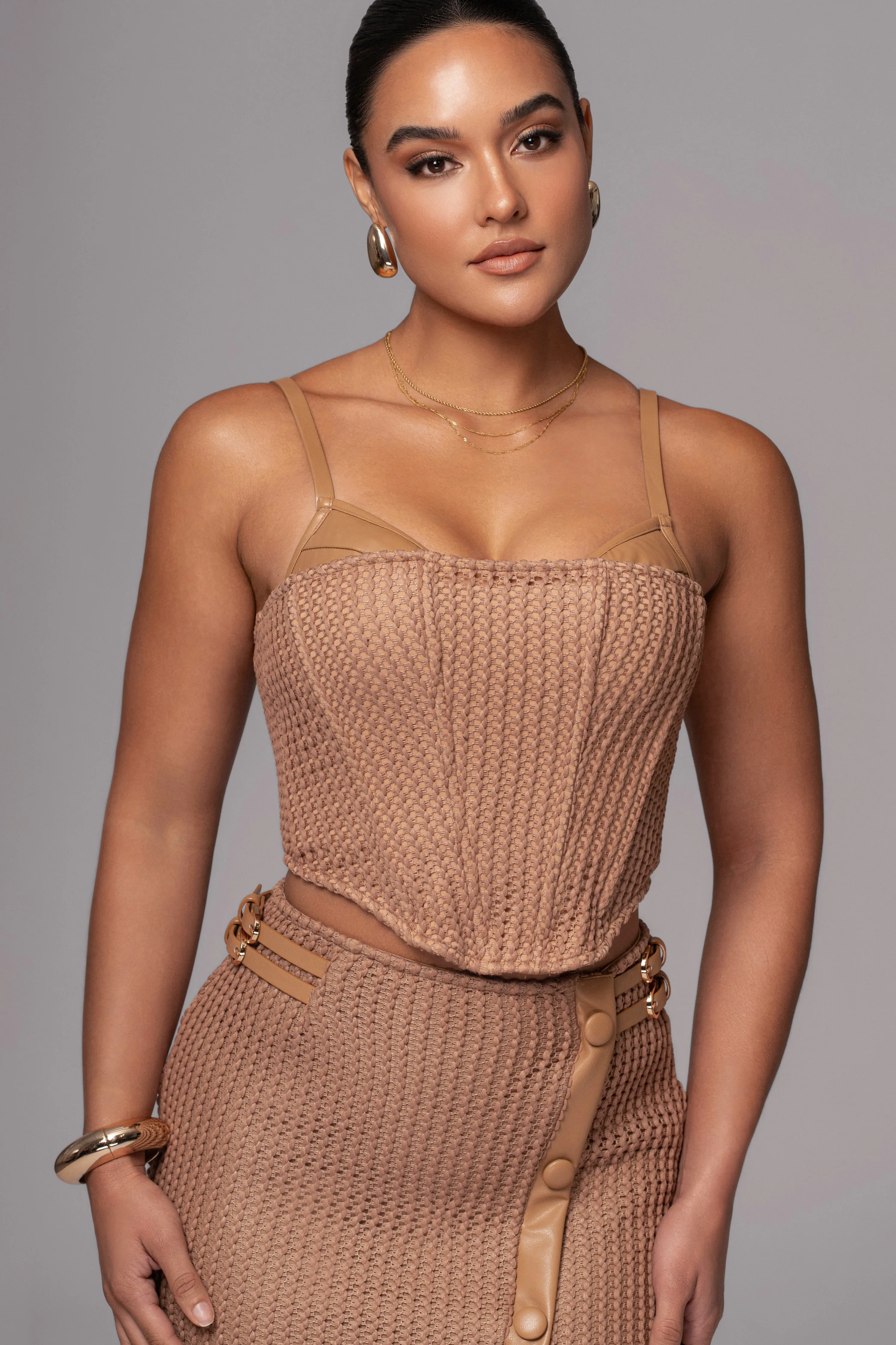 Add a bold touch to your winter wardrobe with our Tan Textured Harley Corset Top. This one of a kind top showcases a corset outer shell with PU leather-insert bra cups, adjustable shoulder straps detailed with belt holes and gold-tone accents, a curved hem, and a hidden back zipper closure. Complete with boning and padded bra cups for a flawless and structured fit. Pair with our Textured Mystique Midi Skirt for the full look. Double lined. Minimal stretch.