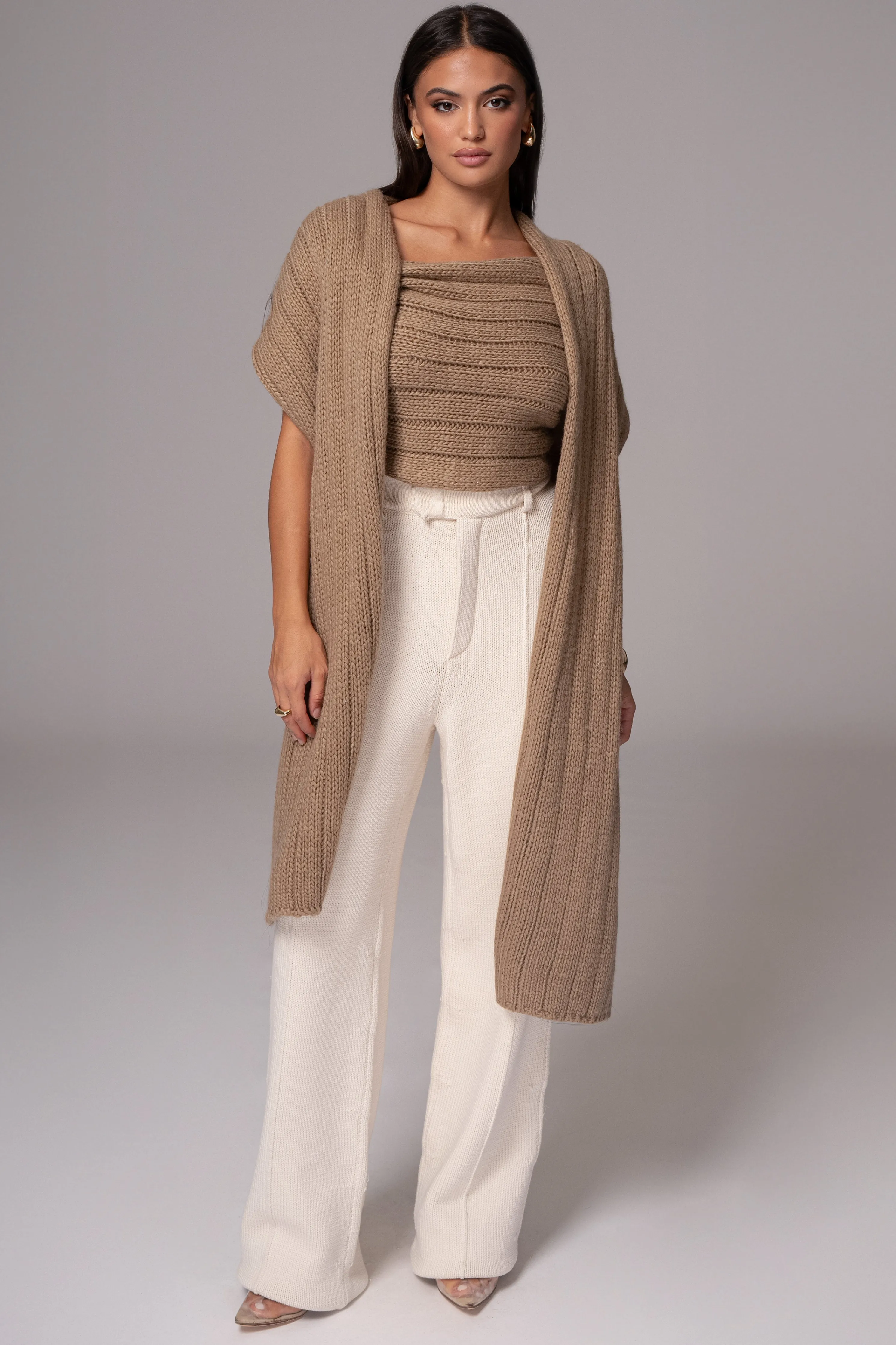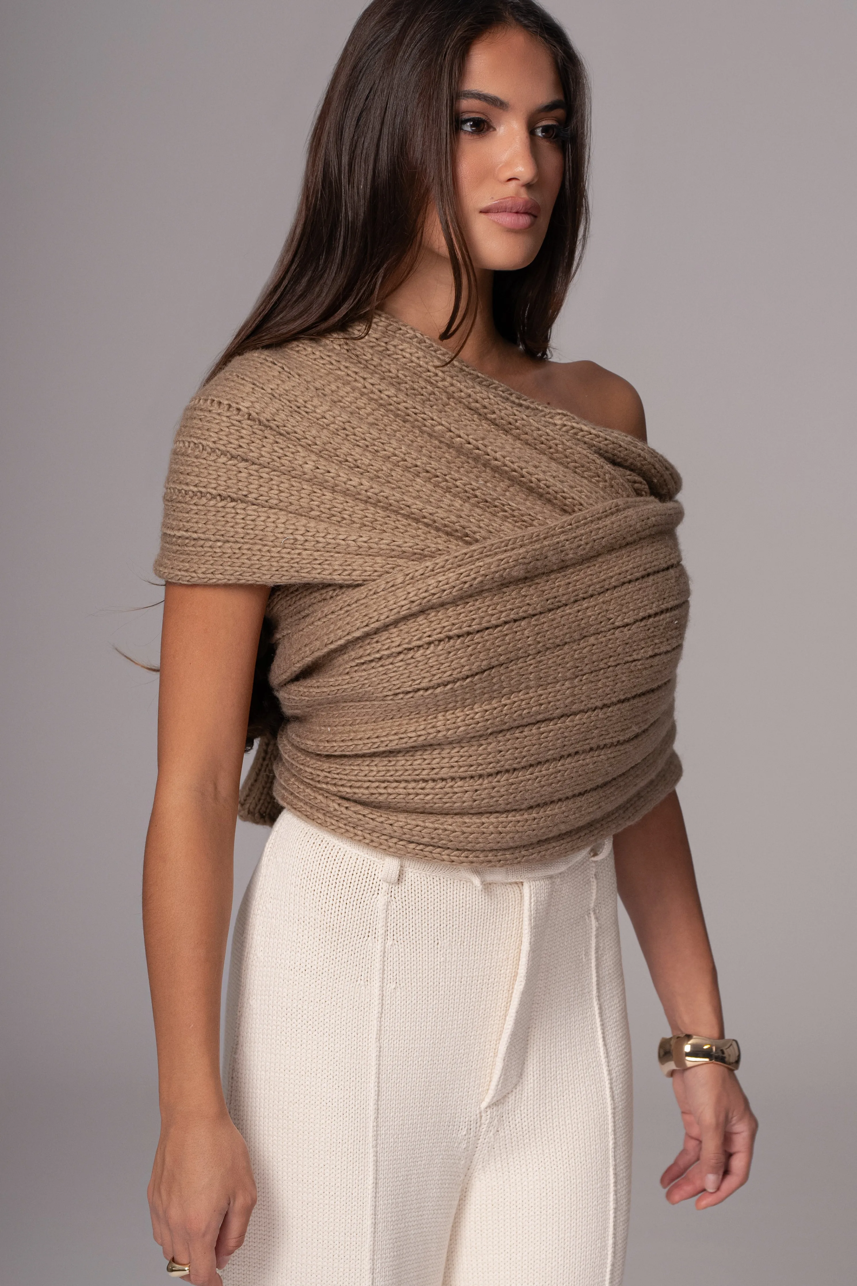 Enhance your Fall wardrobe with our Taupe Soft Life Sweater Knit Cable Top, designed for limitless styling options. Crafted from a soft cable knit fabric, this versatile wrap top allows for multiple styling variations, including a scarf-inspired neckline that elegantly drapes across the front. Pair with our Back In Business Knit Trousers for the full look. Single lined. Stretchy.