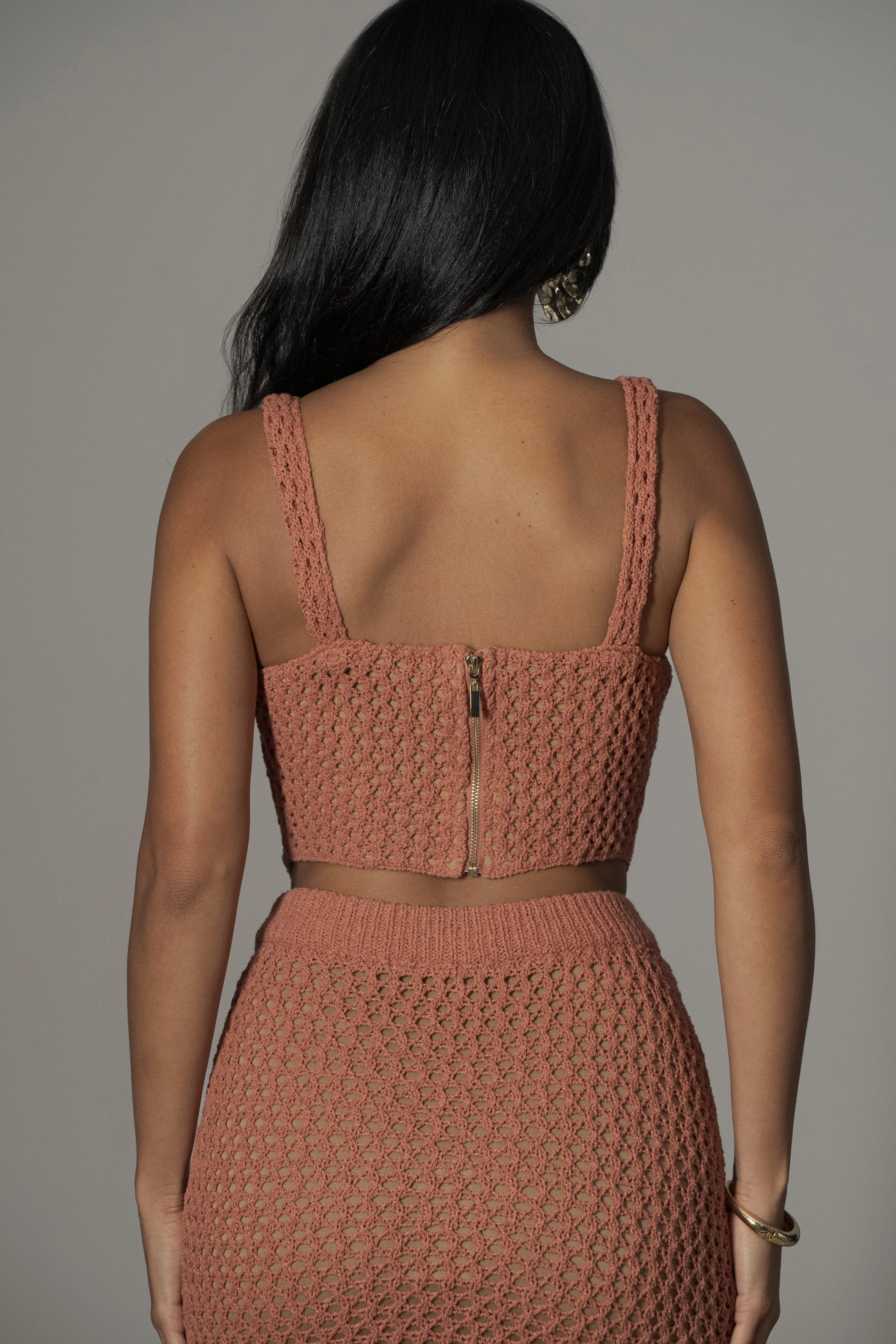 Get to and from the beach in versatile style with our Terra Cotta Sea Depths Maxi Skirt. Crafted from a knit crochet fabric, this maxi skirt comes with an elastic waistband and fitted silhouette. Pair with our Beachside Crochet Bustier for the full look. Lined interior. Stretchy.