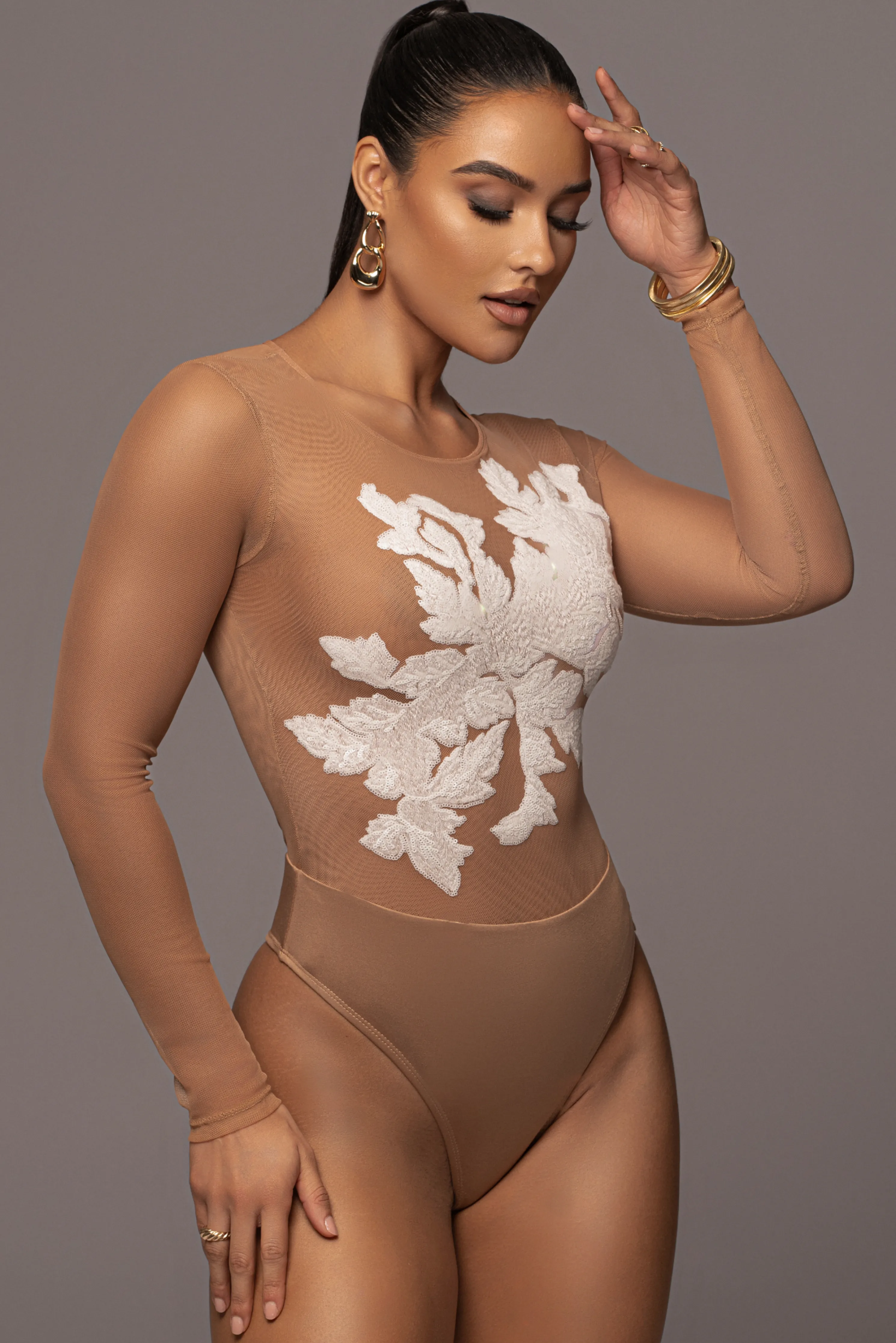 Stand out from the crowd in ourIvory Charmed Embroidered Mesh Bodysuit. A stunning sheer mesh overlay embellished with delicate floral embroidery covers this gorgeous long sleeve bodysuit. The lower waist of this bodysuit is composed of a smooth doubled lined material for extra comfort. Thong back bottom with double snap closure. Pair with our Edena Embroidered Midi Skirt for the full look. Double-lined with Stretch. Not sold as set.