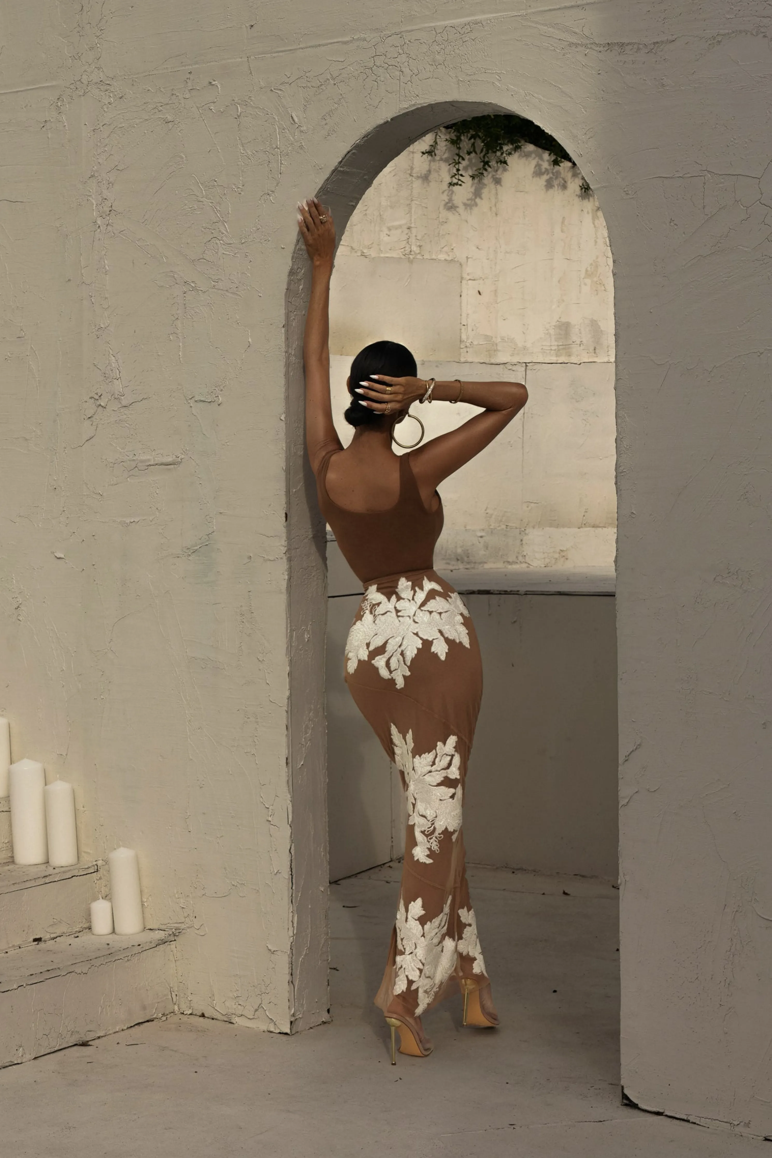 Embellishments are back in our Ivory Edena Embroidered Midi Skirt. Our latest midi skirt is embroidered with overlays of lovely floral embellishments throughout. A side zipper closure and low slit on one side finish the look. Pair with ourCharmedEmbroideredMesh Bodysuitfor the full look. Double lined with stretch. Not sold as set.