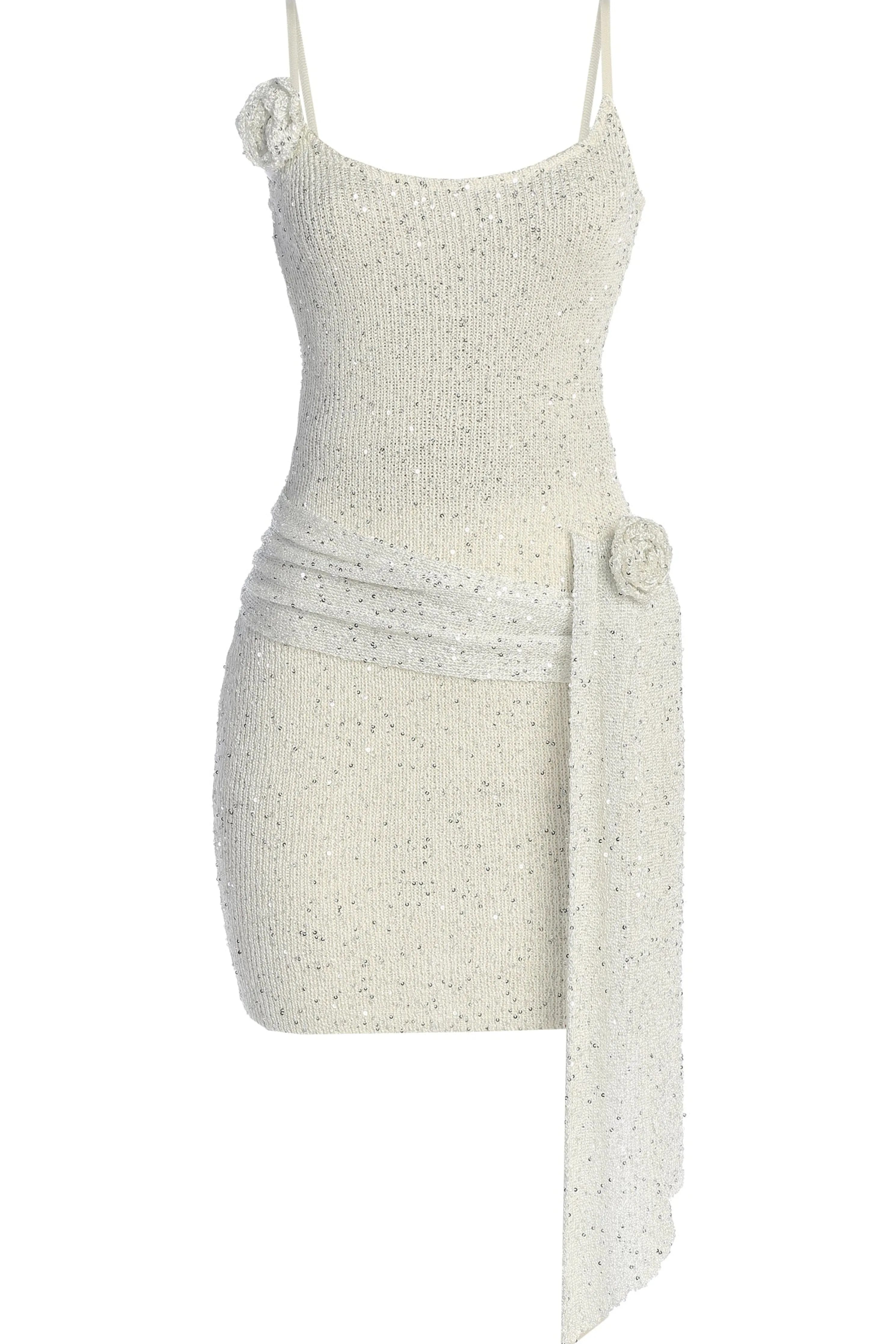 Add a touch of sparkle to everyday White Golden Dusk Sequin Dress. This statement mini dress features adjustable shoulder straps with a side drape and delicate rose appliqués that can be removed. Crafted from stunning sequin fabric with a lined interior, this dress is designed to make you feel like a work of art. Stretchy.