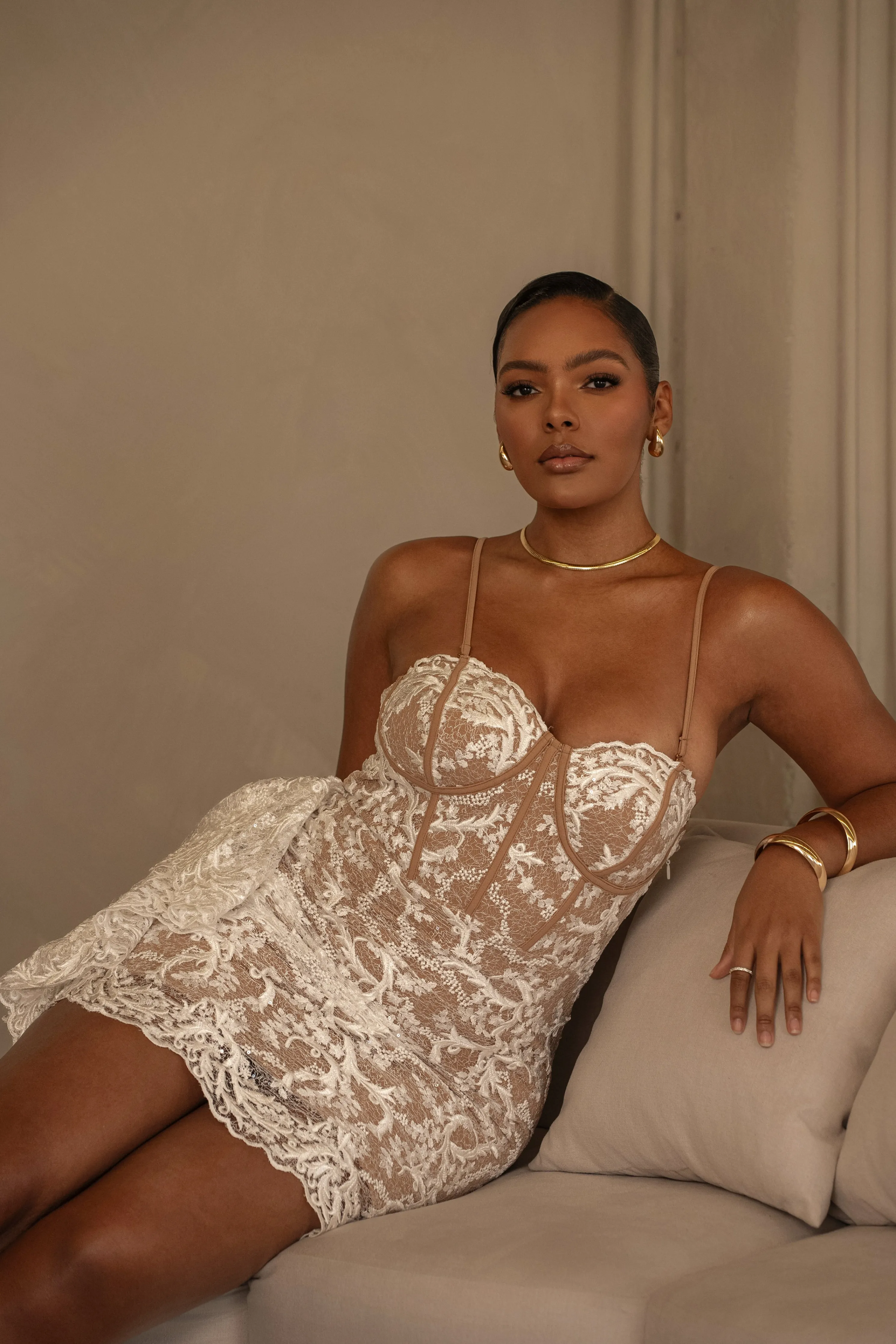 OurWhite Marilyn Lace Mini Dress features a corset-inspired design crafted from luxurious lace fabric with boning detail creating a structured silhouette with a ruffled side drape adding a feminine touch. Featuring padded cups, grip silicone at the bust for added support, and adjustable/removable shoulder straps for a versatile strapless styling option.Hidden side zipper closure. Double lined. No Stretch.