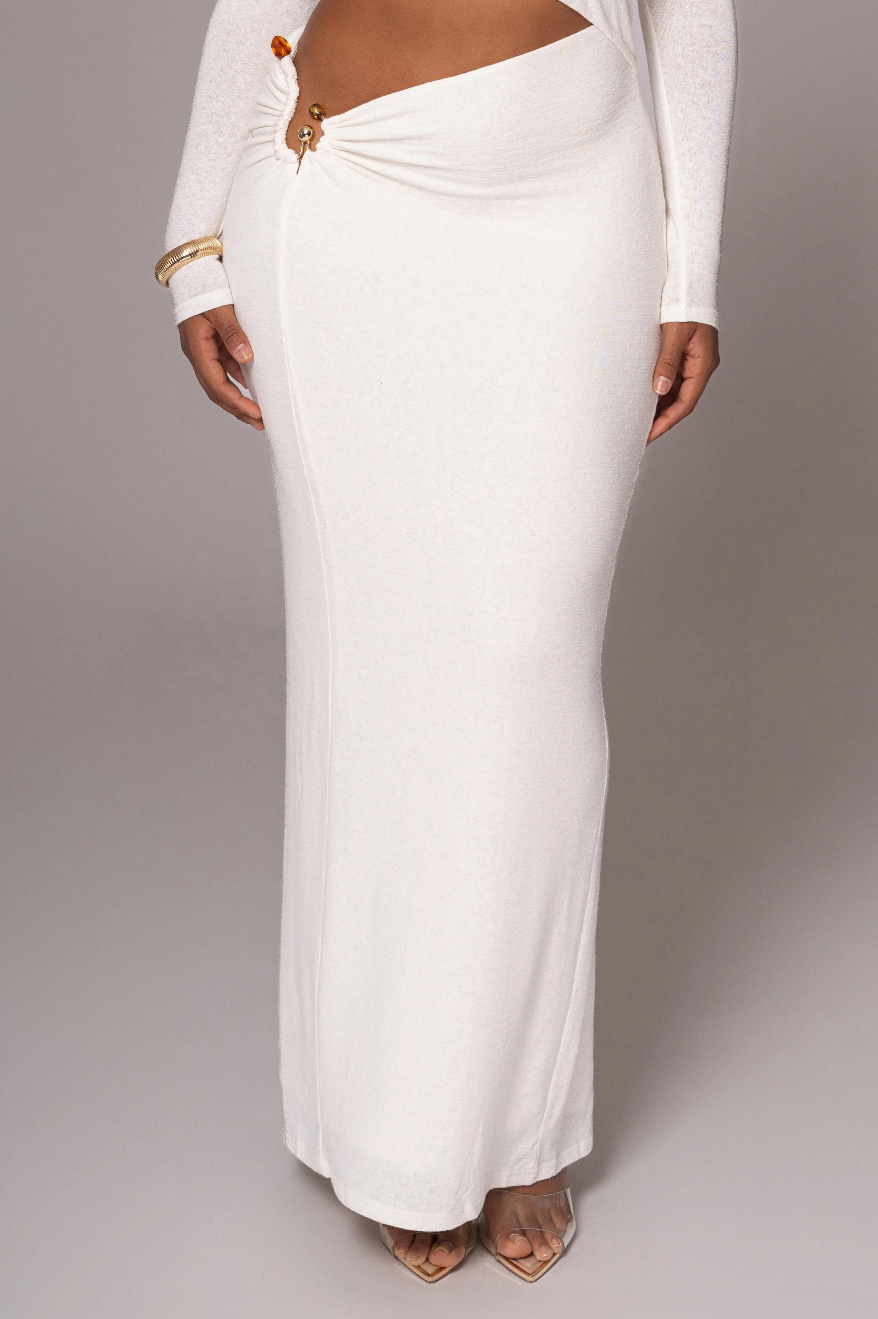 Experience the height of Fall elegance with our new White Summer Romance Cutout Dress. This long sleeve dress features a fitted silhouette that flatters your figure, while the center cutout adds a touch of allure. A gold-tone embellishment with acrylic stones at the side hip brings a unique and sophisticated edge. Crafted from a jersey knit fabric for quality and comfort. Complete with a back neck keyhole and a hidden side zipper closure for a seamless finish. Back slit hem. Double lined with medium stretch.