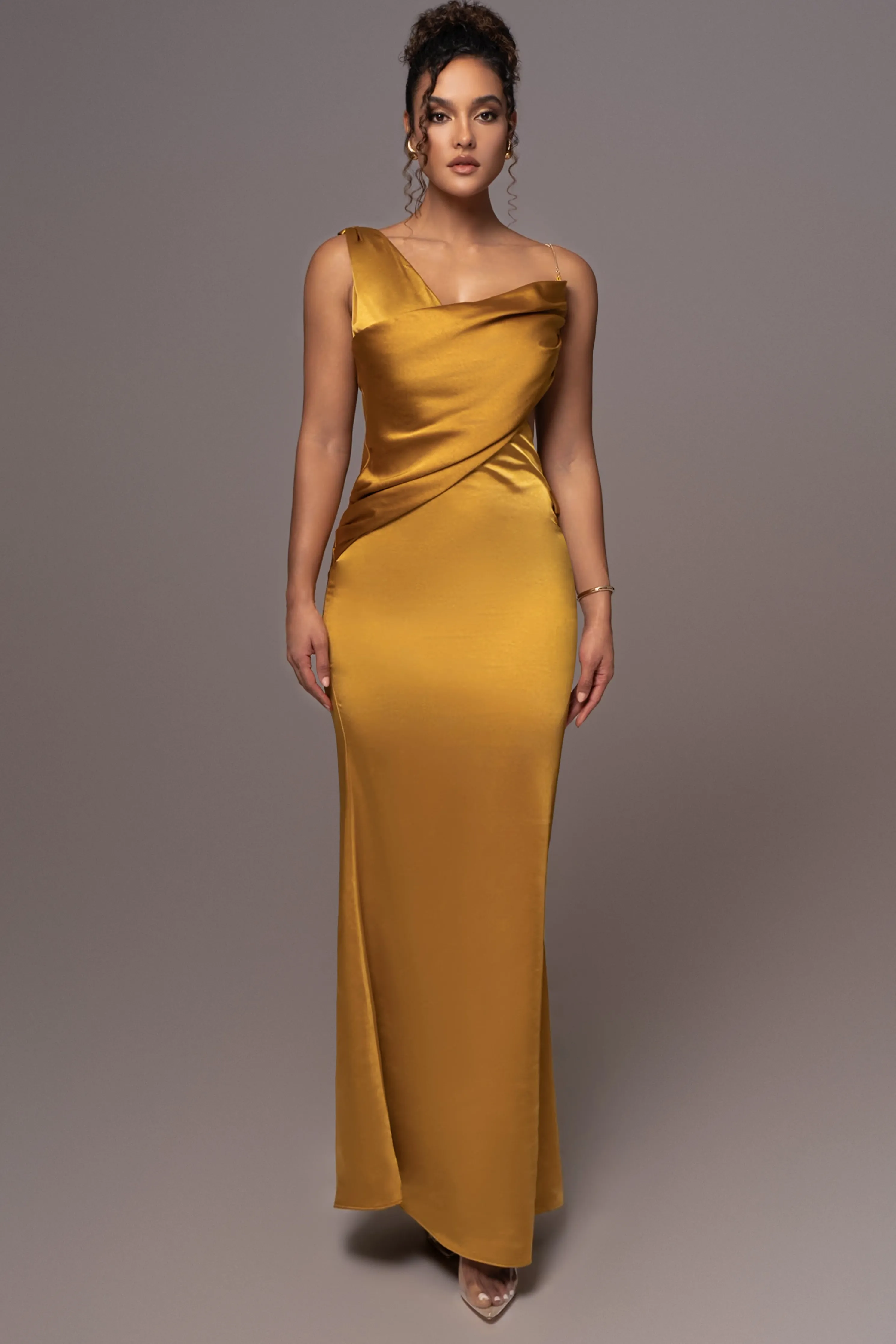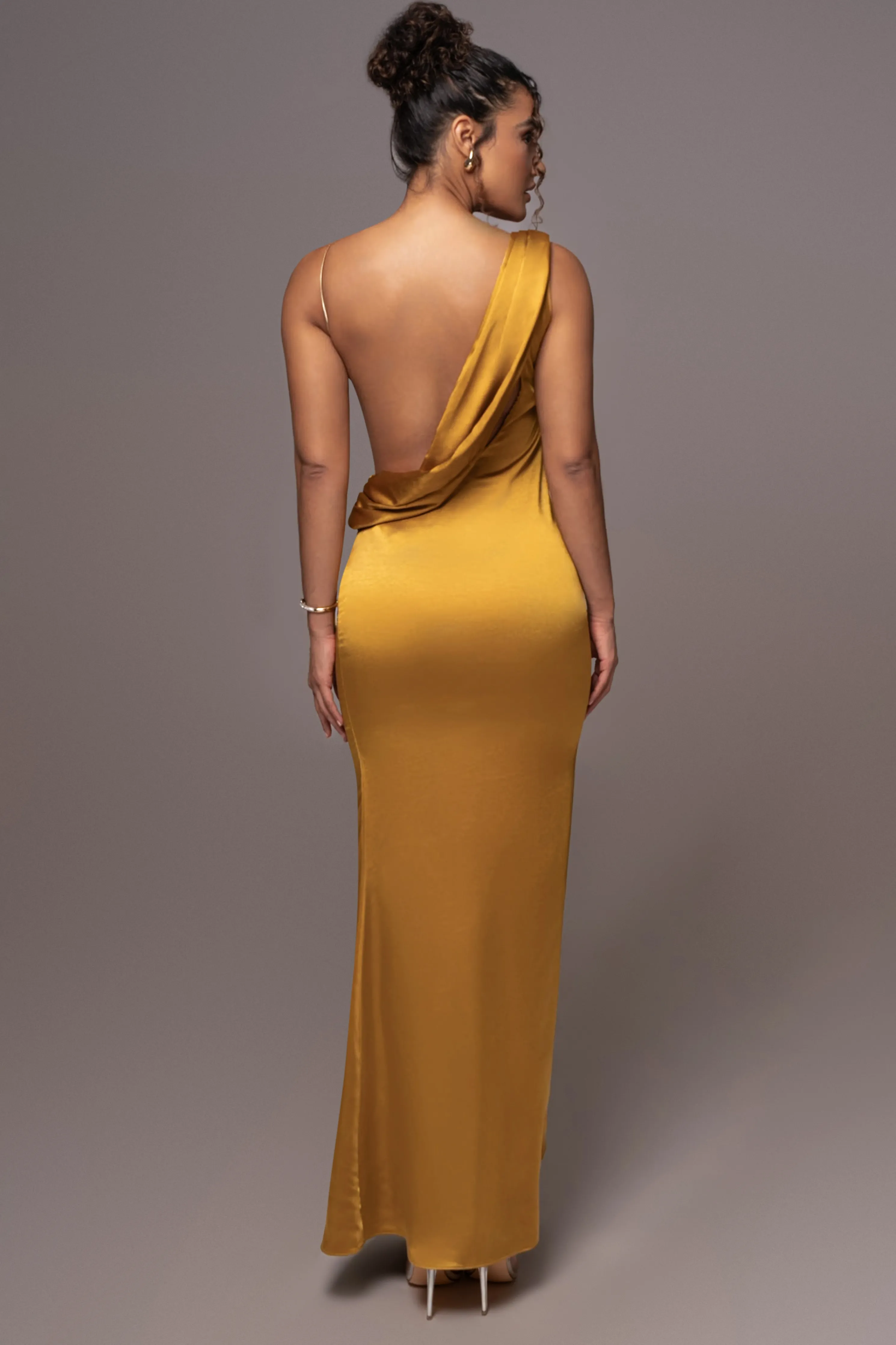 Introducing theYellow Satin Belle Maxi Dress, crafted from stunning satin fabric thatexudesshimmer and shine. This stunning maxi dress boasts a draped shoulder and an alluring open back, effortlessly achieving a fitted silhouette that flows into a mermaid hem. Gleaming gold-tone straps adorn one shoulder for extra elegance. Hidden side zipper. Double lined. No Stretch.