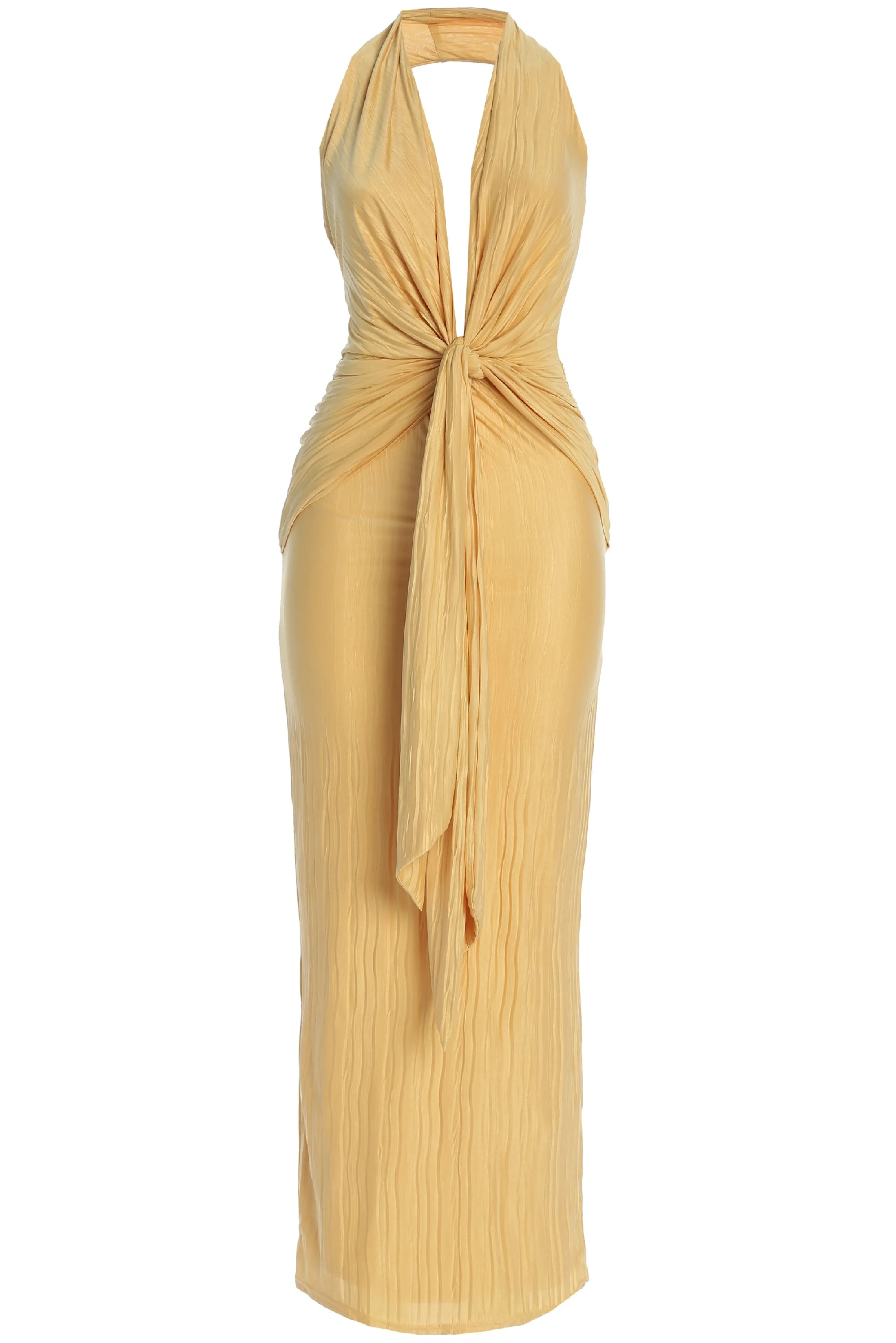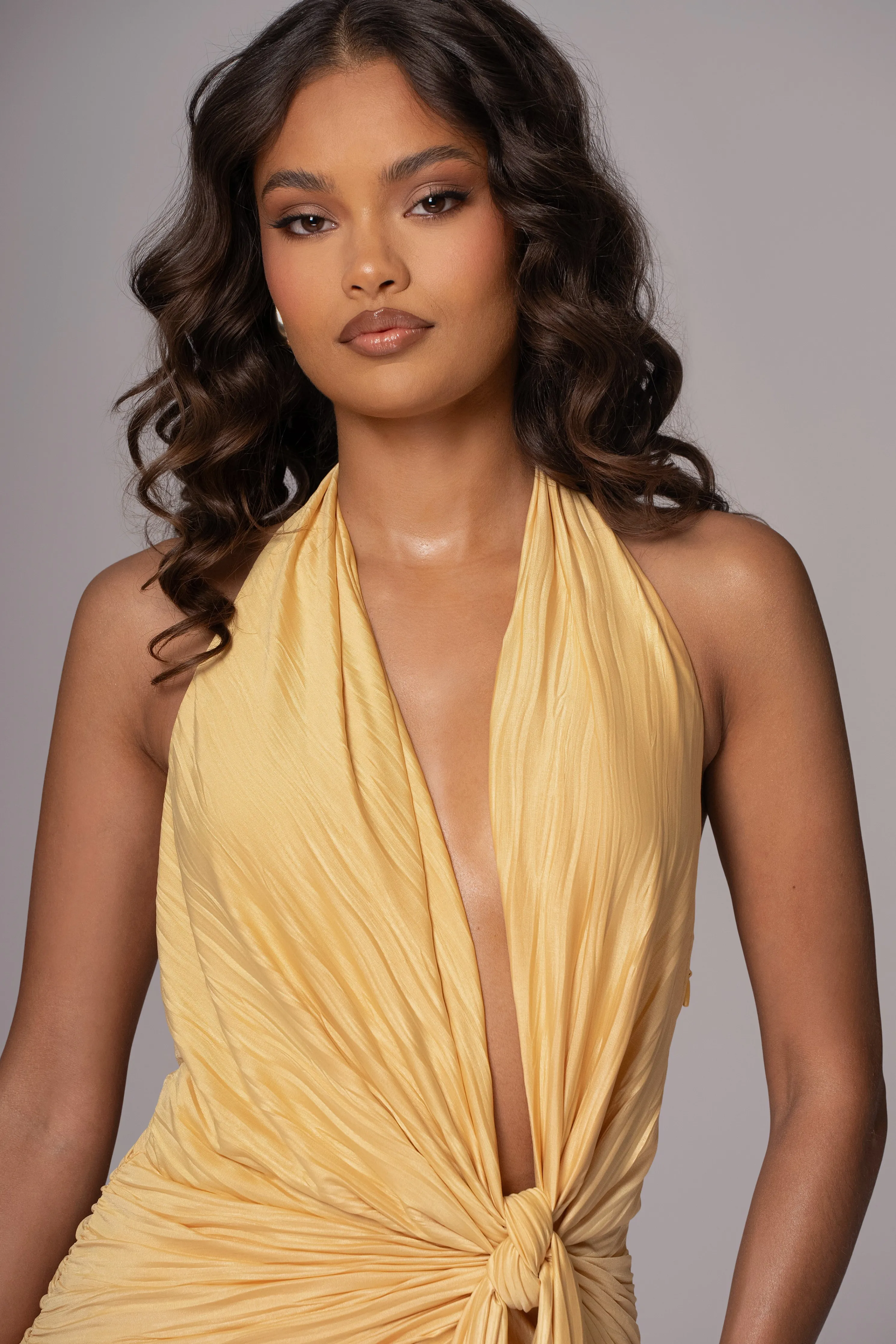 Introducing our Yellow Under The Moonlight Drape Dress, a stunning maxi dress that will make you stand out under the moonlight. Made with a lightweight crinkled fabric, this elegant maxi dress features a plunging halter neck, center gathering with a drape, and hidden side zipper closure. Complete with non-slip gel grip at the lower back and double lining for a luxurious and comfortable fit. Stretchy.
